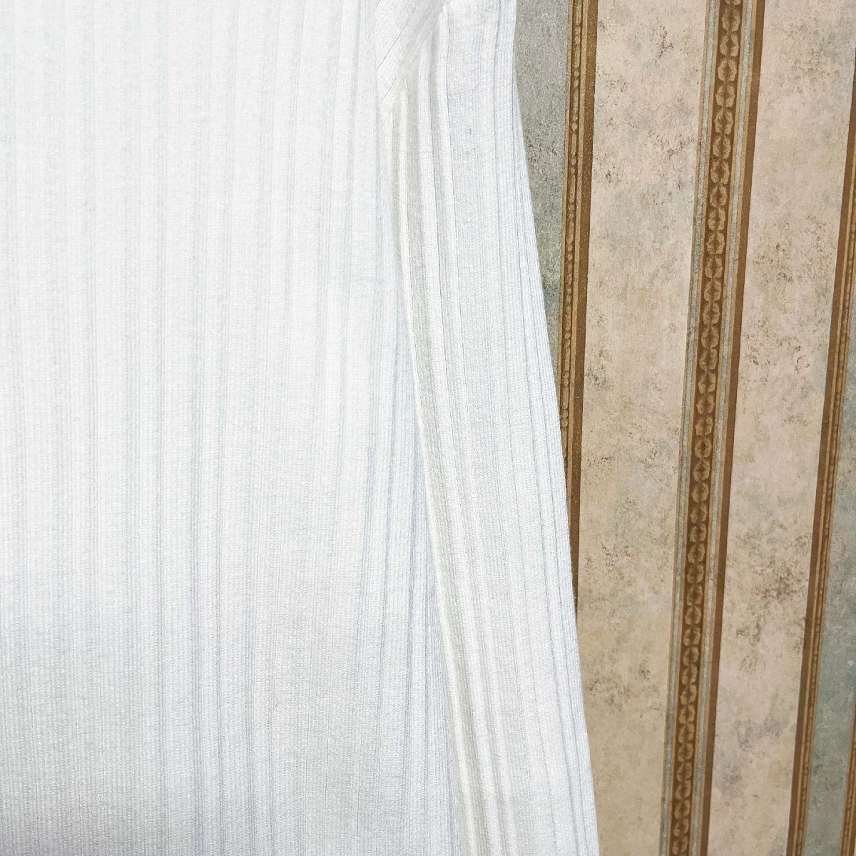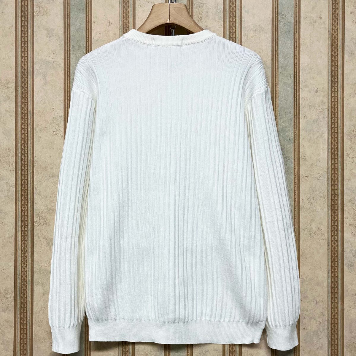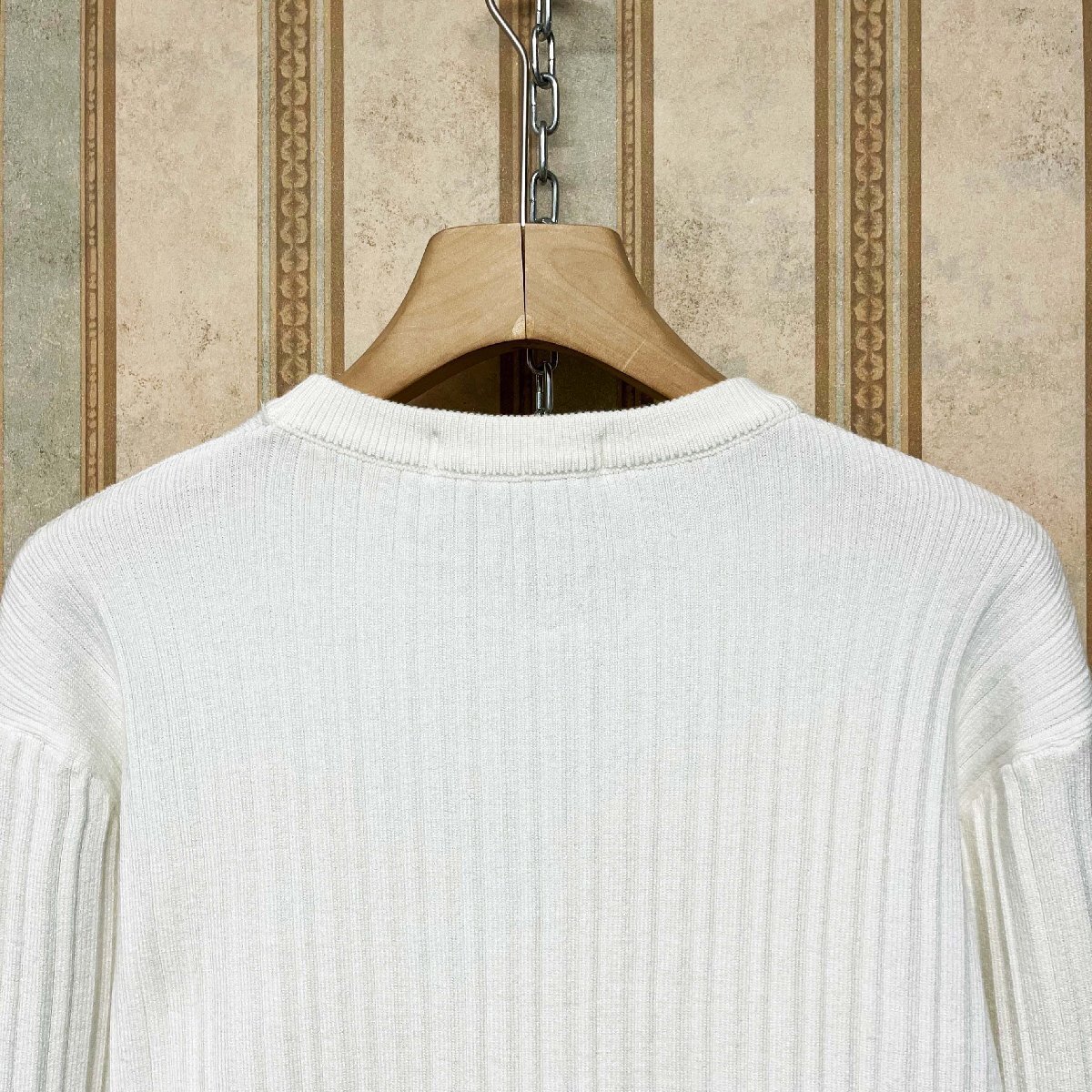 シンプルな無地タイプで、着回しやすさは抜群。襟元はベーシックな丸首仕様で、首元がすっきり見えるだけでなく、インナーとのレイヤードも楽しめます。全体に施された立体的なリブ編みデザインがポイント。単調になりがちな無地ニットに、ほどよい表情を加えてくれます。