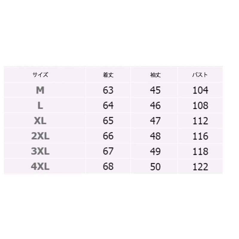 M 着丈63、袖丈45、バスト104(OK) L 着丈64、袖丈46、バスト108 XL 着丈65、袖丈47、バスト112 2XL着丈66、袖丈48、バスト116 3XL着丈67、袖丈49、バスト118 4XL着丈68、袖丈50、バスト122