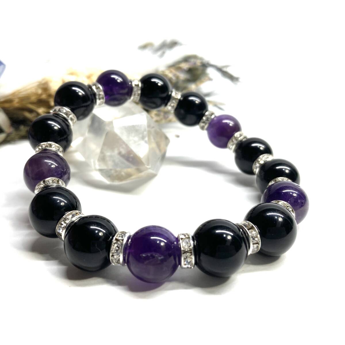 こちらは、モリオンとアメジストを組み合わせたパワーストーンブレスレットです。間にはロンデルを挟み高級感あるデザインに仕上げております。程よくインパクトがある12mm玉を使用して内周約18cmです。(サイズ変更の場合は取引ナビにてご連絡をお願いします。) 数に限りがございますので気になる方はお早めにどうぞ。