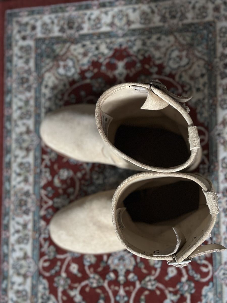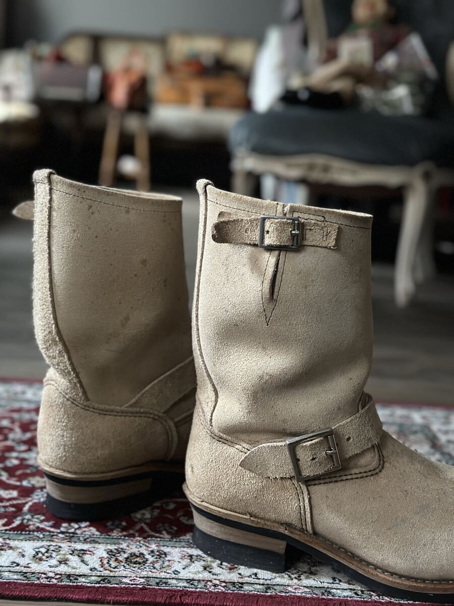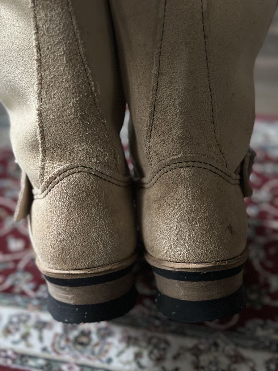 スエード素材のベージュエンジニアブーツ、バックル付きでスタイリッシュ。