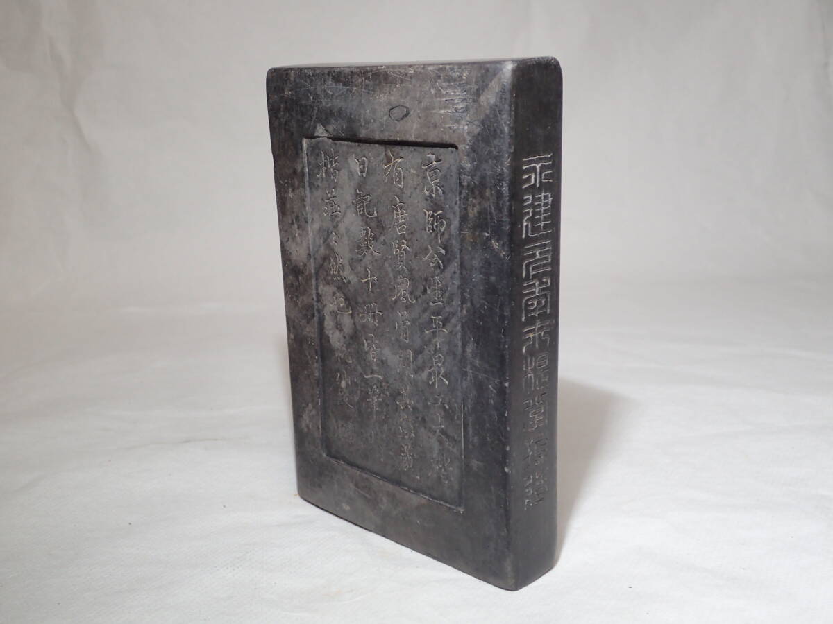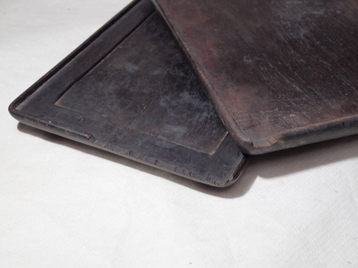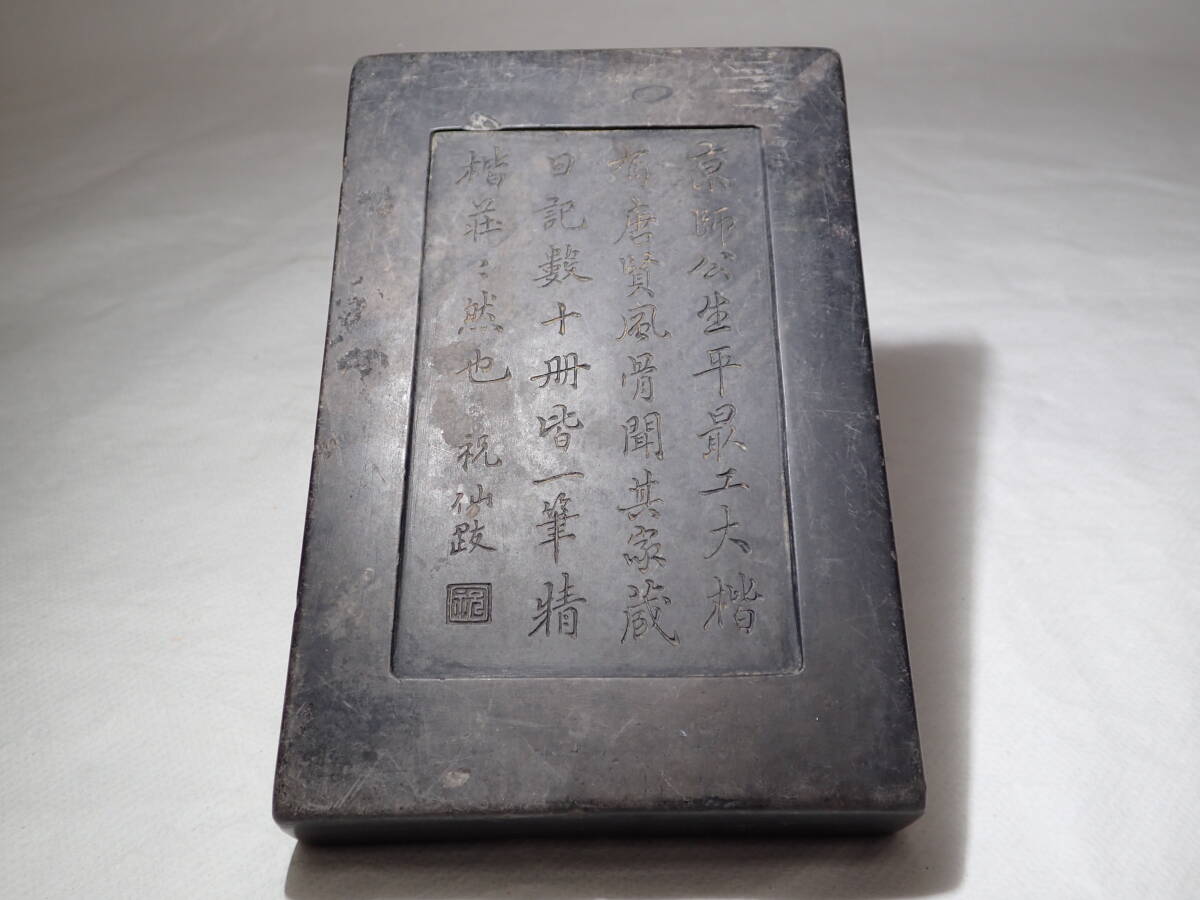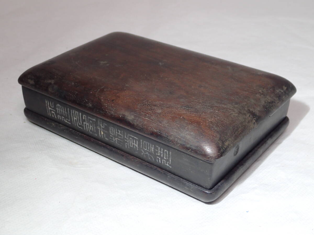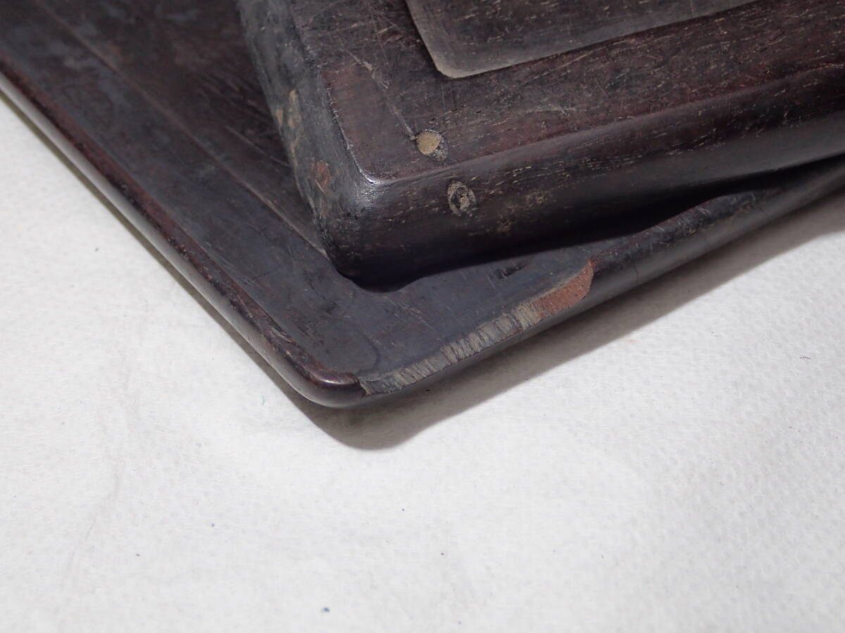 ・硯の裏に漢詩、側面に銘があります。 ・硯には窪み、シミ、汚れ、アタリがあり、 蓋と台座にはカケがありますので、 ご承知の上、入札をお願いします。 16.3cmx10.8cmx厚さ2.5cm ヤフオクだけの出品、他サイトには出品してません。
