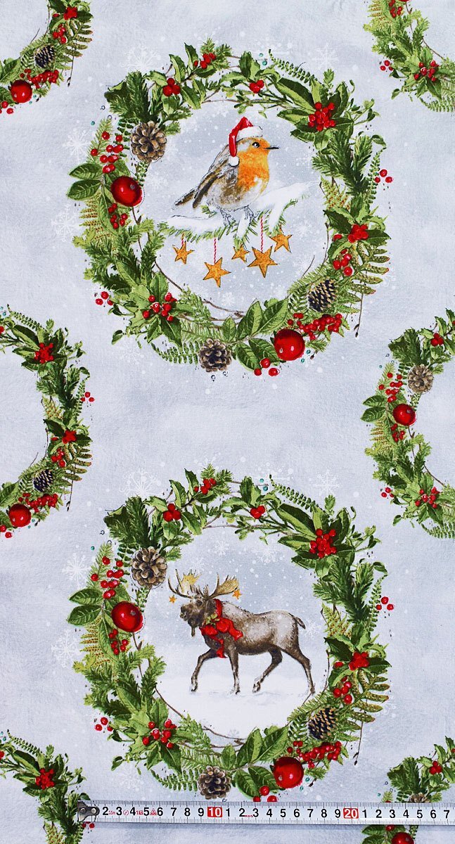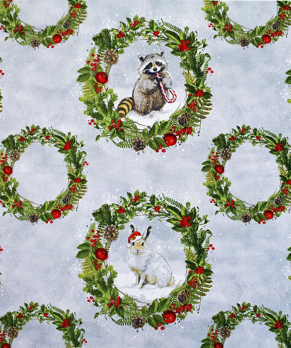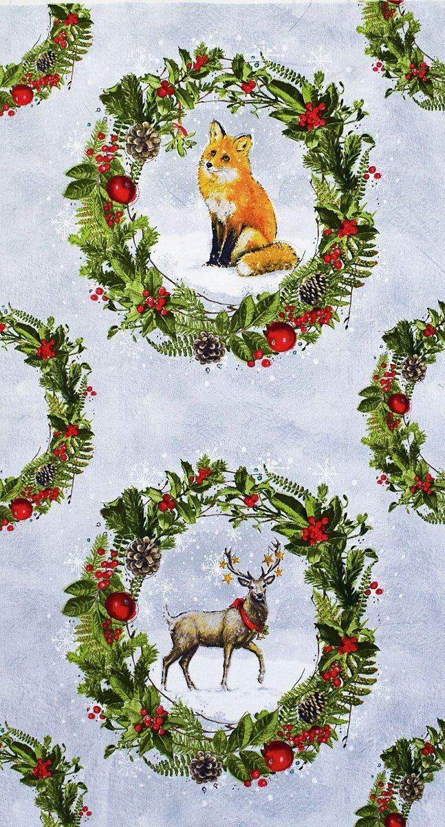 トナカイ、小鳥、アライグマ、ウサギ、キツネ、鹿がモチーフのクリスマス・リースのパネル。
