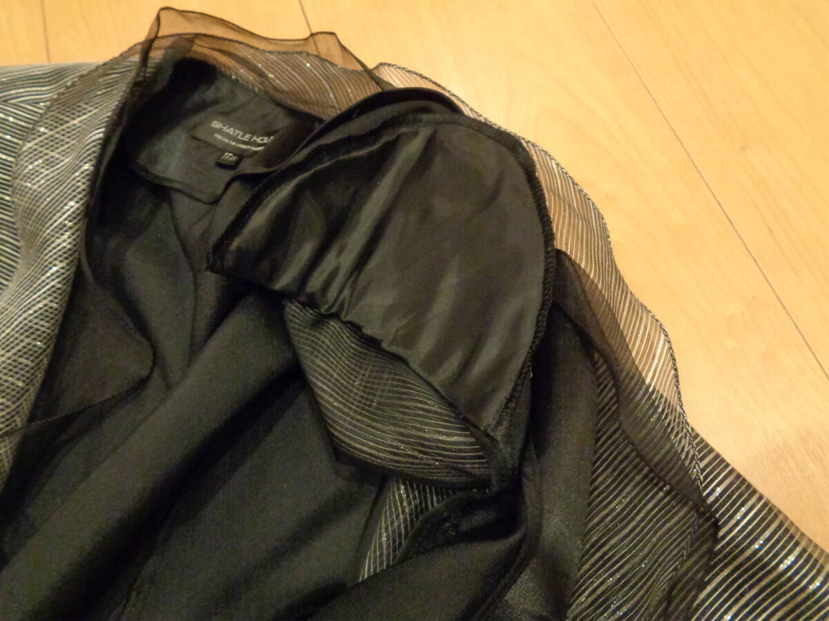 肩パッドはついてますが、糸で軽くついているので外すのは容易にできます。袖にはシースルーの裏地がついており、本体は袖よりも厚手の裏地がついてます。