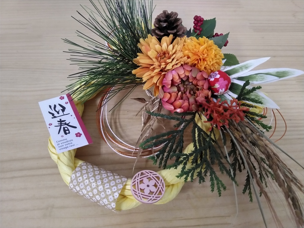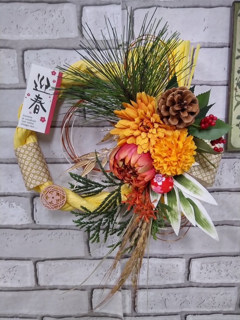 【迎春】★しめ縄飾り オリジナル 花しめ縄★ハンドメイドのお正月飾り★リースタイプ★