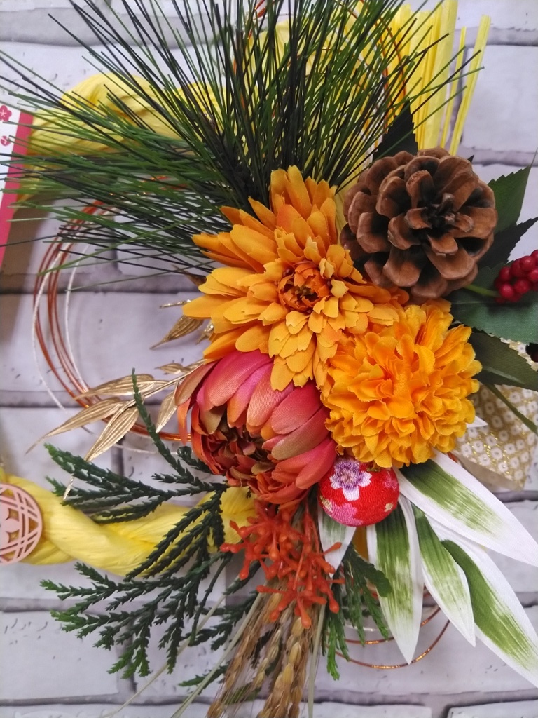 イエローカラーの縄をベースに、オレンジのマムをメインにした、しめ縄飾りです。