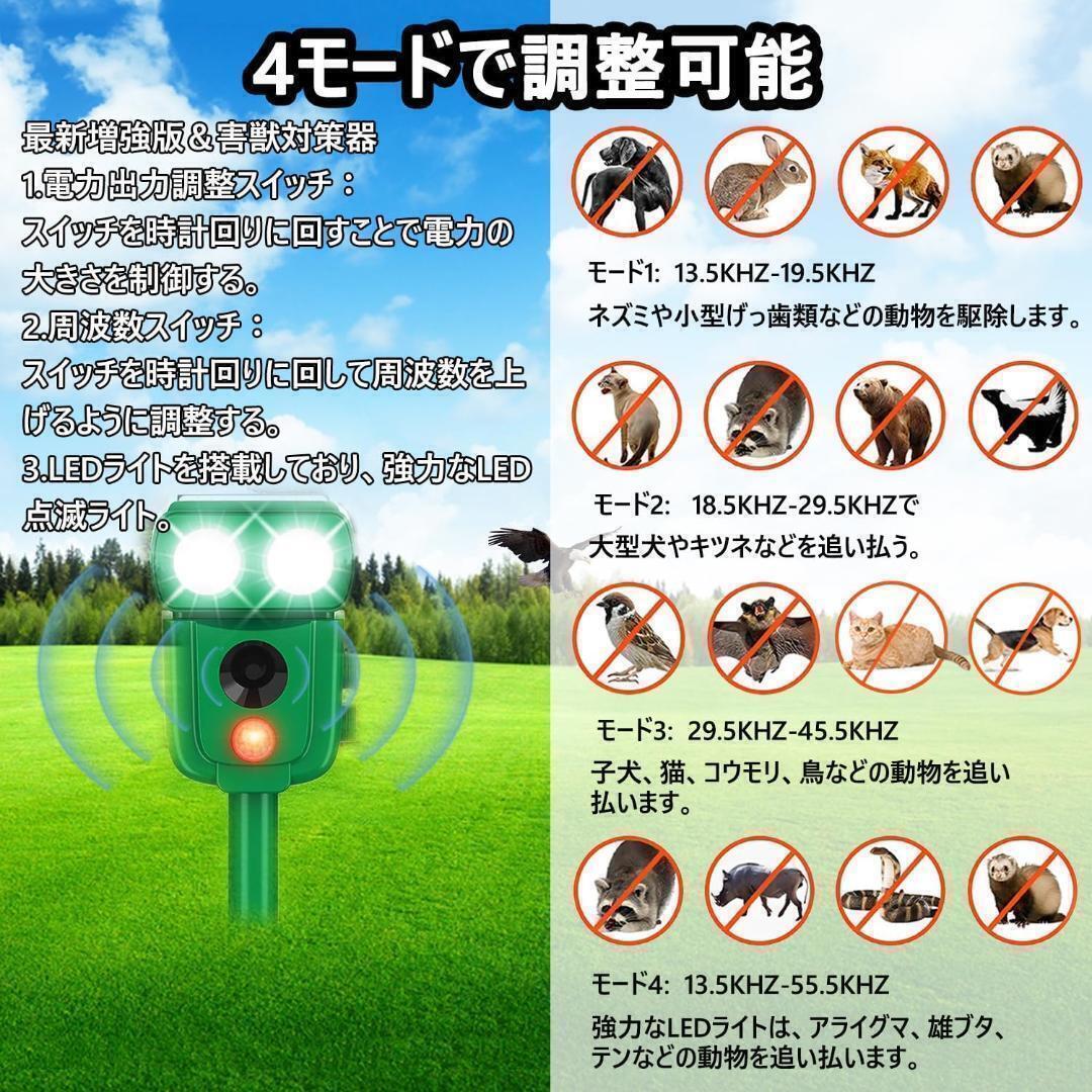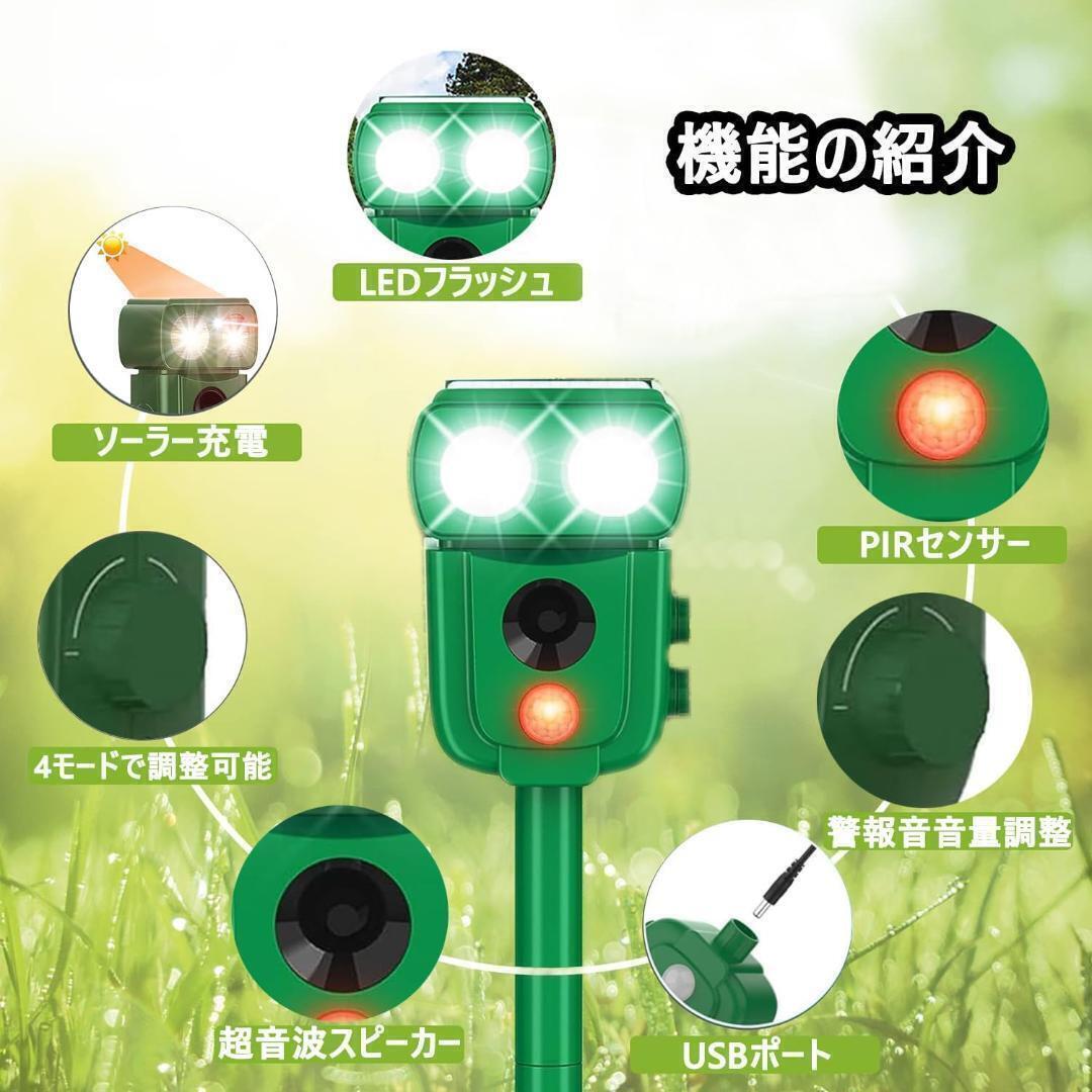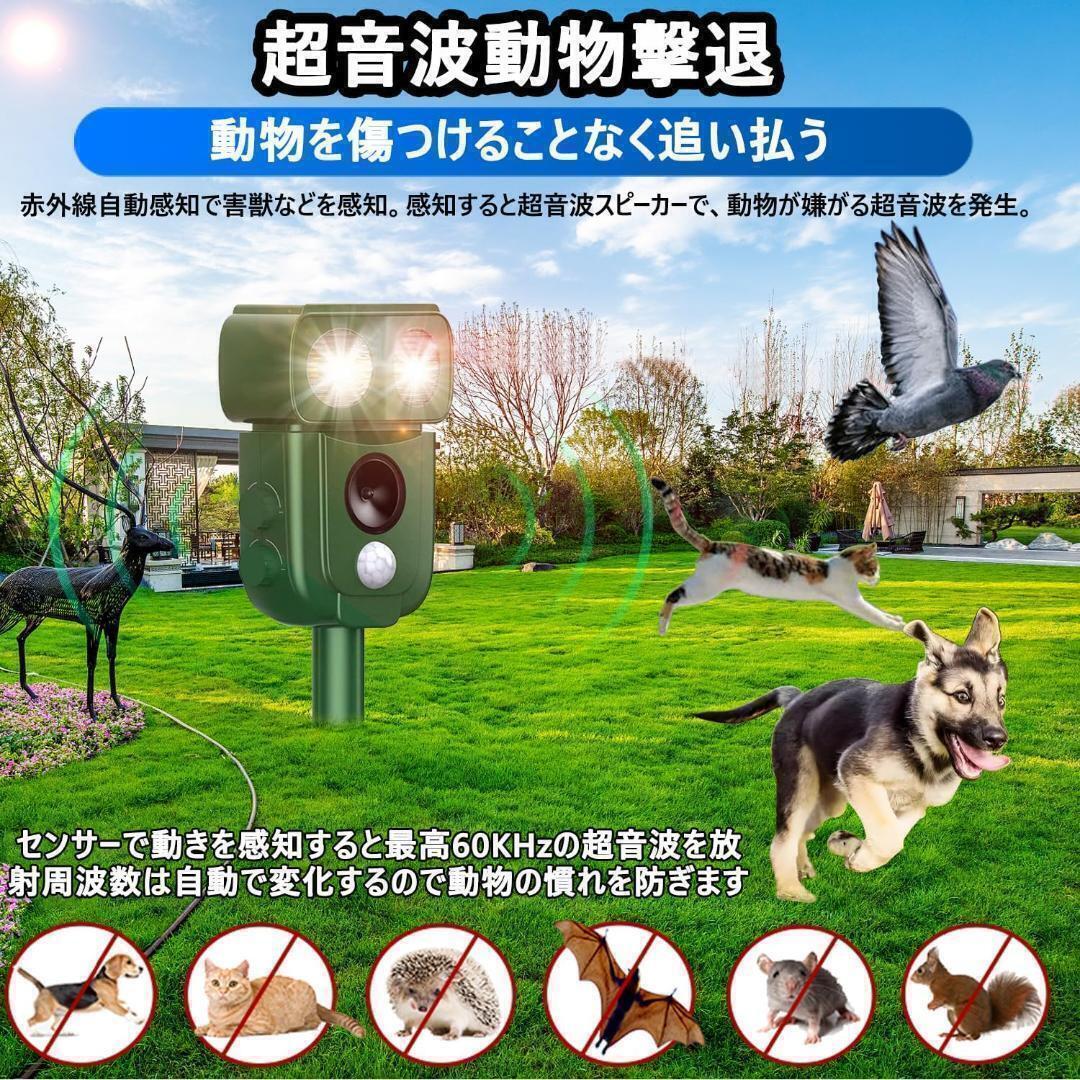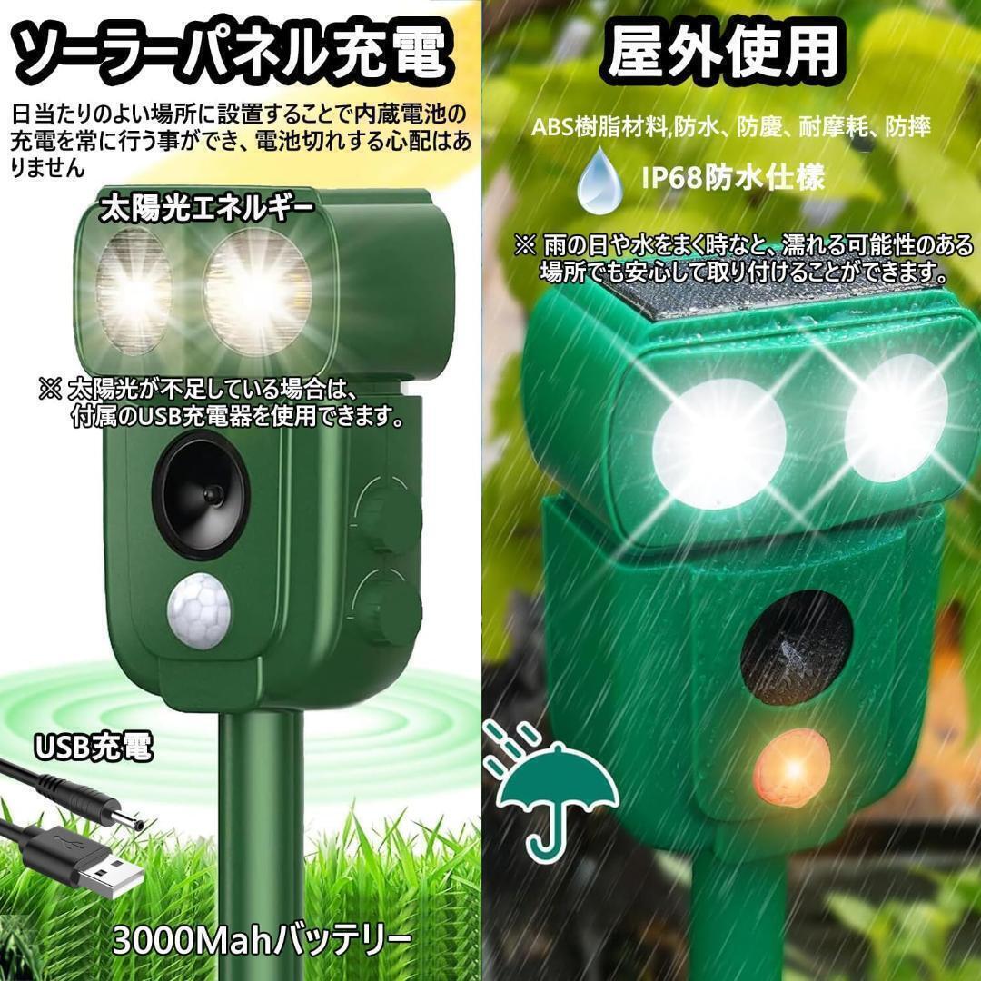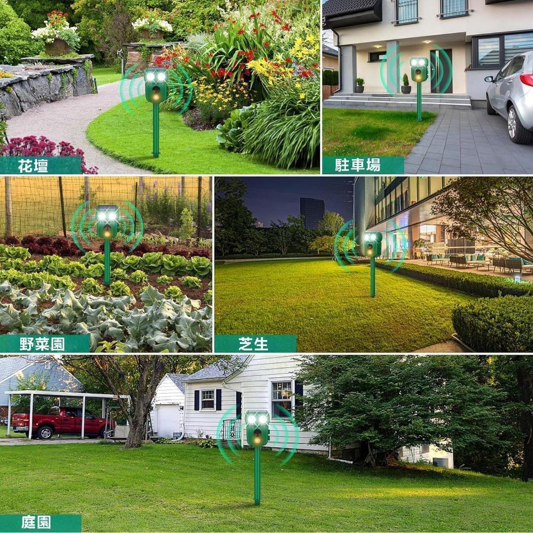 xunbida 動物撃退器 猫よけ【2025アップグレード版・害獣対策器】超音波 警報音 鳥よけ 動物撃退機 害獣撃退 猫退治 犬よけ ネズミ除け 3000mAh大容量&超長待機 USB充電&ソーラー充電 IP68防水 5つ撃退モード 赤外線センサー LED強力フラッシュライト 120° 12m感知範囲 畑/庭保護 日本語取扱説明書付D22【自動感知&害獣対策器】 赤外線自動感知で害獣などを感知。感知すると超音波スピーカーで、動物が嫌がる超音波を発生。動物は機械に慣れるという特性がありますが、当製品は揺らぎのある超音波で、厄介な動物慣れを防ぎます。最新進化版の動物撃退器は赤外線感知センサー面積と超音波周波頻度、LED強フラッシュの改良により、検知範囲が広くなり、対応動物種類も増え、退治効果も増強できました。動物愛護の観点から作られた撃退器です。動物を傷つけずに追い払うことができます【広いセンサー範囲&感知距離調節】 従来の猫よけ比べて、赤外線自動感知センサーの範囲は左右角度120度、上下角度55度まで増加し、直線最長約8-12m感知可能。5つの撃退モードで、実際の使用範囲に合わせて感知距離と超音波の強みを調節できます。ストレスなく花壇・庭・駐車場など色々な場所で活躍できます。コンパクトで目立ちませんし、景観を壊しません。ネズミ、モグラ、ドブネズミ、犬、猫、コウモリ、鳥、キツネ、アライグマ、ノイシシ、イタチなどの動物が撃退できます。わずか3週間ぐらいで動物の糞尿、食害、騒音、足跡などの悩みから解放されます。【超音波&LEDライトで動物を撃退】この害獣撃退器は広範囲超音波とLEDフラッシュ組み合わせた総合5つのモードがあります、周波数は13.5kHz 〜55.5 kHzの広い範囲、多種類の動物を対応して撃退できます。LEDライトを搭載、超音波の特定の周波数に適応してしまい受けにくくなる有害動物も、強力なLED点滅ライトとで効果的に追い払います。また、感度調整のダイヤルもあり、場合によって調整できます。超音波センサーのため、少し音が聞こえます。人と動物に無害ですが、室外に置いた方をおすすめいたします。【2つの充電方法&IP68防水】ソーラーパネル式の充電方法の搭載により、基本的に外に置くだけで害獣を撃退してくれます。3000Mahバッテリーを内蔵、電池交換不要、超長時間作動できます。曇りや雨の日があっても、USBケーブルに繋げて充電できます。2-3時間で充電完了、一回フル充電で1ヶ月程に使用可能です。長時間IP68級の防水効果を備え、梅雨など連日の雨の日でも、 鳥よけや猫除け対策としてご利用いただけます。(長くお使いいただくために、台風や大雨などの悪天候の際には屋内保管推奨。)【設置簡単&差し込み&壁掛け両用】このネズミ撃退器は2つの使用方法を持ちます。まず、差し込む杭が付属しておりますので、本体と付属する杭を組み立てて、置きたい場所に差し込むだけ、地面に差し込むと壁にかける二つの取付方法ができます。また、コンパクトで持ち運びに便利のため、花壇、庭、畑など様々な場所で活躍します。 また、照度検知器を内蔵し、夜間で自動的に起動します。夜でもお客さんの財産や家畜を守って、不必要な損失を避けます。【注意事項】「製品の白いカバー内部には、半分のスペースを占めるセンサー(感探)が設置されています。そのため、半分が黒、もう半分が赤に見えます。光が透過すると、この部分は半黒半赤に光ります。