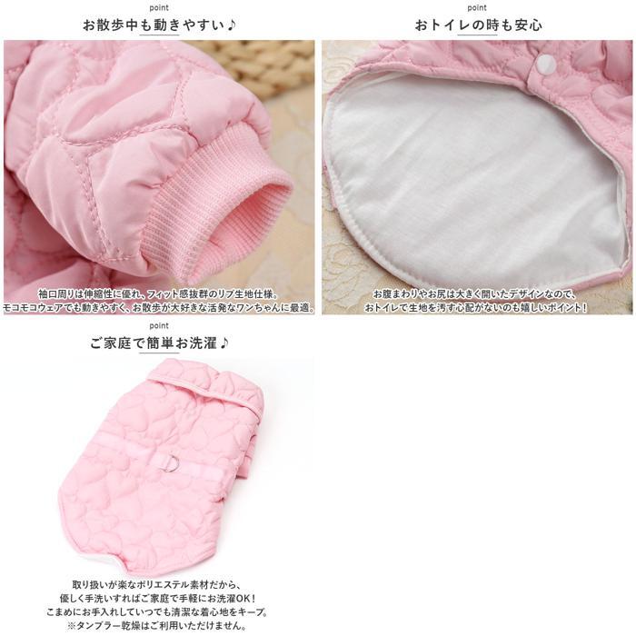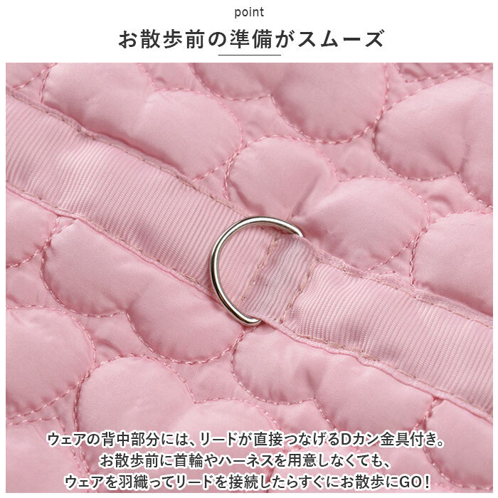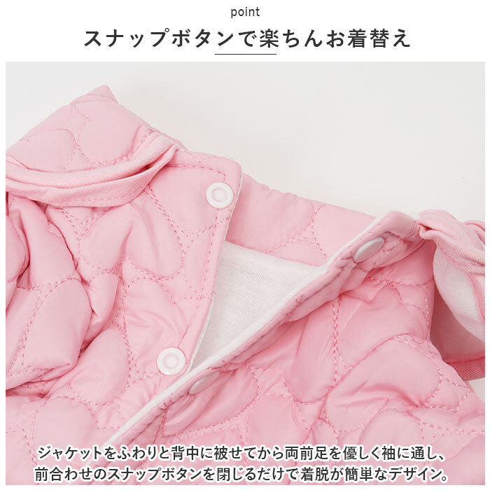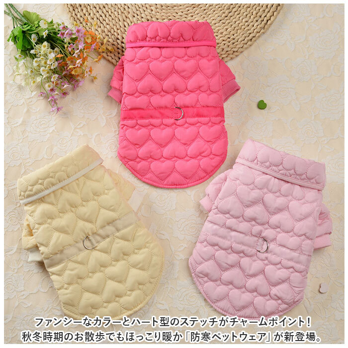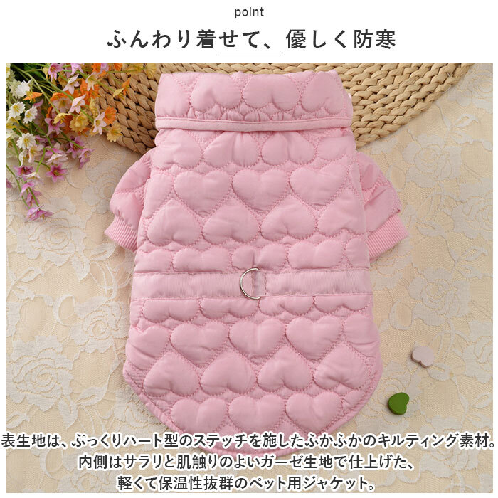 | 商品説明 | ・・ファンシーなカラーとハート型のステッチがチャームポイント!秋冬時期のお散歩でもほっこり暖か「防寒ペットウェア」が新登場。 ・【ふんわり着せて、優しく防寒】 ・表生地は、ぷっくりハート型のステッチを施したふかふかのキルティング素材。内側はサラリと肌触りのよいガーゼ生地で仕上げた、軽くて保温性抜群のペット用ジャケット。 ・【スナップボタンで楽ちんお着替え】 ・ジャケットをふわりと背中に被せてから両前足を優しく袖に通し、前合わせのスナップボタンを閉じるだけで着脱が簡単なデザイン。 ・【お散歩前の準備がスムーズ】 ・ウェアの背中部分には、リードが直接つなげるDカン金具付き。お散歩前に首輪やハーネスを用意しなくても、ウェアを羽織ってリードを接続したらすぐにお散歩にGO! ・【お散歩中も動きやすい♪】 ・袖口周りは伸縮性に優れ、フィット感抜群のリブ生地仕様。モコモコウェアでも動きやすく、お散歩が大好きな活発なワンちゃんに最適。 ・【おトイレの時も安心】 ・お腹まわりやお尻は大きく開いたデザインなので、おトイレで生地を汚す心配がないのも嬉しいポイント! ・【ご家庭で簡単お洗濯♪】 ・取り扱いが楽なポリエステル素材だから、優しく手洗いすればご家庭で手軽にお洗濯OK!こまめにお手入れしていつでも清潔な着心地をキープ。(※タンブラー乾燥はご利用いただけません。) ・【ピッタリサイズをチョイス!】 ・XSサイズからXLサイズまでの5つのサイズから、ぴったりサイズがチョイス可能!超小型犬から、胴回り50cm程度までの中型のワンちゃんに最適なサイズ感。小さなサイズはネコちゃんにもオススメ。 ・【オシャレなお散歩コーデに】 ・ペットとの暮らしを優しく彩る、ポップなパステルカラーのバリエーション。首元のリボンをキュッと蝶結びにしたら、おしゃまなワンちゃんのお出掛けコーデが完成! ・【ルームウェアにも◎】 ・肌寒さが気になる季節のお散歩用ウェアとしてはもちろん、ルームウェアやパジャマとして、朝晩の冷え込み対策にもオススメ。 |