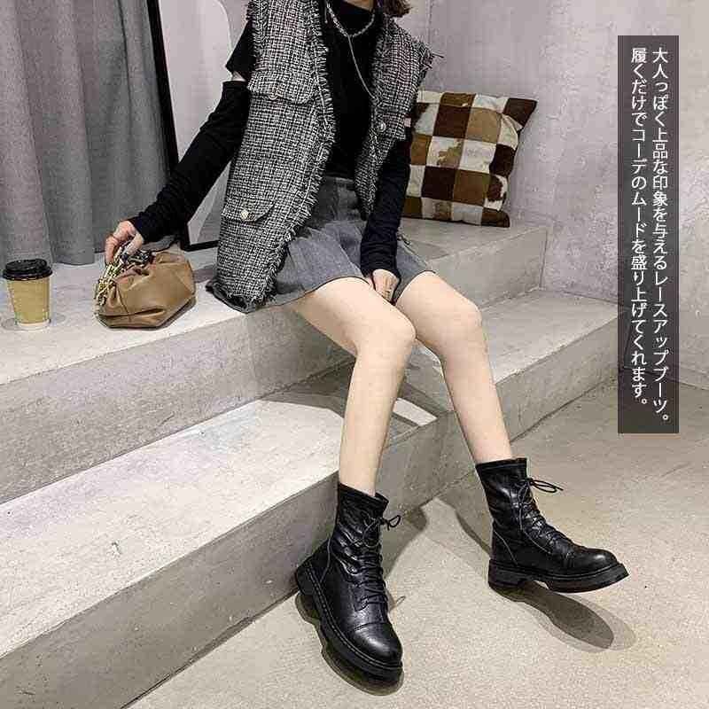 レディース 靴 ブーツ レースアップ 紐 太ヒール ミドル レザー調 ハーフ ローヒール 美脚 39 裏起毛