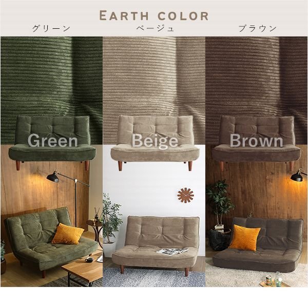 | 【カラー】 ベージュ、ブラウン、グリーン、ネイビー、レッド、イエロー 【サイズ】 W121×D78-122×H33.5-82cm 【重量】 17kg 【素材】 側生地:コーデュロイ=ポリエステル91%、ナイロン9% 構造部材:スチールパイプ、ポケットコイルスプリング 中身:ウレタンフォーム 【梱包】 サイズ:117×70×50cm、重量:18kg 【完成品】 脚のみ取付けです。 【ご注意】 ・サイズ、重量は概算です。 ・商品カラーはご使用のモニターによって実際の明るさや色と異なって見える場合がございます。 |