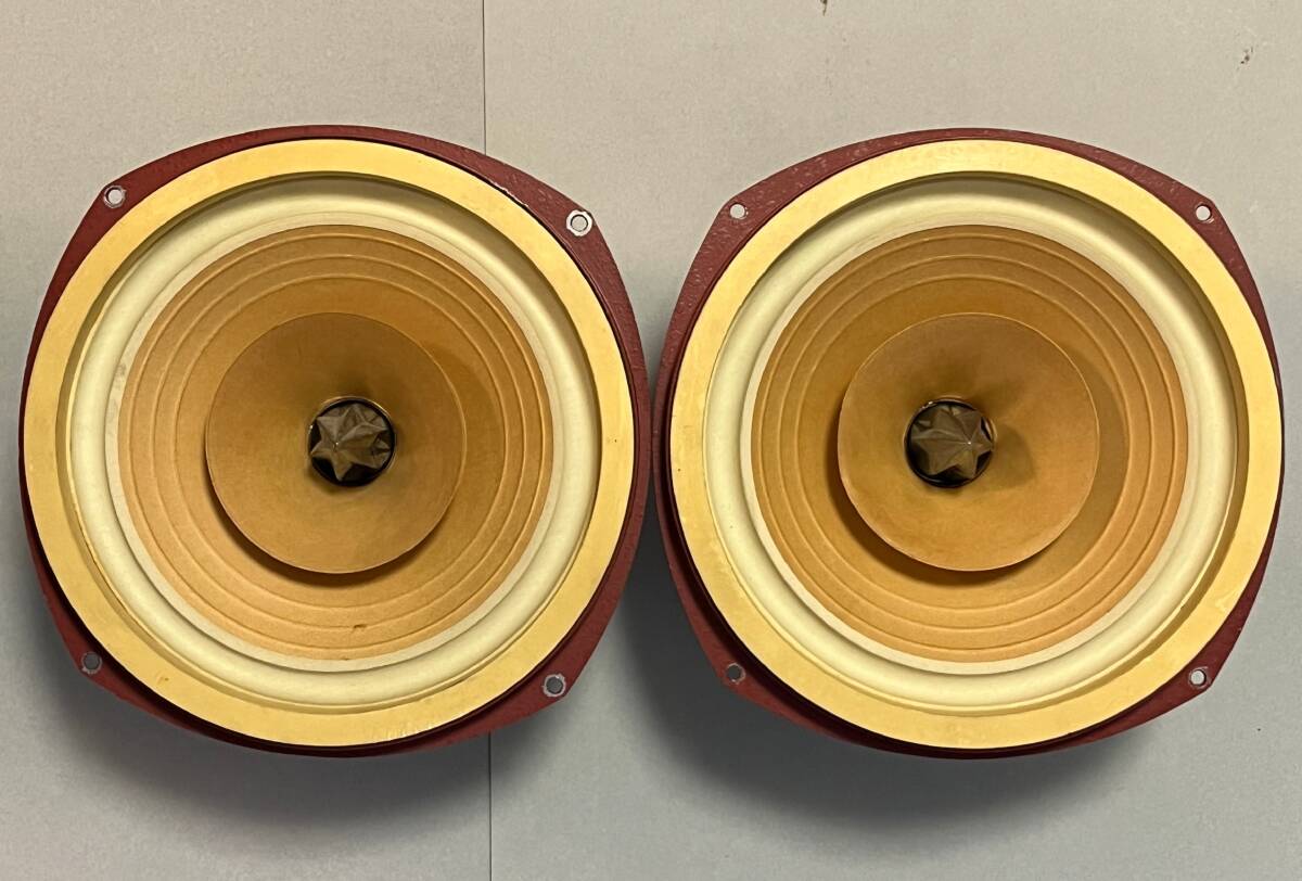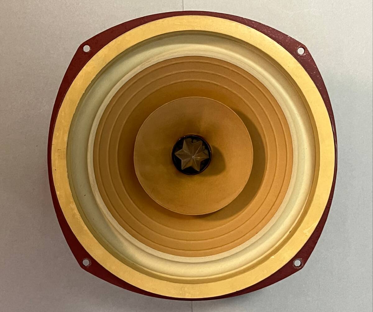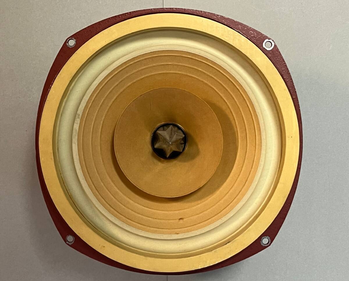 購入当時は、コーン紙は薄いレモン色が鮮やかだった記憶がありますが、画像1,2,3のとおり経年による退色により表面は茶色見を帯びています.また、薄い汚れ、くすみがあります.
