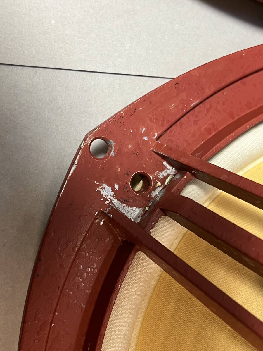 これはエンクロージャーから取外した際に付着したペンキを除去したときに、塗装が剥落したものです.
