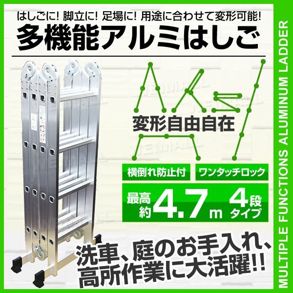 はしごとして、脚立として、そして作業時の足場としても利用できるマルチなハシゴです。 大掃除に雪下ろし、ガーデニングや洗車にも! 一家に一台あると便利なはしごです。 ◎はしごとして 雪下ろしに!高所作業に! 3段タイプは約3.7m、4段タイプは約4.7m、 5段タイプなら約5.7mの高さまで伸びます! ◎足場として はしごを壁に立てかけられない時は、断然足場スタイル。 洗車時、長時間の高所作業にもおすすめです! 作業台にもなります。 ◎脚立として 脚立としてご利用いただく場合は2パターンの設置方法が可能。 ◎作業台として 3段・4段タイプだと、台を置けばちょうど良い高さの作業台になります。 ◆便利・安心のワンタッチロック機構 ワンタッチ式ロック解除レバーを採用。レバーを解除して変形させると、一定の位置で自動的にカチッとロックがかかります。 ◆安定感抜群のスタンド付 底部には地面をしっかり捉える、横倒れ防止用の足がついていますので、安全に作業が行えます。 |