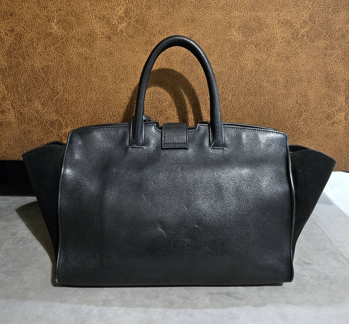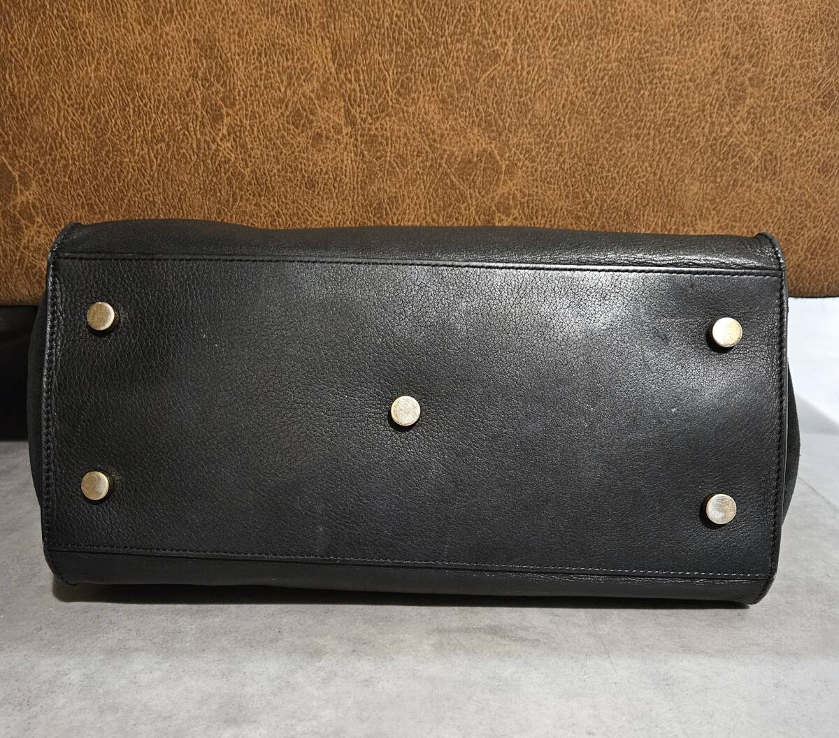 中古品の為、全体的な型崩れ、表面に微かなすれ、スエード部分に線の様に擦れた跡、ファスナーの部分に白いすれ、金具の小傷等、使用感があります。