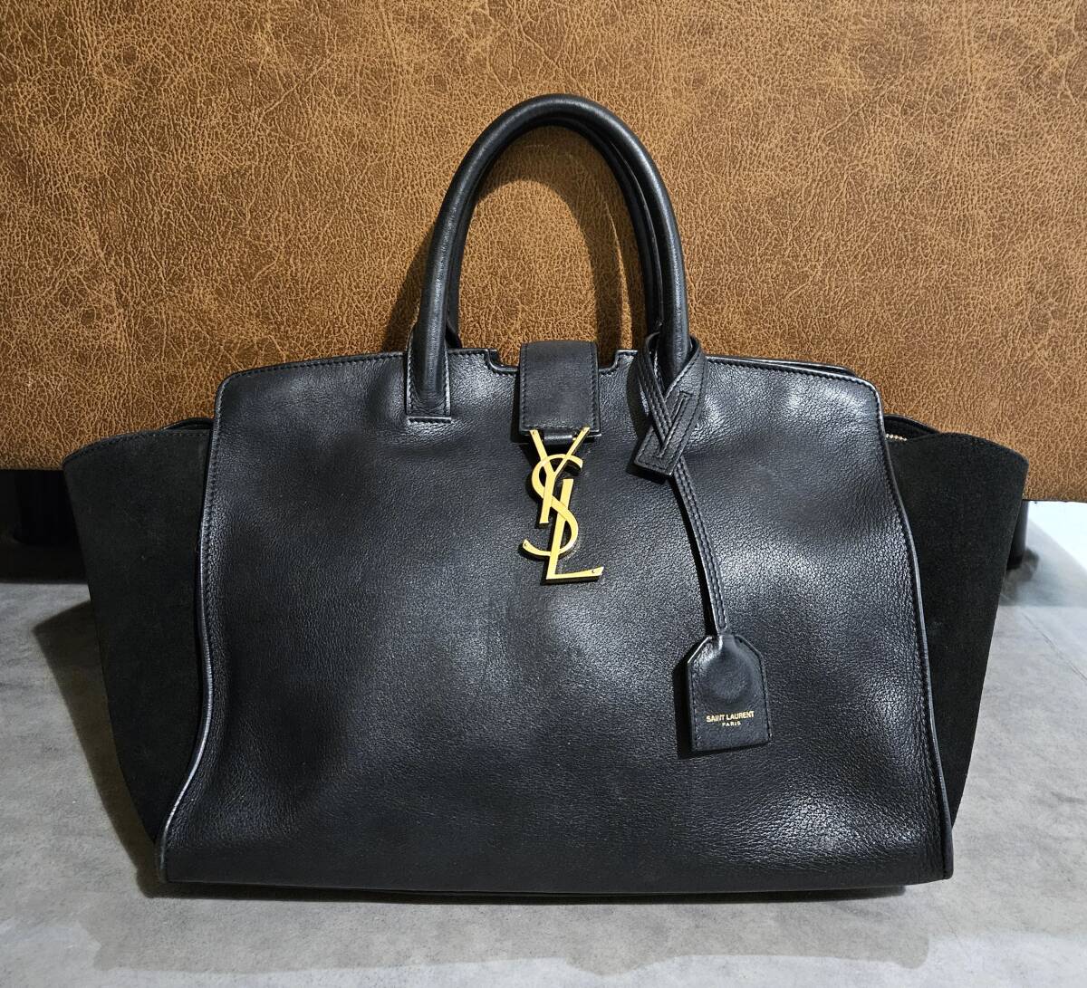 カーフレザーとスエードのコントラストが美しく、正面のYSLロゴも目を惹く品です。
