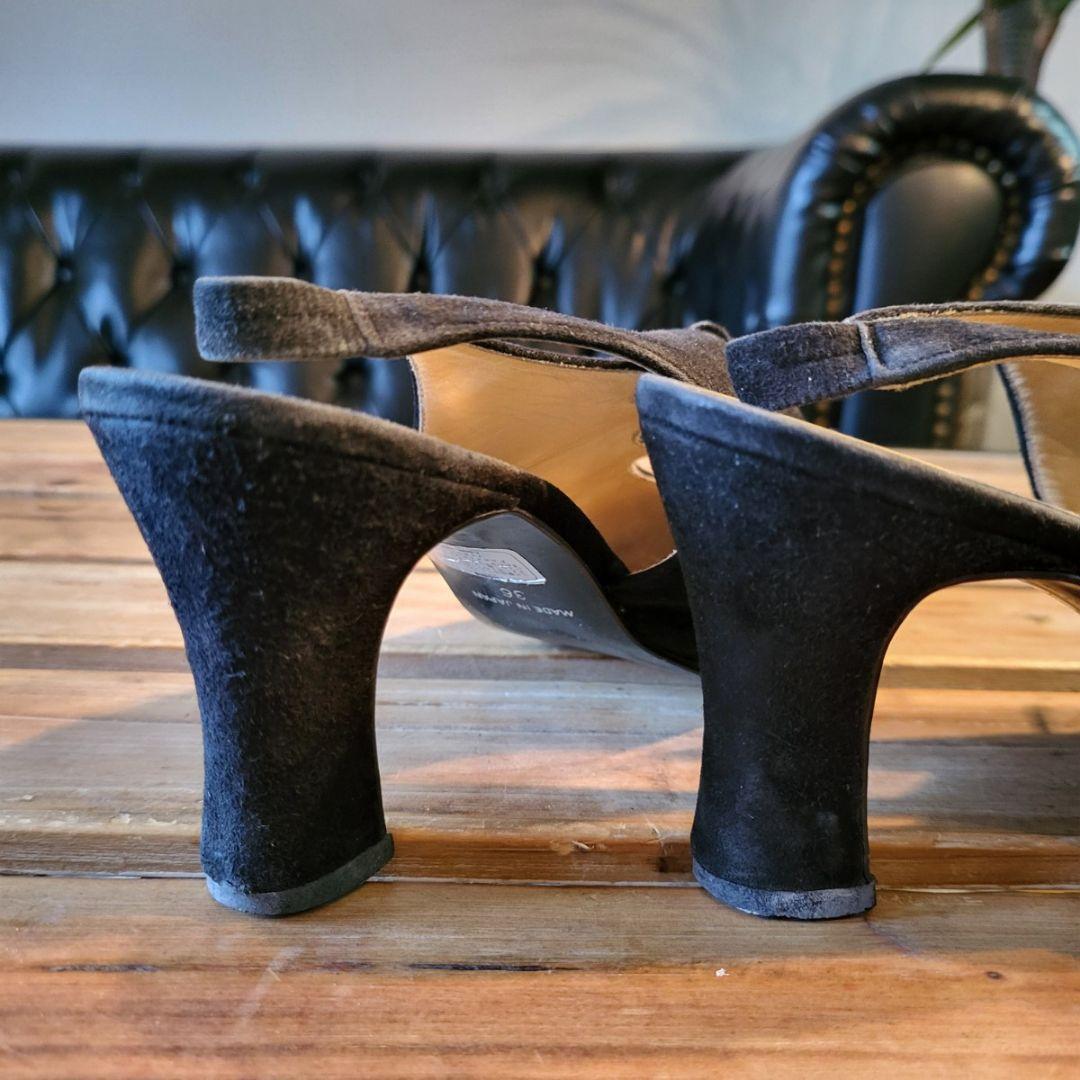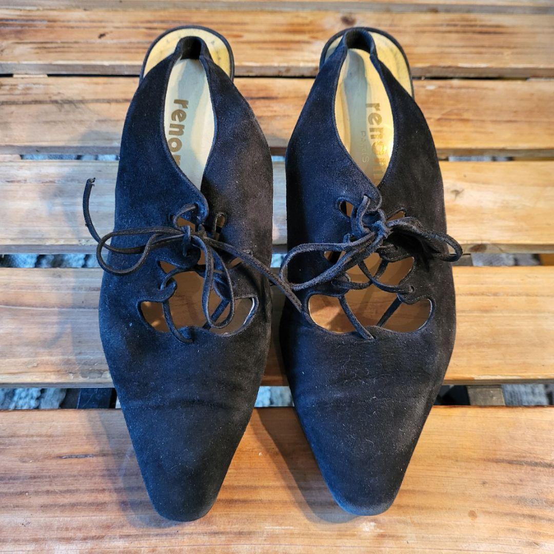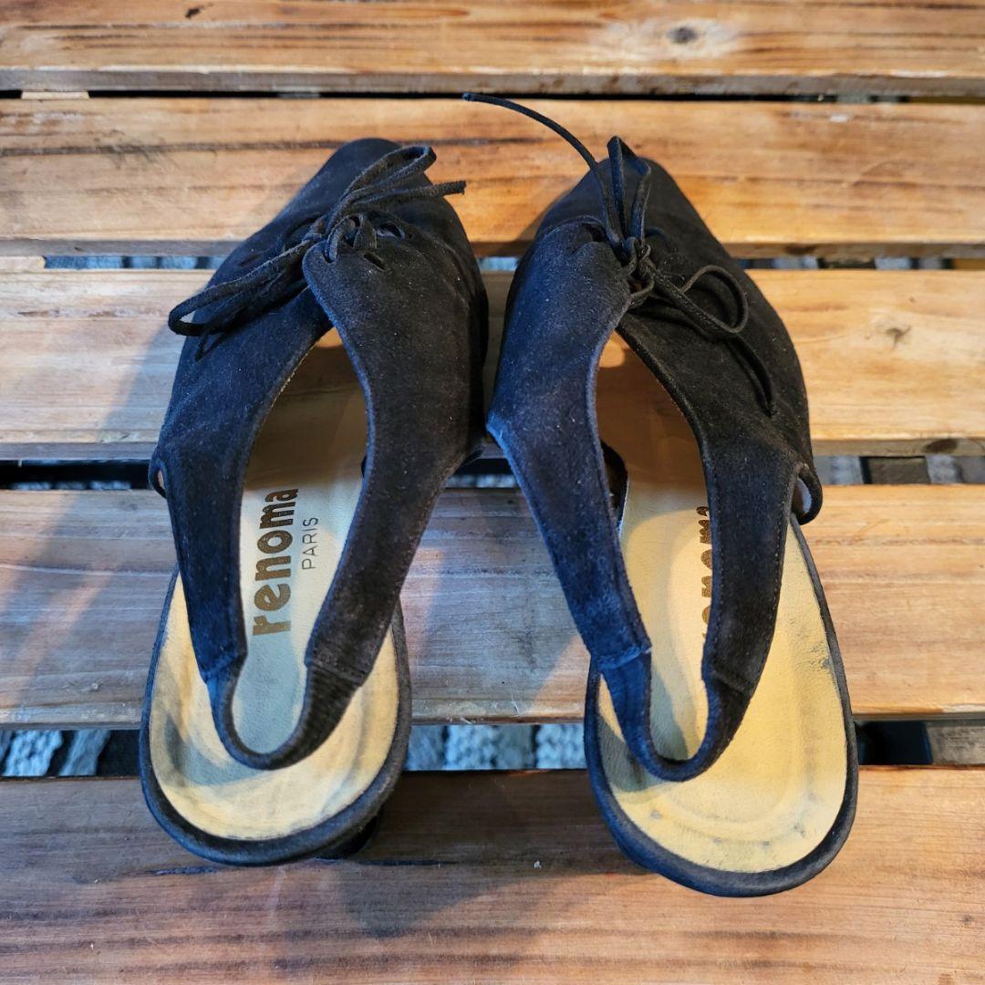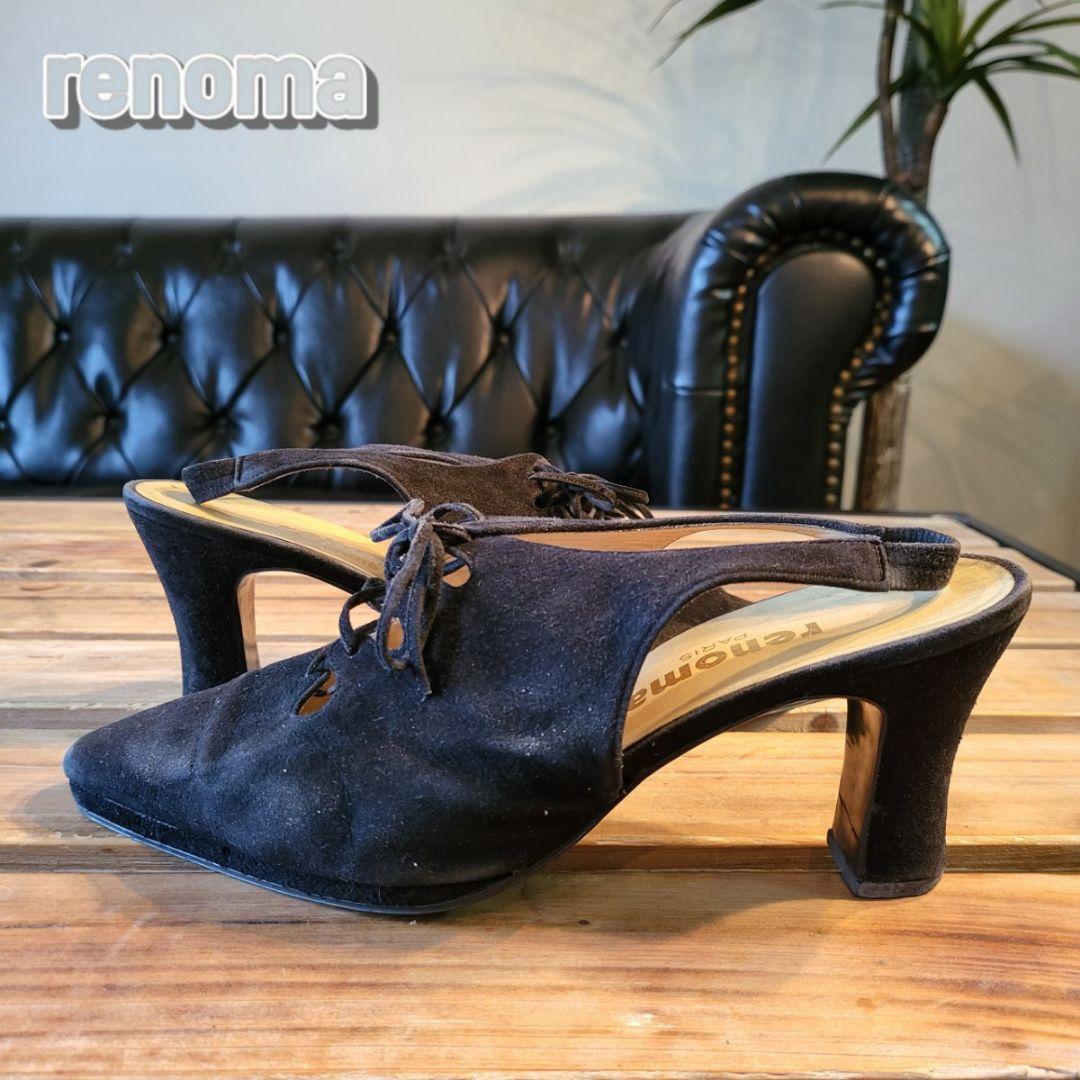 RENONA(レノマ)のブラックサンダルは、上質なスウェード素材とポインテッドトゥデザインが特徴的です。