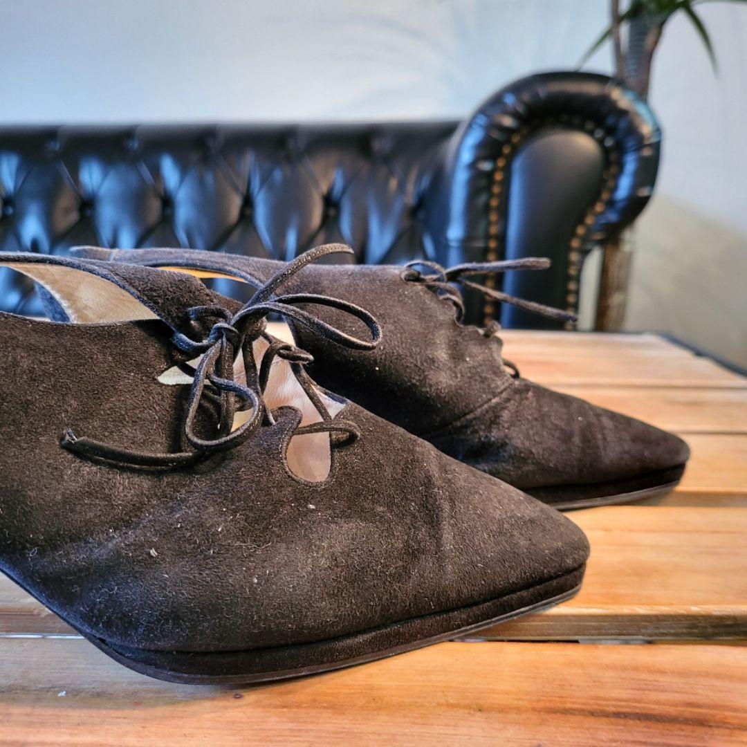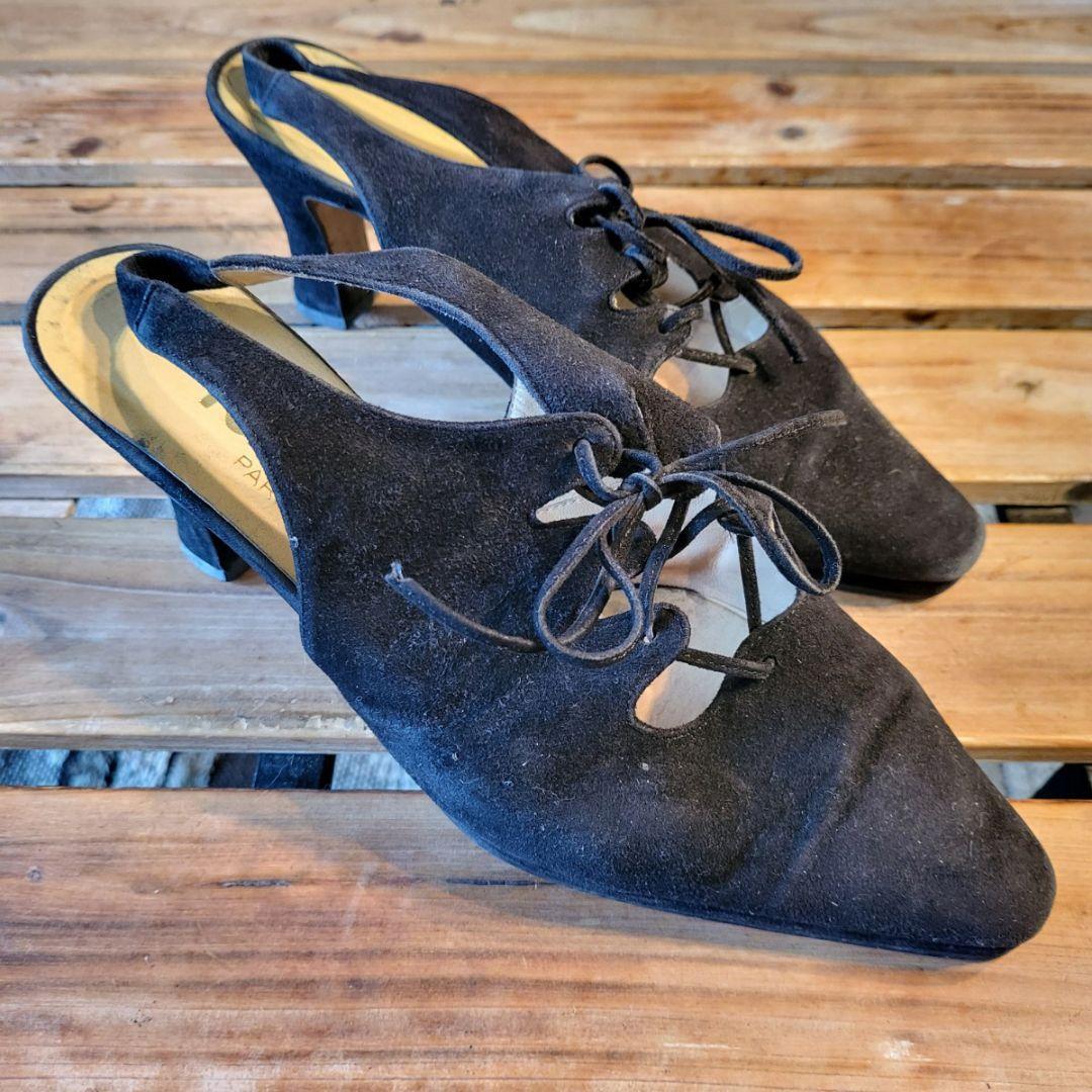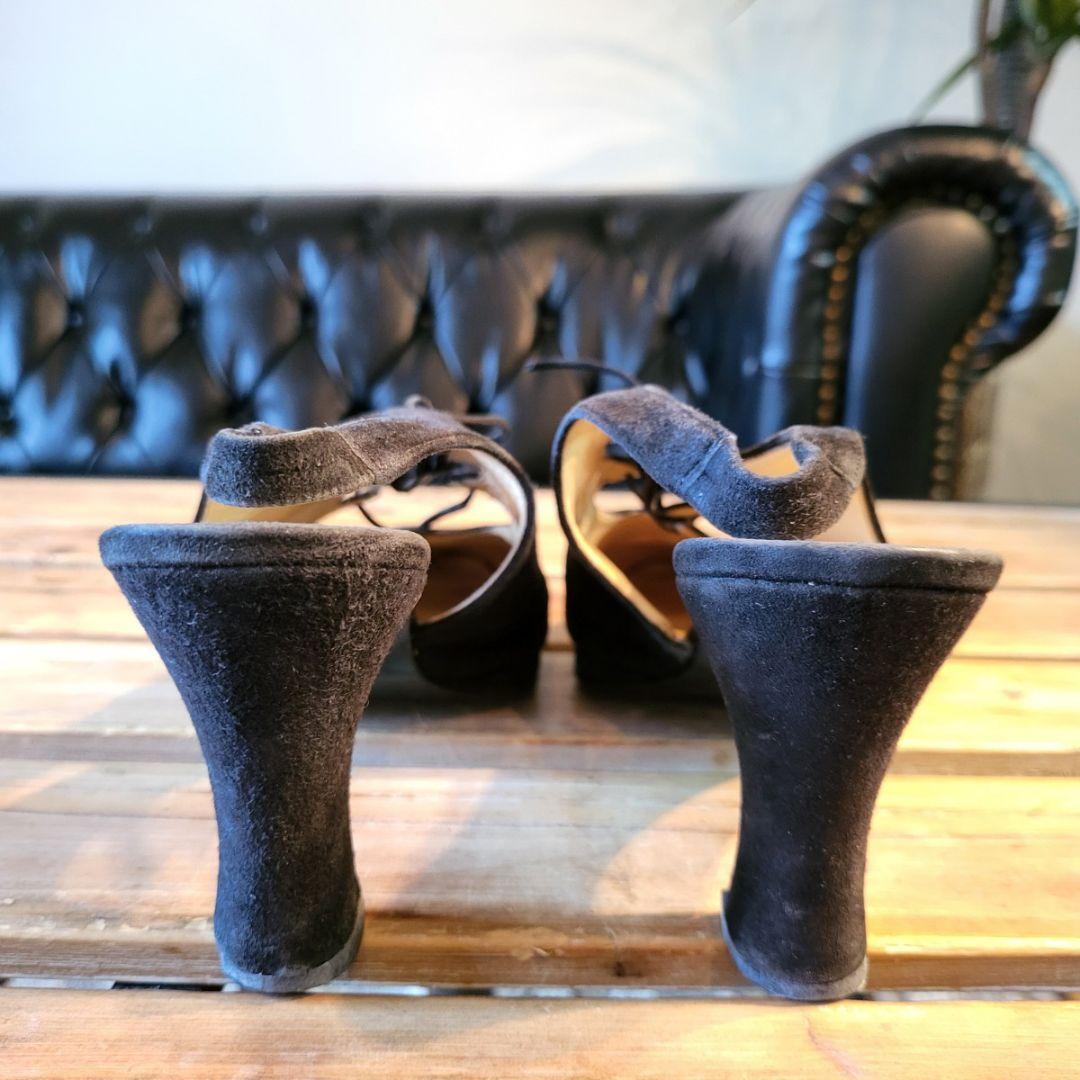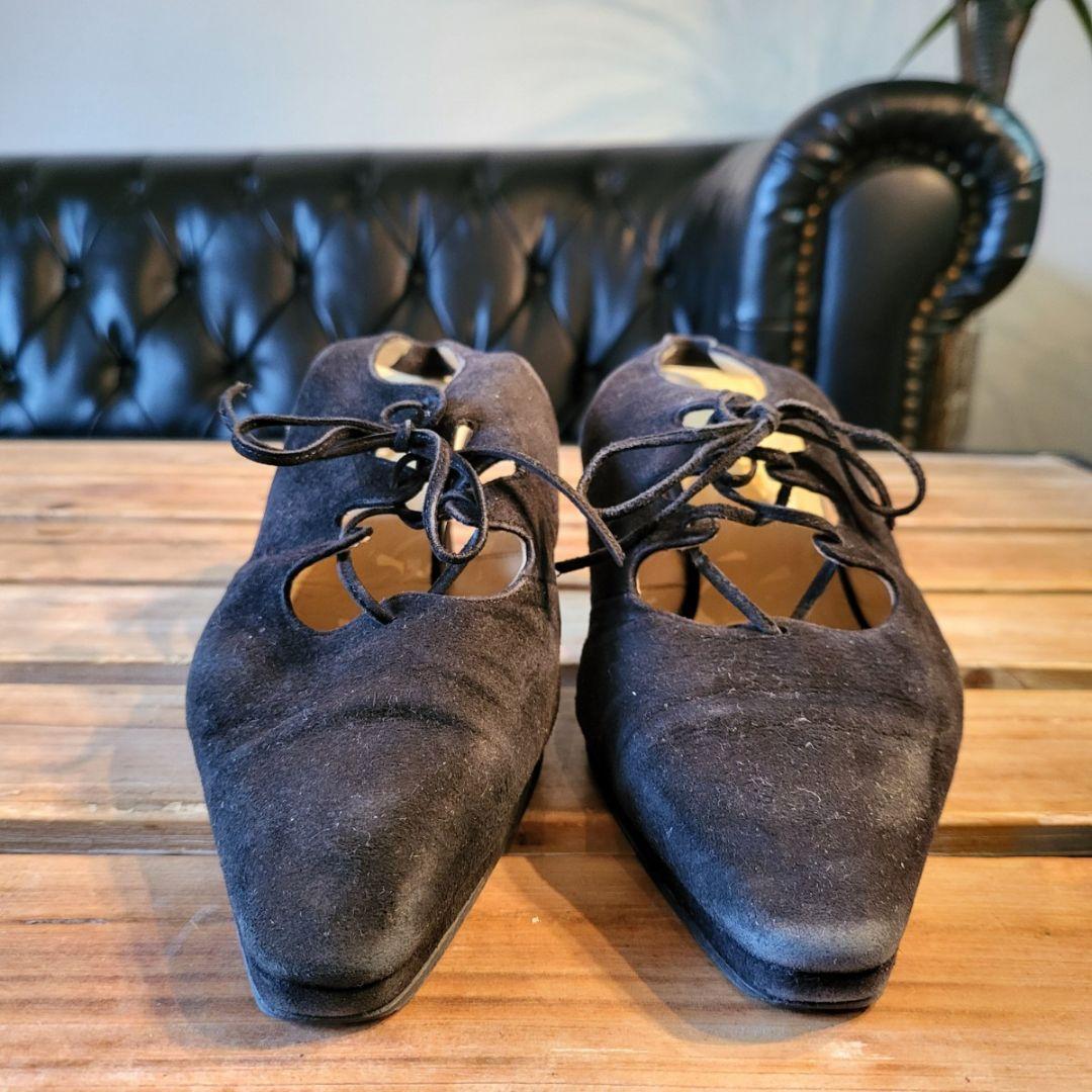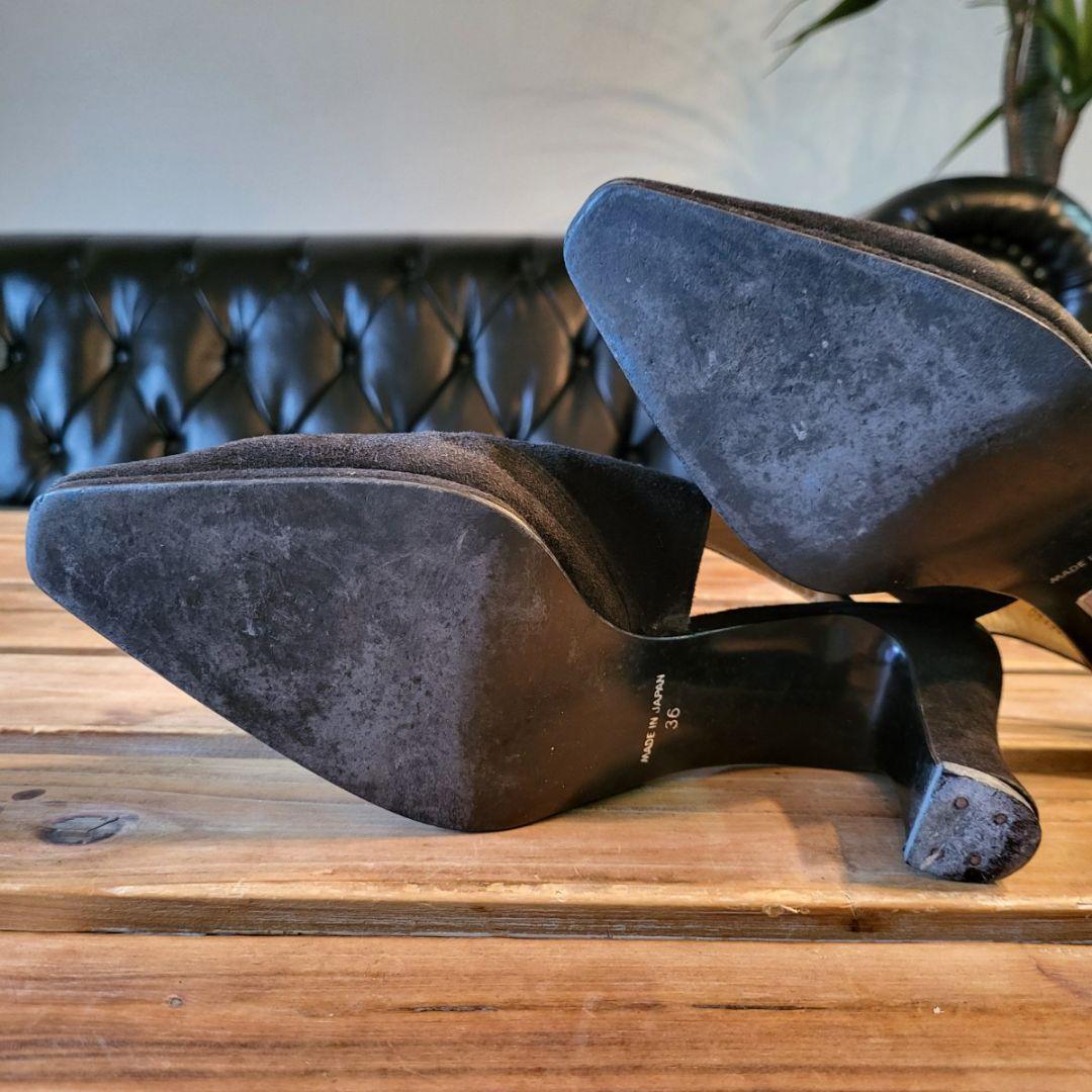 RENONA(レノマ)のブラックサンダルは、上質なスウェード素材とポインテッドトゥデザインが特徴的です。