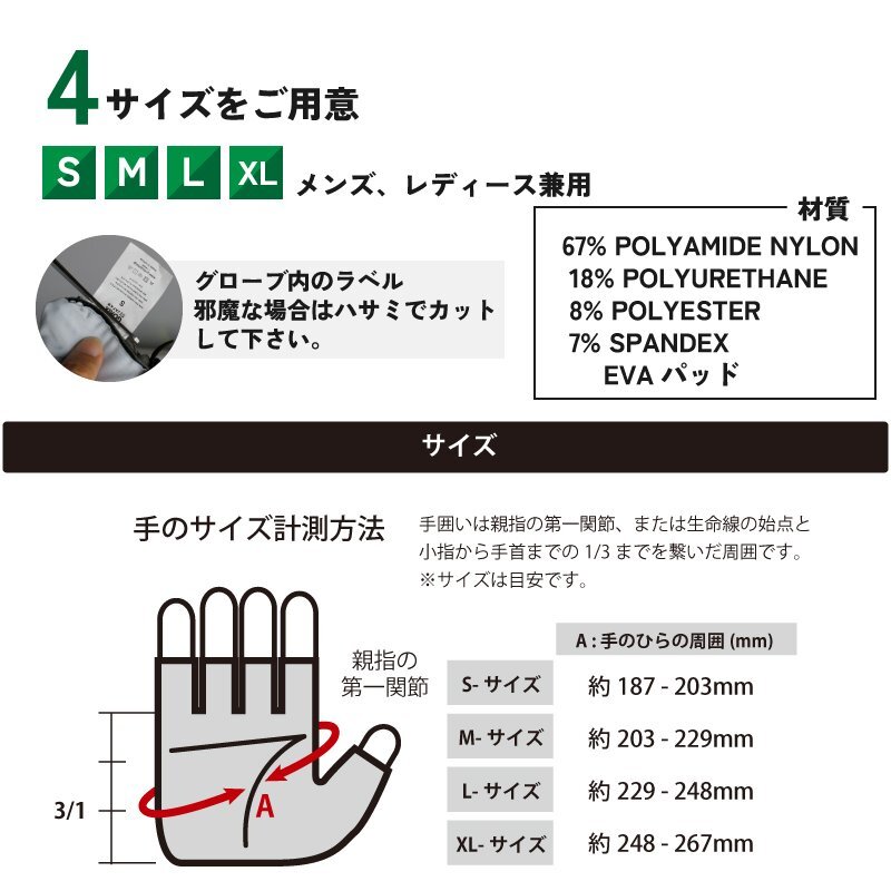 手の疲れや衝撃吸収のみならずサイクルグローブは転倒時の怪我防止にも有効なサイクルグローブ。 指切りハーフタイプで夏や春に活躍します。 手の甲はメッシュ素材で涼しく熱が籠らず快適です。 このグローブはパッドが厚いためロングライドにとても効果的です。 また自転車のみだけでなく筋トレなどのトレーニングや登山などにもお使い頂けます。 柔軟性・速乾性・伸縮性・耐久性を兼ね備えたサイクルグローブ。 自転車全般、ロードバイク、マウンテンバイク、クロスバイク、ミニベロ あらゆるスポーツ時にオススメの衝撃を和らげる自転車用サイクルグローブです。 [涼しいメッシュ素材] メッシュ素材は通気性抜群で熱籠りなどの不快感を解消し快適に装着する事が出来ます。 速乾性にも優れています。 [柔軟性・速乾性・伸縮性・耐久性] [厚めのパッド] 負荷のかかる場所に厚手のパッドを配置。 5-6mm厚のパッドは耐震3次元衝撃吸収EVAパッドを採用しハンドルからの衝撃を吸収し疲れを緩和します。 ハンドルとの接触部分で力が掛かりやすい位置にパッドを配置。 長時間のロングライドなどに効果的です。 [反射デザイン] 光に反射し夜間走行の安全性を高めます。 リフレクターは夜間走行の多いブルペや自転車通勤にも効果的。 [手の平] 通気口が複数あり通気性を向上させます。 また滑り止めがついているので、夏場でもしっかりと握ることができます。 [着脱] 手首プラーはサイクルグローブを着脱する時にとても便利な機能です。 また指ループは脱ぐ時に使うと通常よりも脱ぎやすくなります。 商品内容サイクルグローブ指切りタイプ 材質67% POLYAMIDE NYLON18% / POLYURETHANE8% / POLYESTER7% /SPANDEX /EVAパッド | |