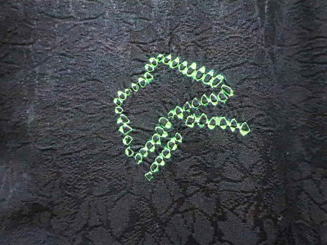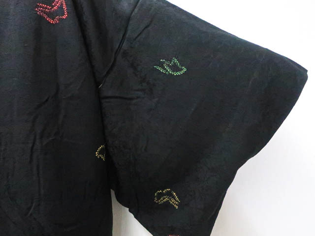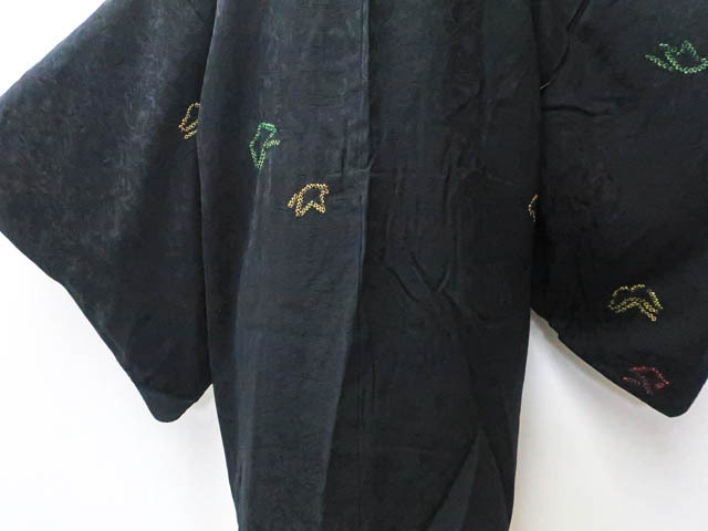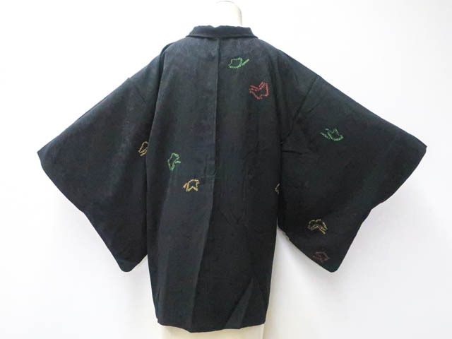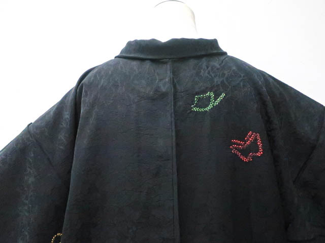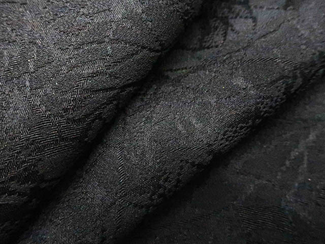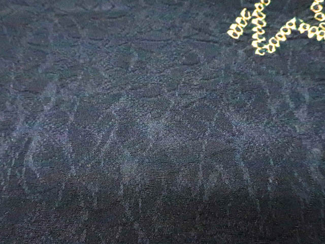 リサイクル商品のため、羽織裏、後ろ身頃に薄汚れと畳ジワがございますが着用可能なお品です。 地色は黒です。 1枚目の画像が近いお色かと思われます。 素材は正絹です。 |