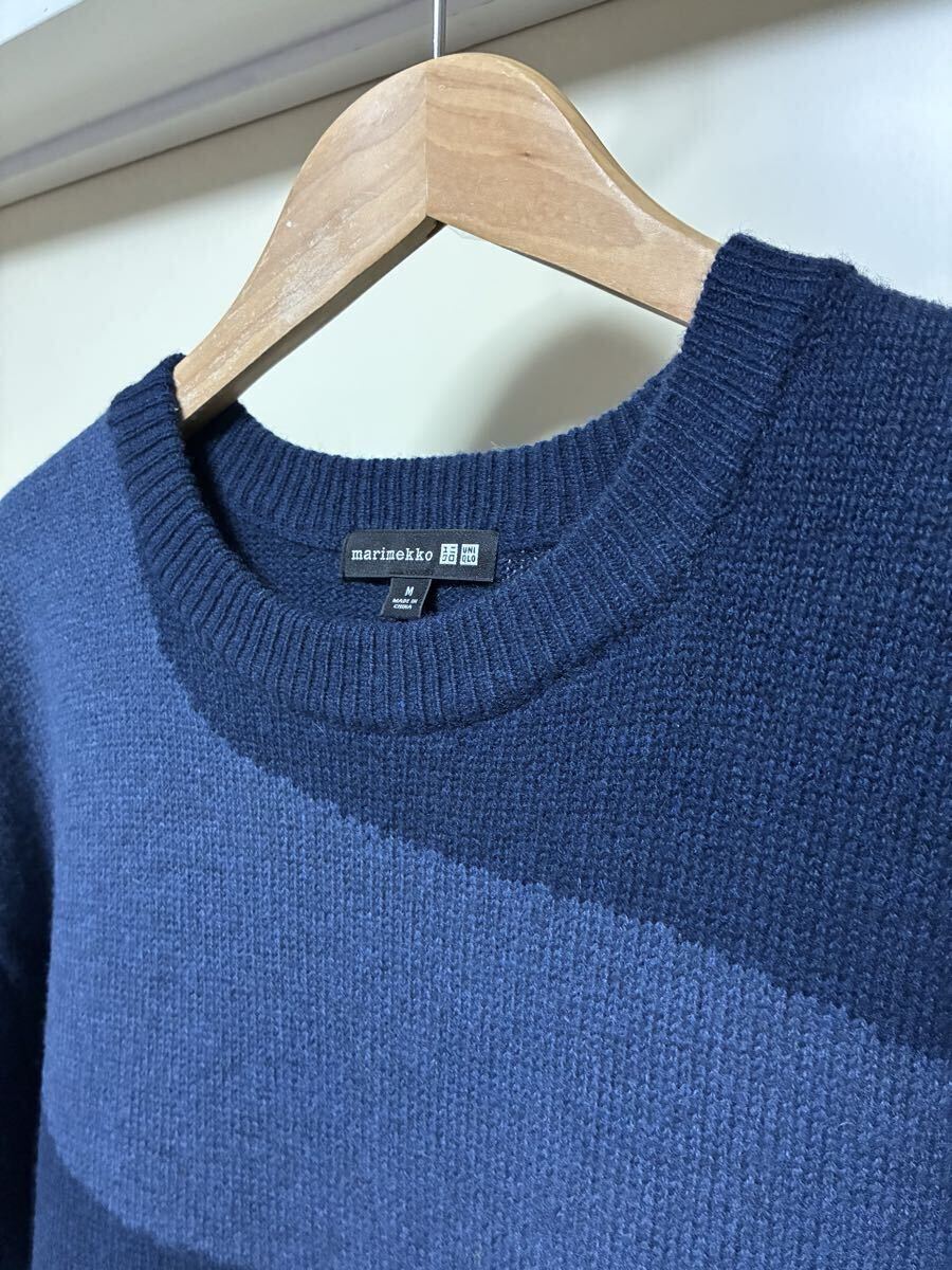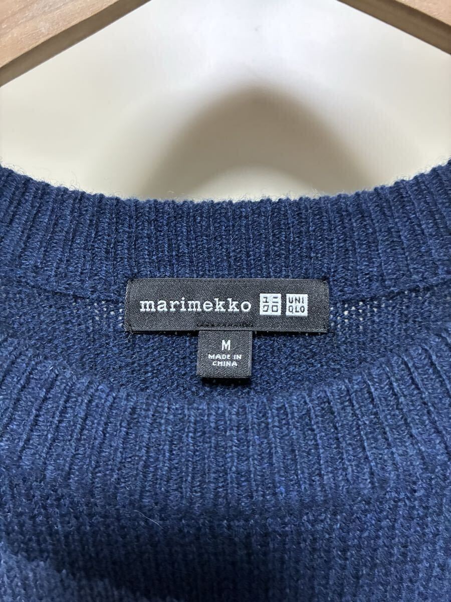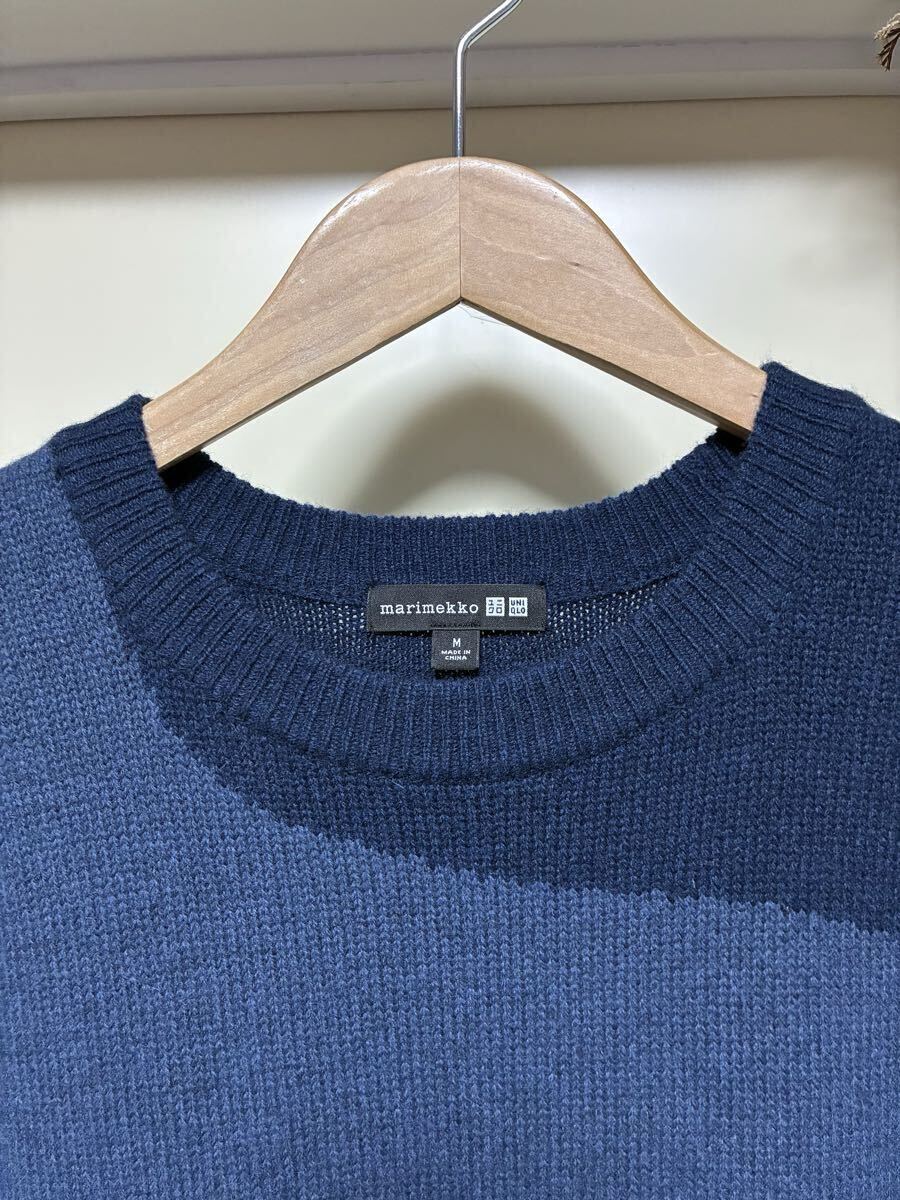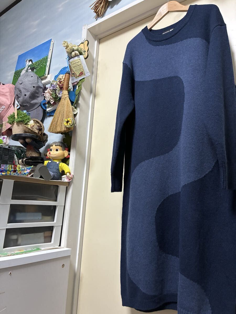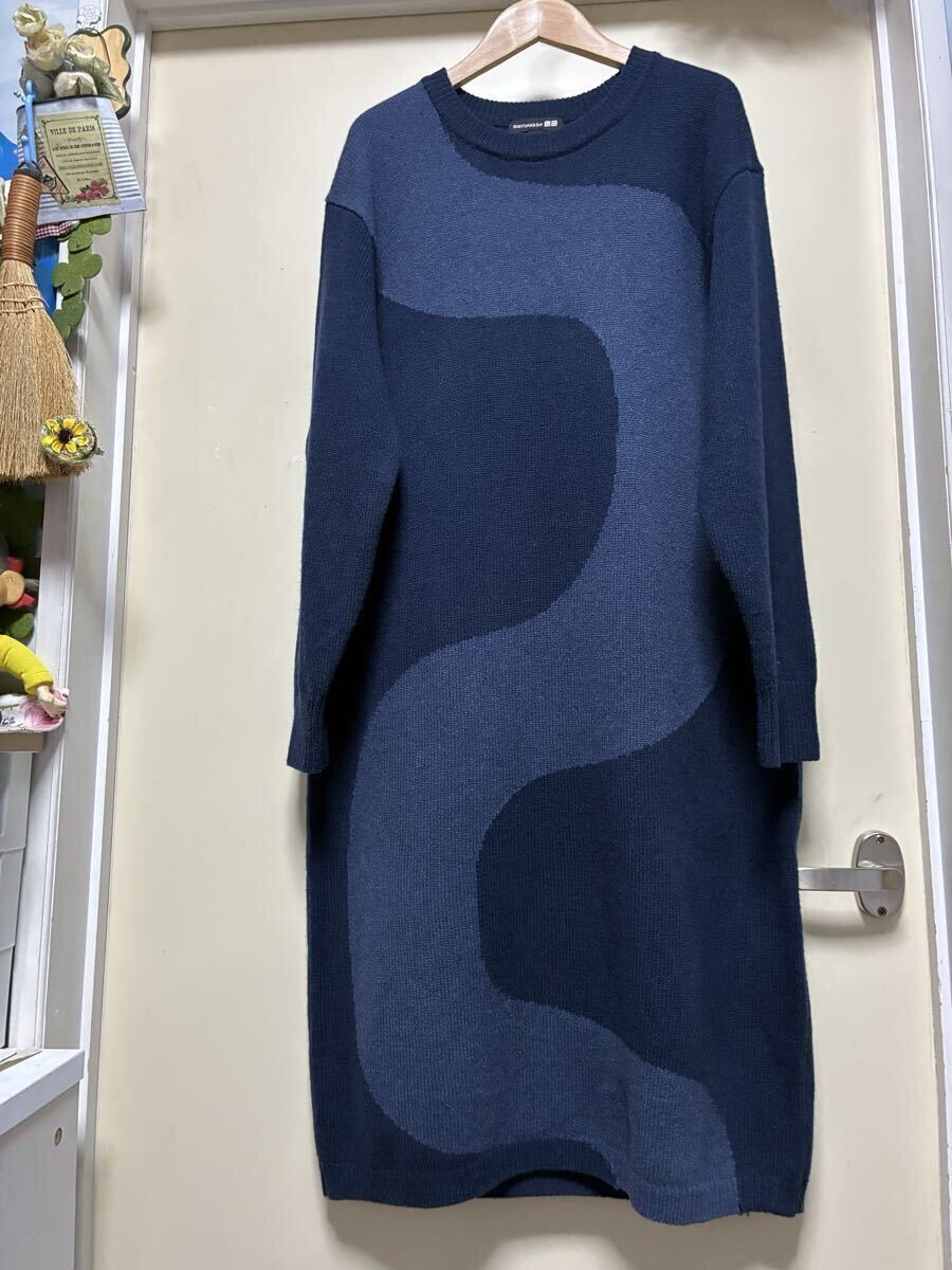 ★UNIQLO.MARIMEKKO(マリメッコ)★落ち着きのある色合いでお洒落なデザインのニット.ワンピースになります。ネイビー×ブルー系の2色使いで曲線のお洒落なデザインになっています。後ろ側はネイビーカラーの無地になっています。首周り、袖口、裾辺りはリブ仕上げになっていて揺ったりとしたお洒落な一枚に仕上がっています。