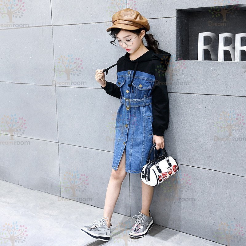 kids デニム切り替え ハイウエスト ワンピース 【160cm】ブラック 女の子 パーカー 学生 秋服 長袖 K-419bk