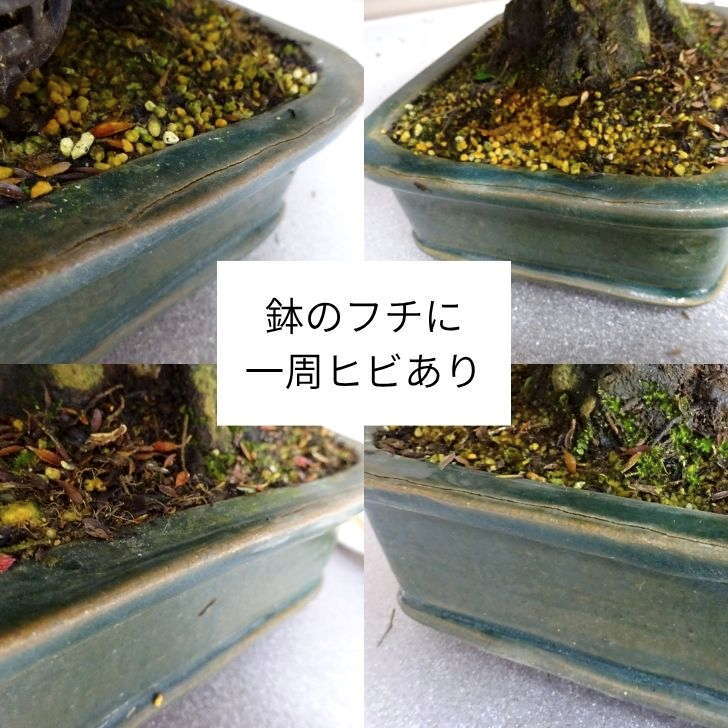| 注意事項 | 鉢のフチにヒビあり ※商品到着後、直ぐにお水をあげてください。 ※当店は定期的に害虫対策として消毒、殺菌をおこなっております ※有機肥料を主に使用しておりますので発送後、まれに虫がつく場合がございます。 ※モニターの発色具合によって、実際のものと色が異なる場合がございます。 ※商品は鉢入りの盆栽のみになります。(卓、作業台、小物等は撮影用です。) ※あらかじめご了承くださいますようお願いいたします。 |