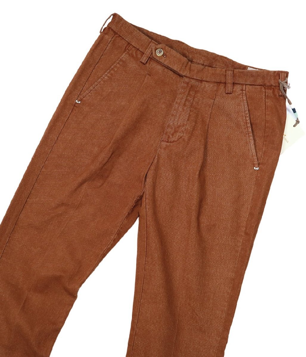 絶妙なゆとりのある腰まわりと腿まわりから、イタリア人が好む細い裾幅に向かう美しいスリムテーパードシルエットが特徴で、「クラシック」と「モダン」を見事に融合。「ヴィンテージ調の素材感」に、「やや下側につけたプリーツ」と「タブフロントのウエスマン」が腰回りに粋な表情をつけてくれ、はくだけで ”モダンクラシックな大人の洒落感” を演出してくれます!