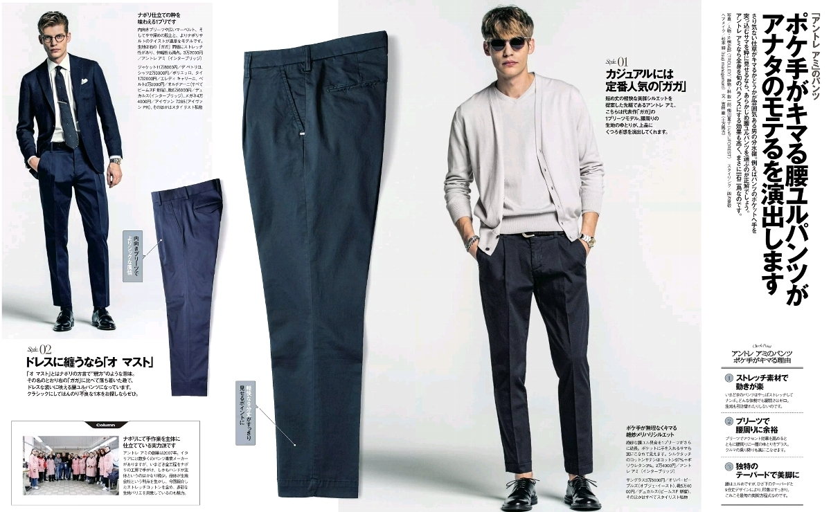 美しい細身の九分丈シルエットで、新鋭パンツブランドながら一躍人気ブランドにまで成長した「アントレ・アミ」。お馴染み「ピッティ」のスナップに登場する伊達男たちが、こぞって愛用している細い裾幅の九分丈パンツの多くがこの「アントレアミ」なんです。