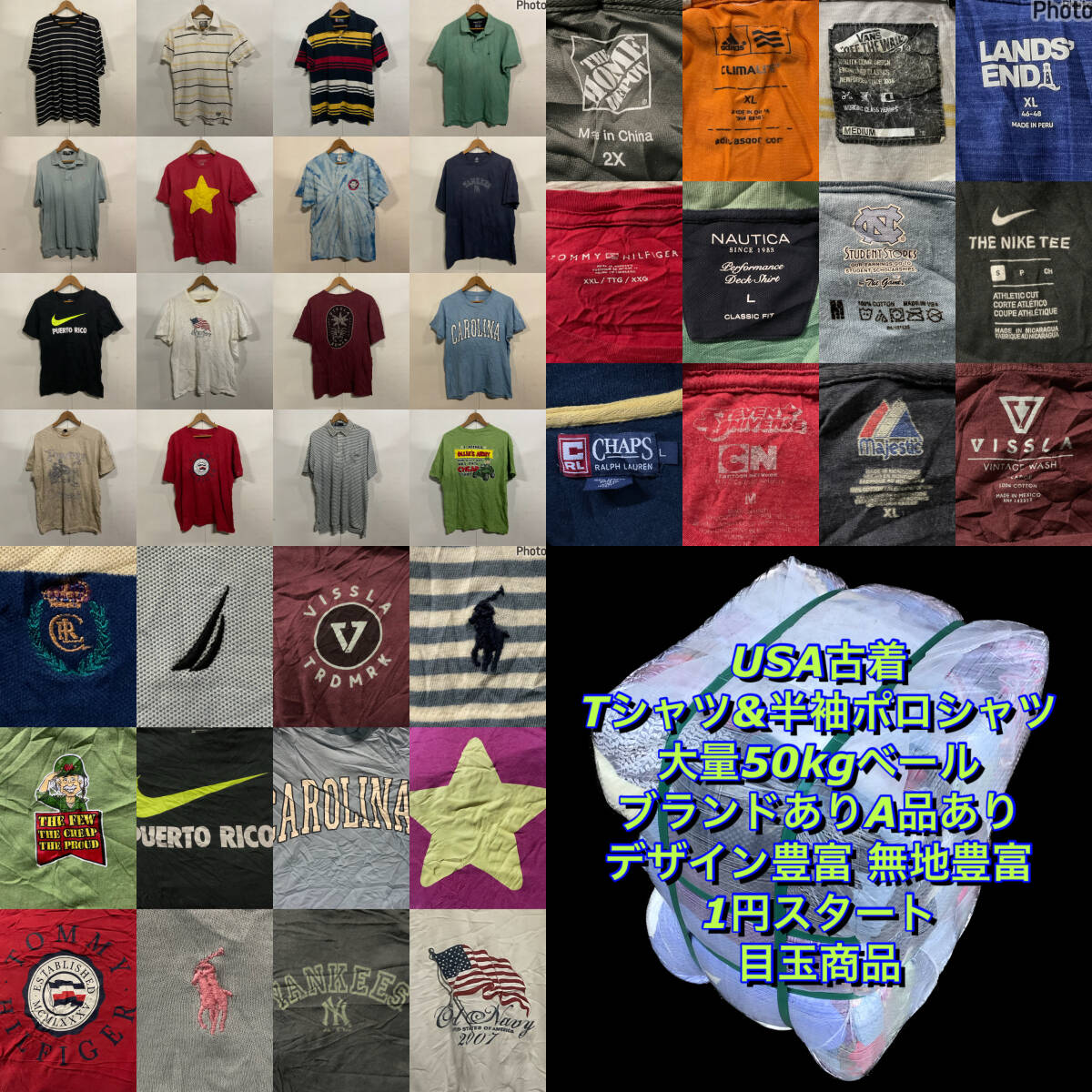 【T1770】★1円スタート★ アメリカ古着Tシャツ&半袖ポロシャツ大量50kgベール目玉商品 無地豊富 カラバリ豊富 ブランドあり サイズMIX