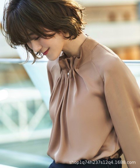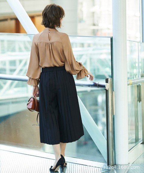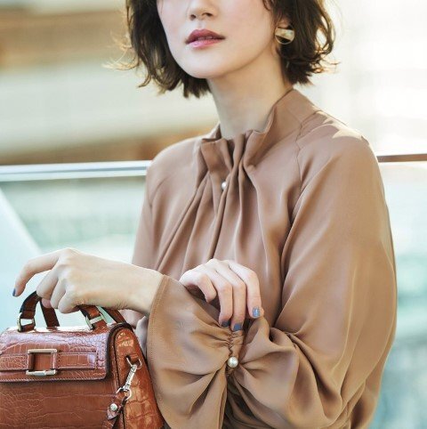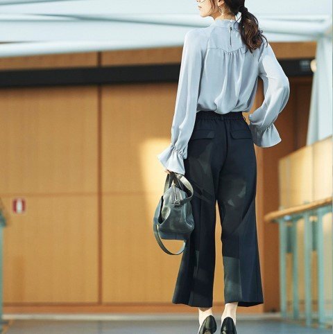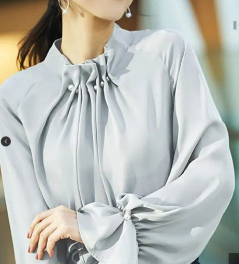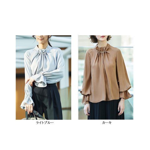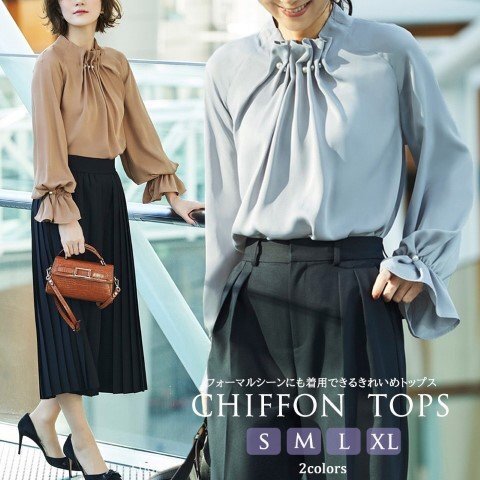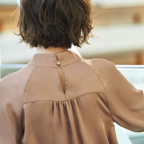 ・首元のパールを中心にフロントにタックを施したきれいめな印象のシフォントップス。バックスタイルは、襟部分のボタン+ゴムループです。