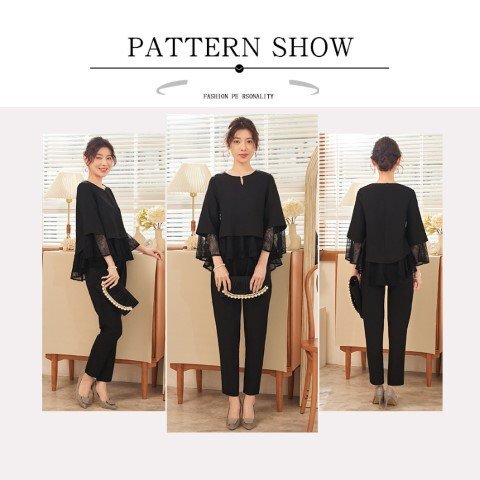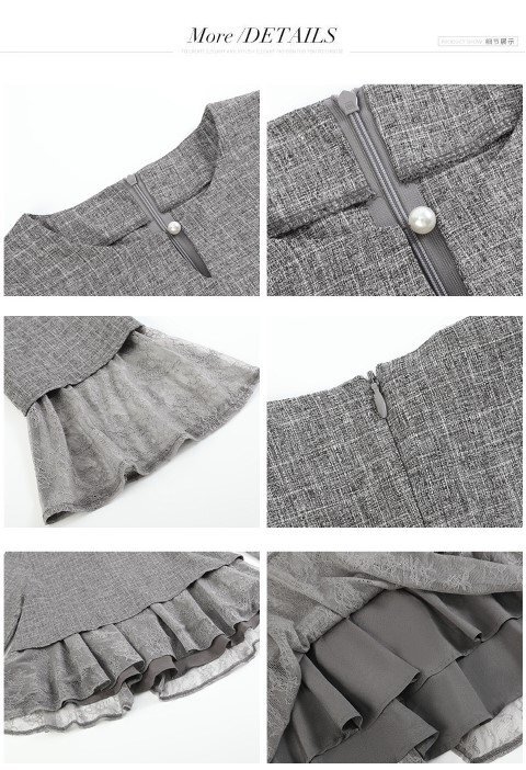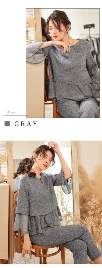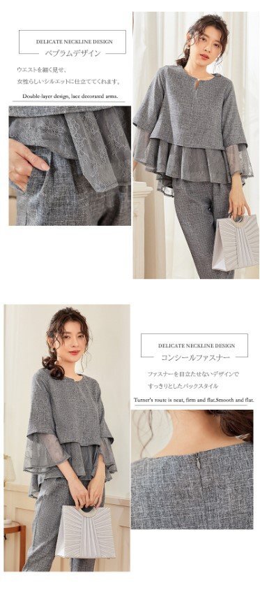 ・首元にあるパールでアクセサリーなしでも十分な装い。ウエスト部分はペプラムデザインでウエストを細く見せ、女性らしいシルエットに仕立ててくれます。