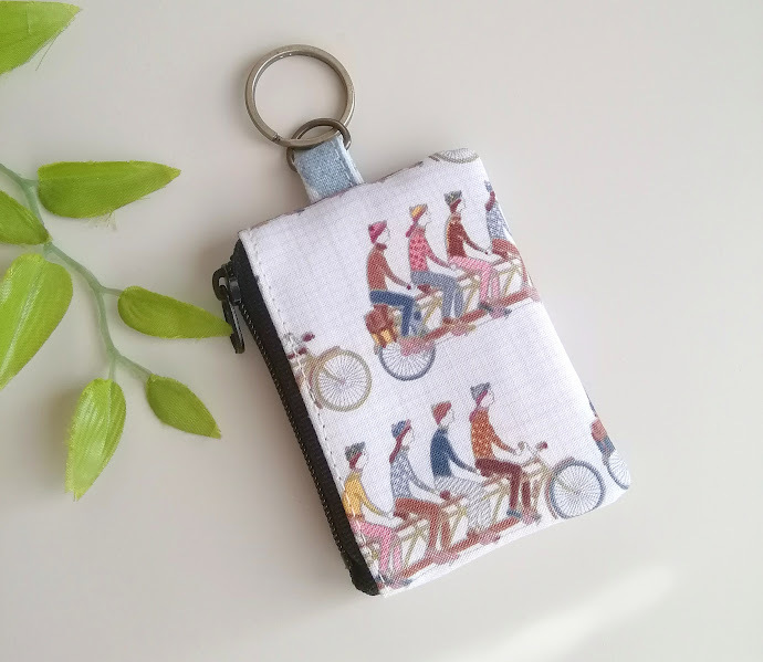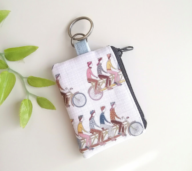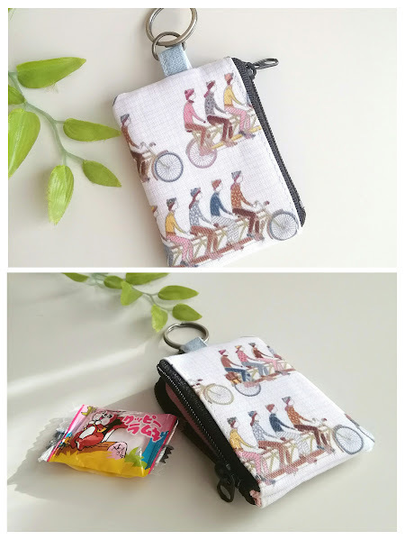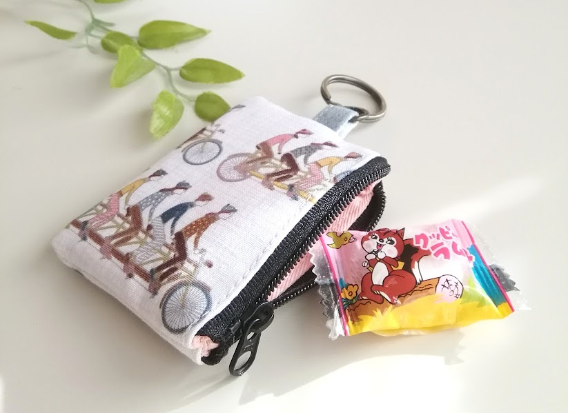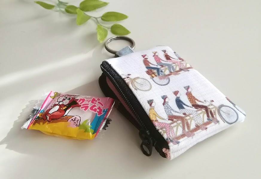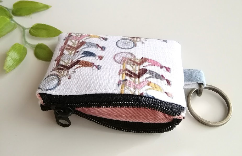 ハンドメイド〈小銭が入るキーホルダー〉ミニミニポーチ  USAコットン*Cycling/ 自転車に乗る人たち② (8×5.5)※ピルケ-ス/コインケ-ス