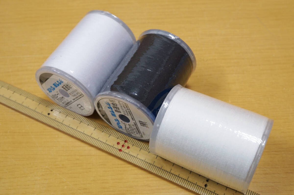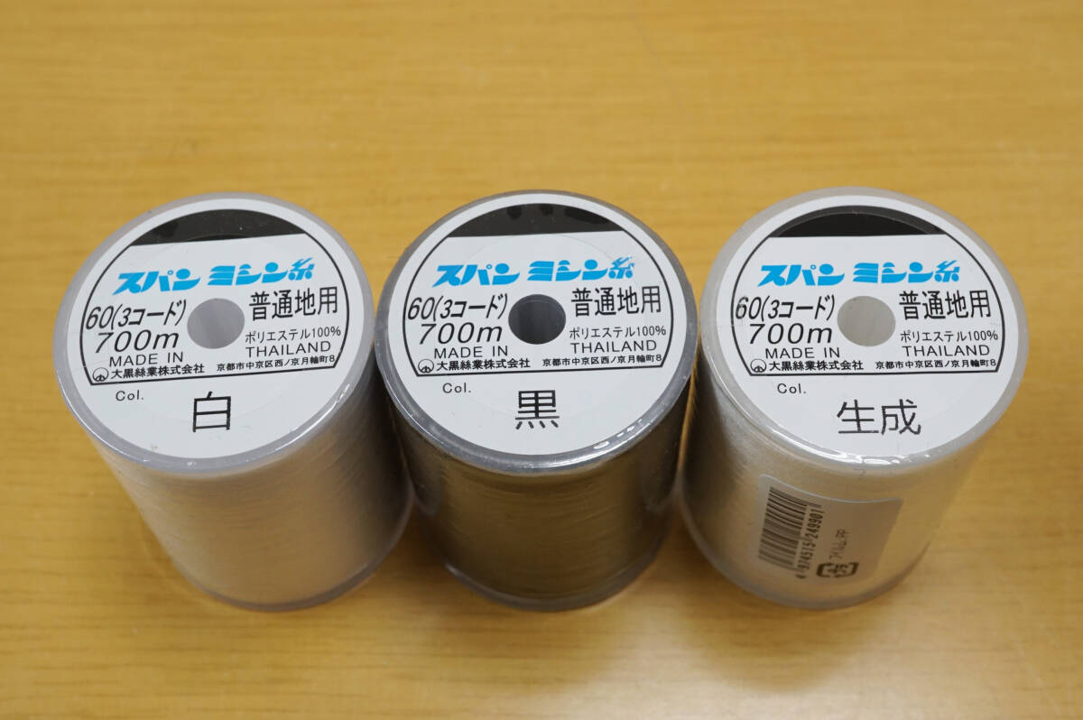 新品未使用品、#60番、家庭用スパンミシン糸、大巻タイプ(1本:700m巻)、白・黒・生成、総計3本組での出品でございます。