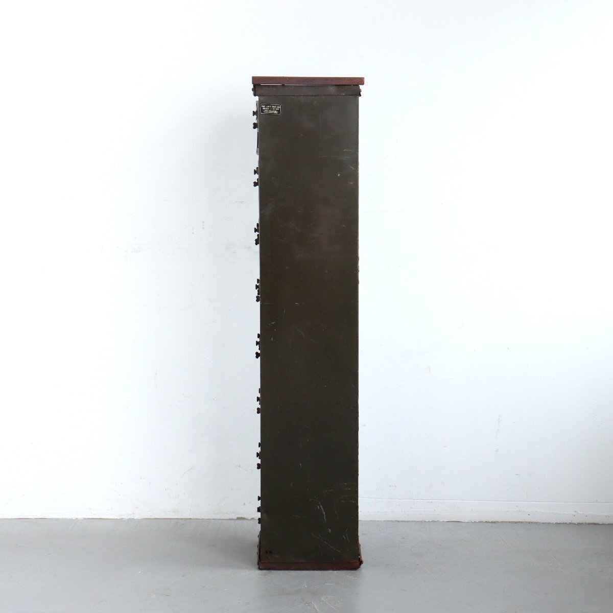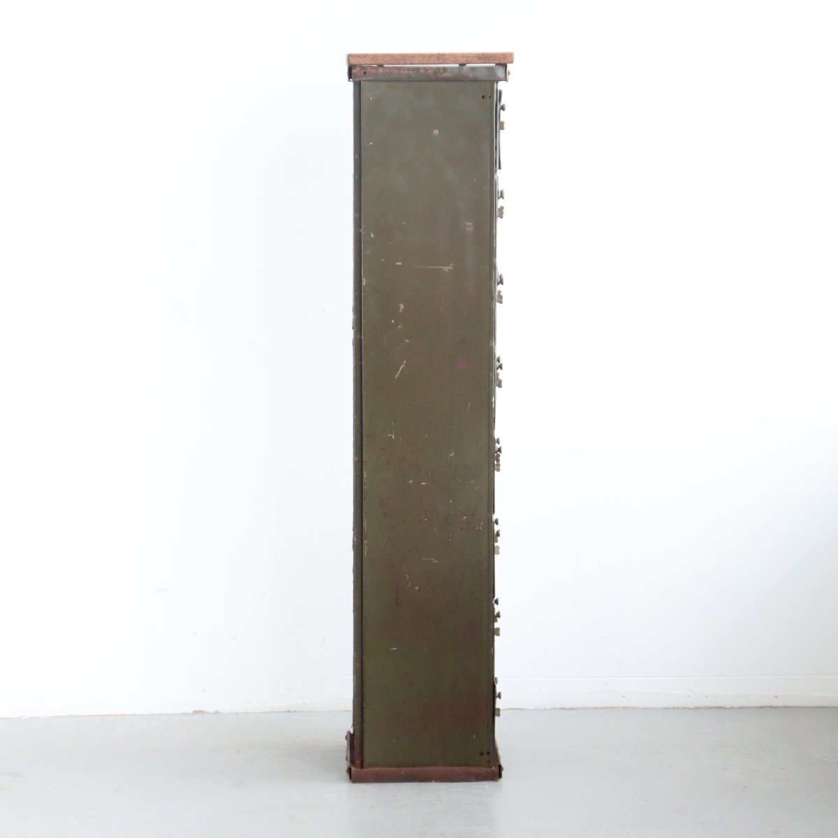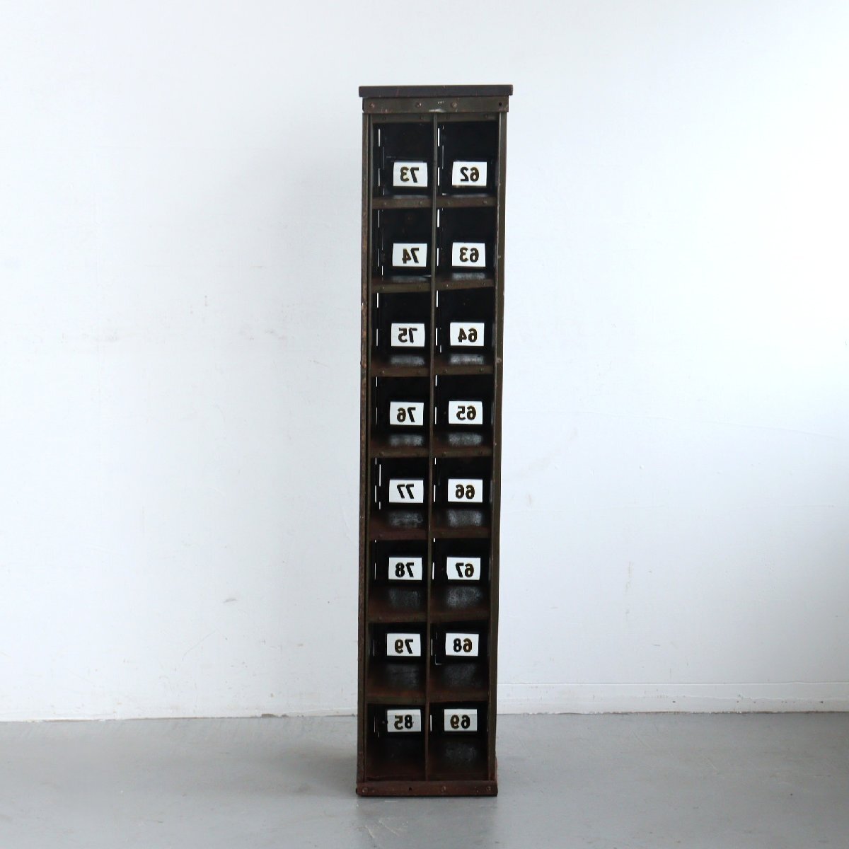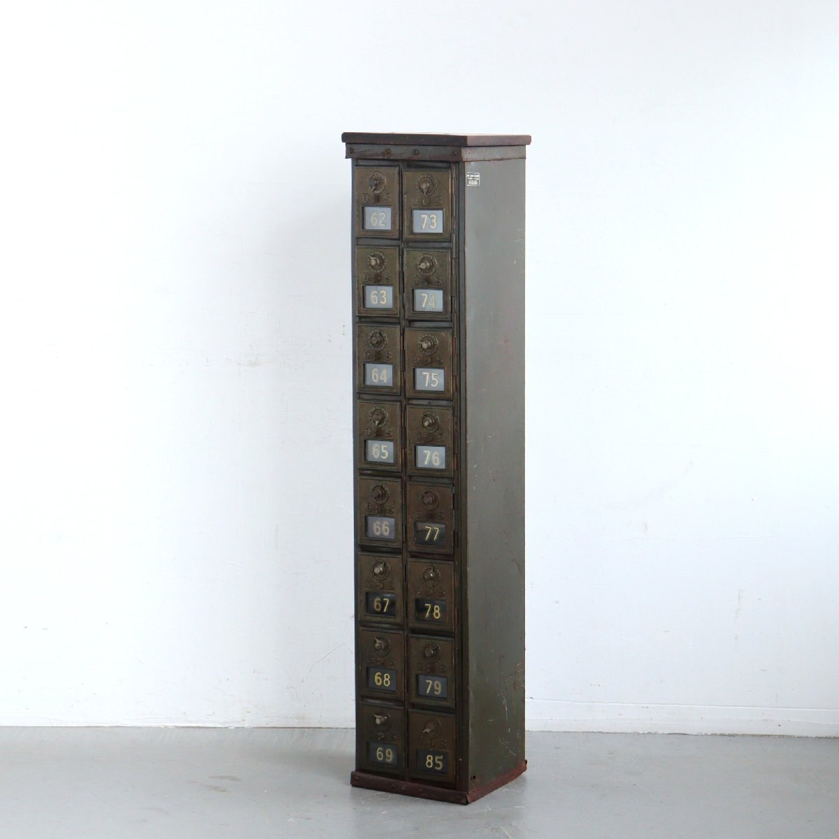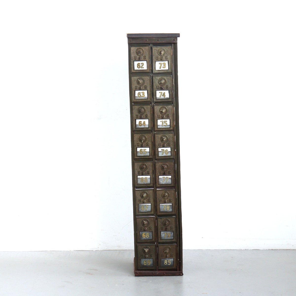 | 商品説明 explanation | 1930年代から40年代頃のアメリカで使用されていたポスタルキャビネット(私書箱)です。 郵便局にて受取人が鍵を開けて、郵便物を引き取る時の為に使用されていたモノです。 ODグリーンのスチール製ボディに、メタルの小さな扉が魅力的です。 傾きがあり、扉も裏からロックの棒をスライドさせないと開かない為ディスプレイ用としてご自宅や店舗什器にいかがでしょうか。 |