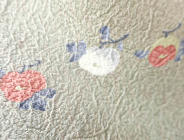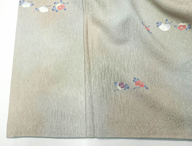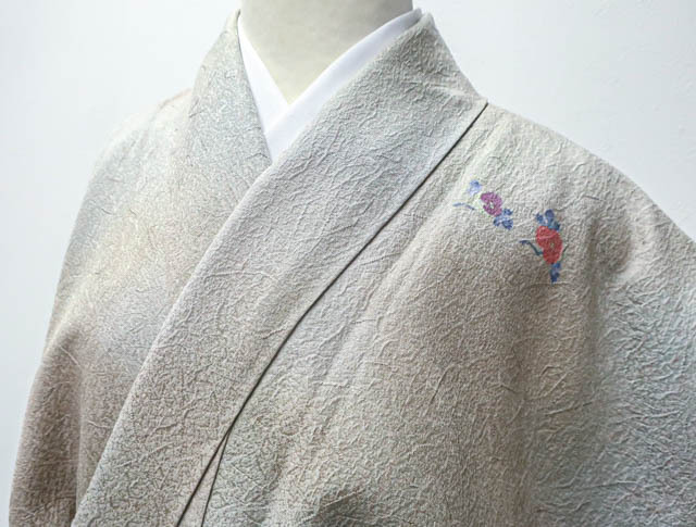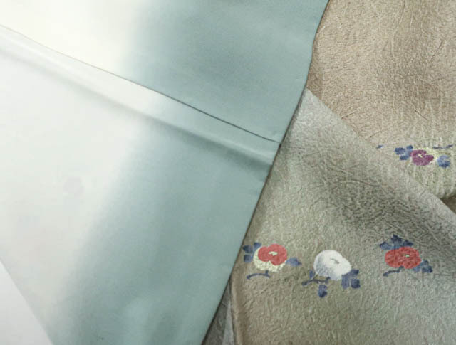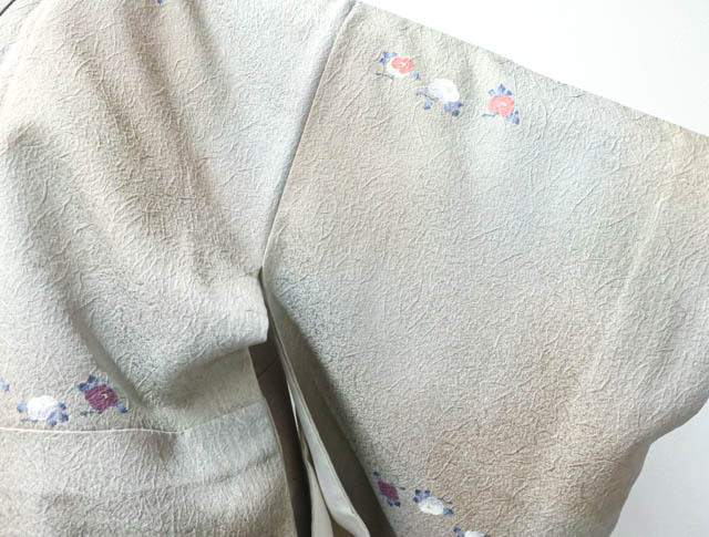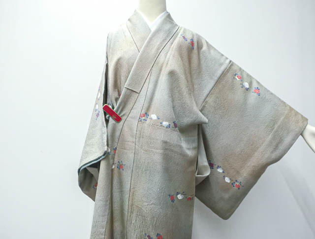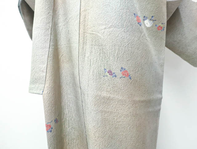 リサイクル商品のため、胴裏にスナップボタンによる汚れがございますがご着用いただけると存じます。 地色は、灰緑色です。 1枚目の画像が近いお色かと思われます。 素材は正絹です。 |