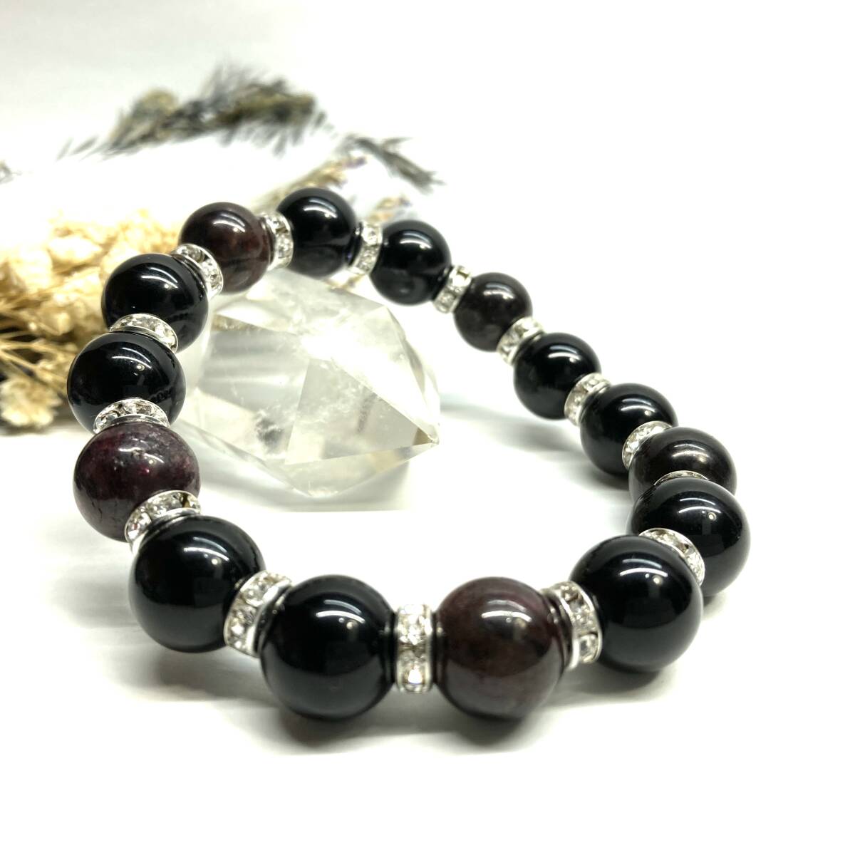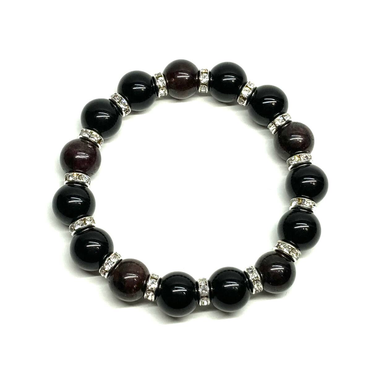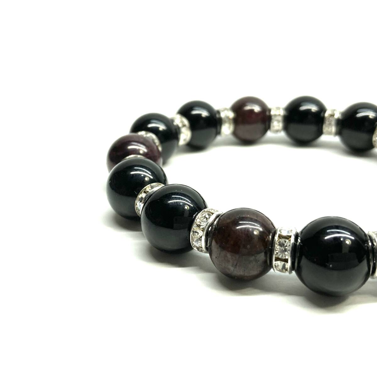 こちらは、モリオンとガーネットを組み合わせたパワーストーンブレスレットです。間にはロンデルを挟み高級感あるデザインに仕上げております。程よくインパクトがある12mm玉を使用して内周約18cmです。(サイズ変更の場合は取引ナビにてご連絡をお願いします。) 数に限りがございますので気になる方はお早めにどうぞ。