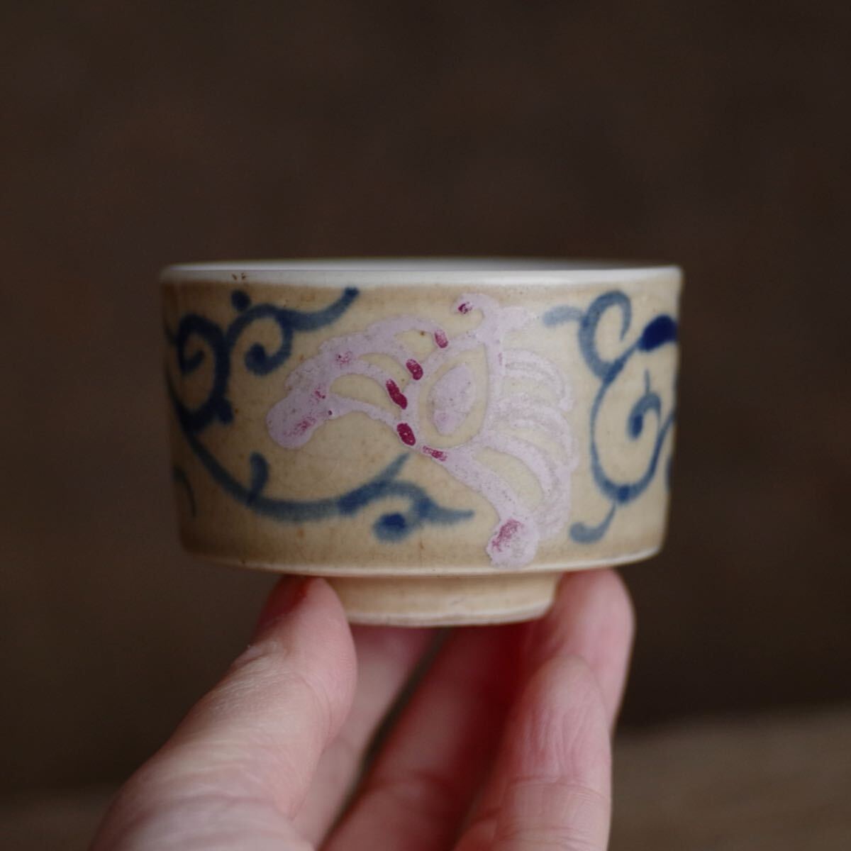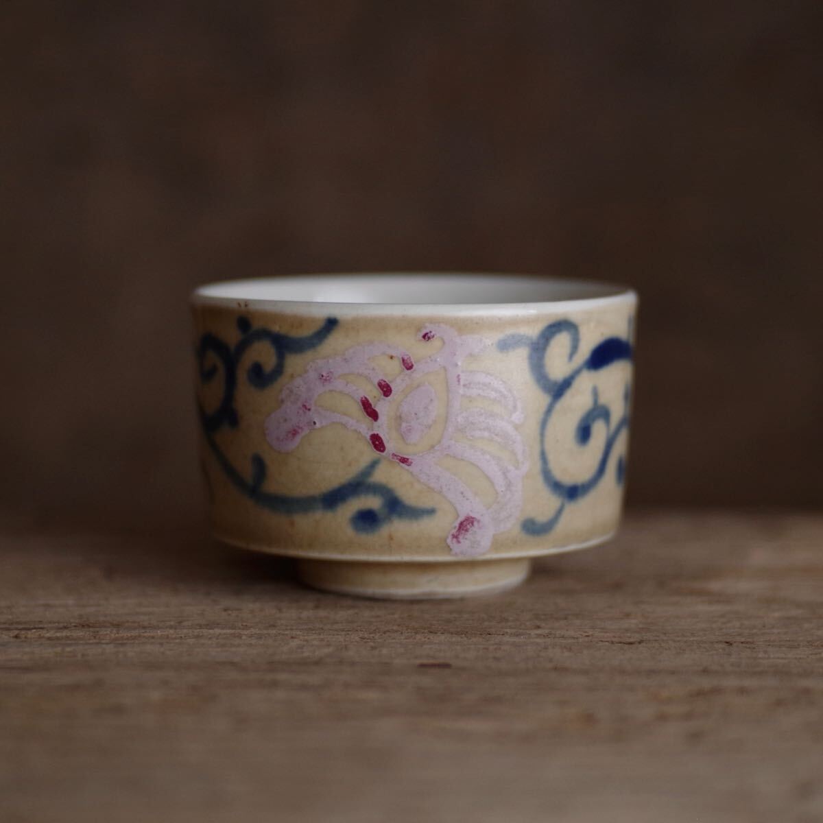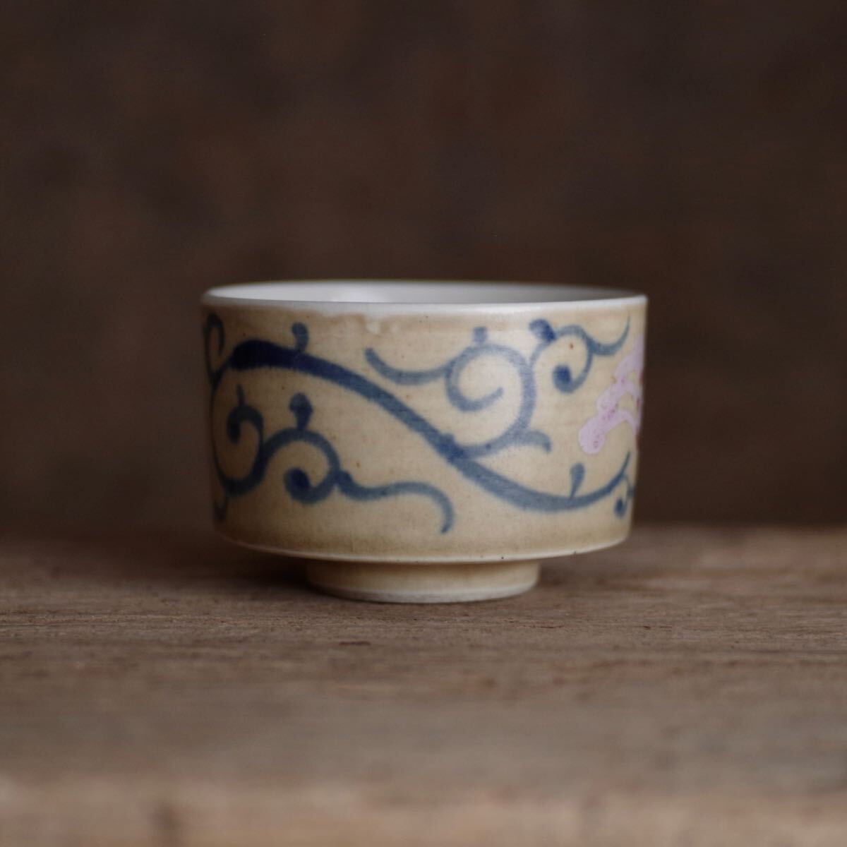 当方は初見の、京焼あるいは信楽あたりのものと思われる、上絵半筒猪口でございます。はっきりとした産地や時代の特定は難しいものの、いわゆる「京阿蘭陀風」とも呼びたくなるような異国趣味の漂う佇まいで、大変興味深い一品です。赤絵が飛んで残ったような桃色の発色や、素地の温かみある色合いが可愛らしく、どことなく無国籍な雰囲気を感じさせます。