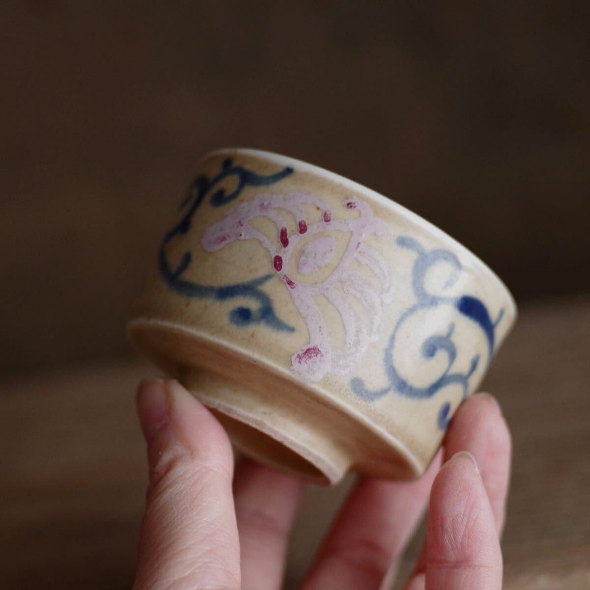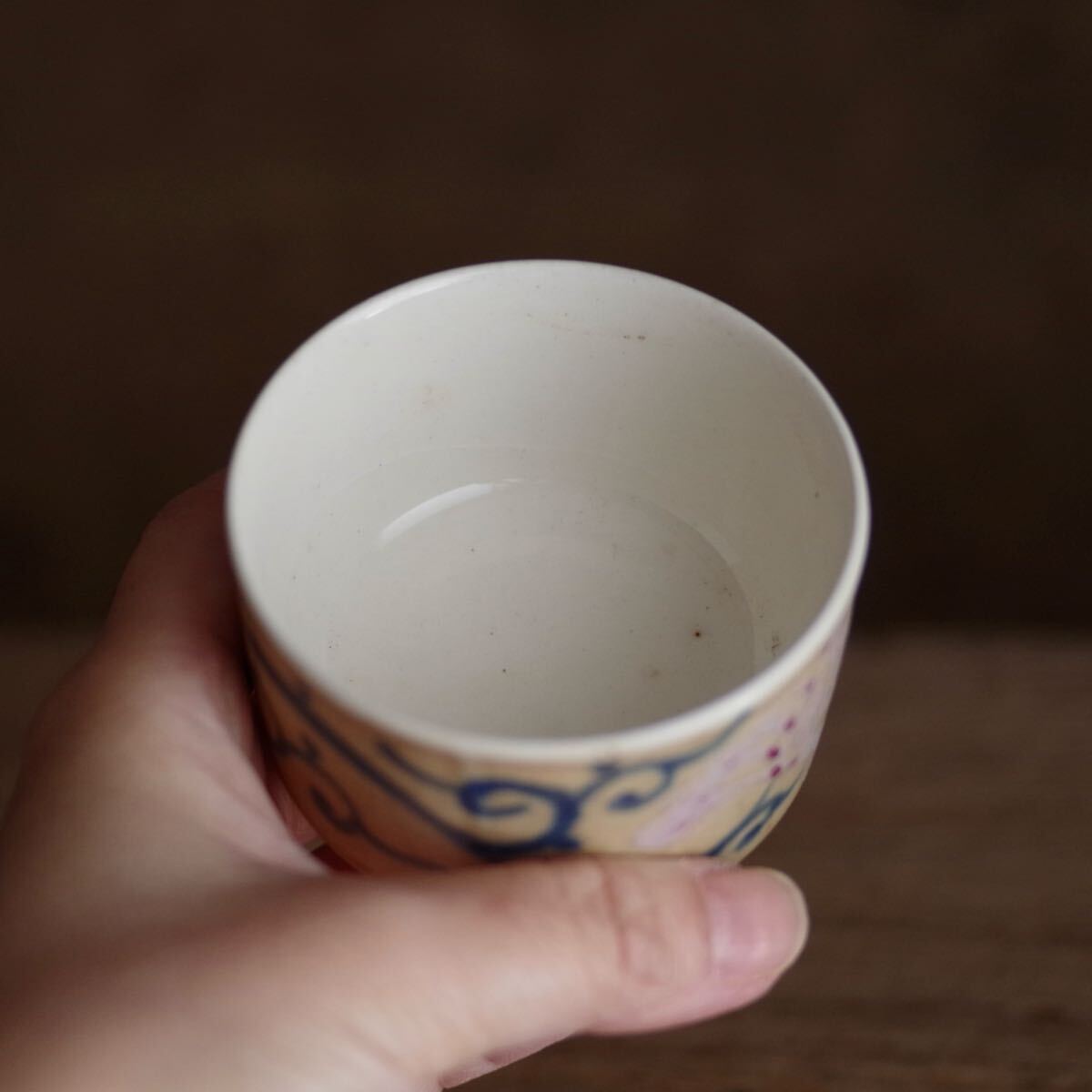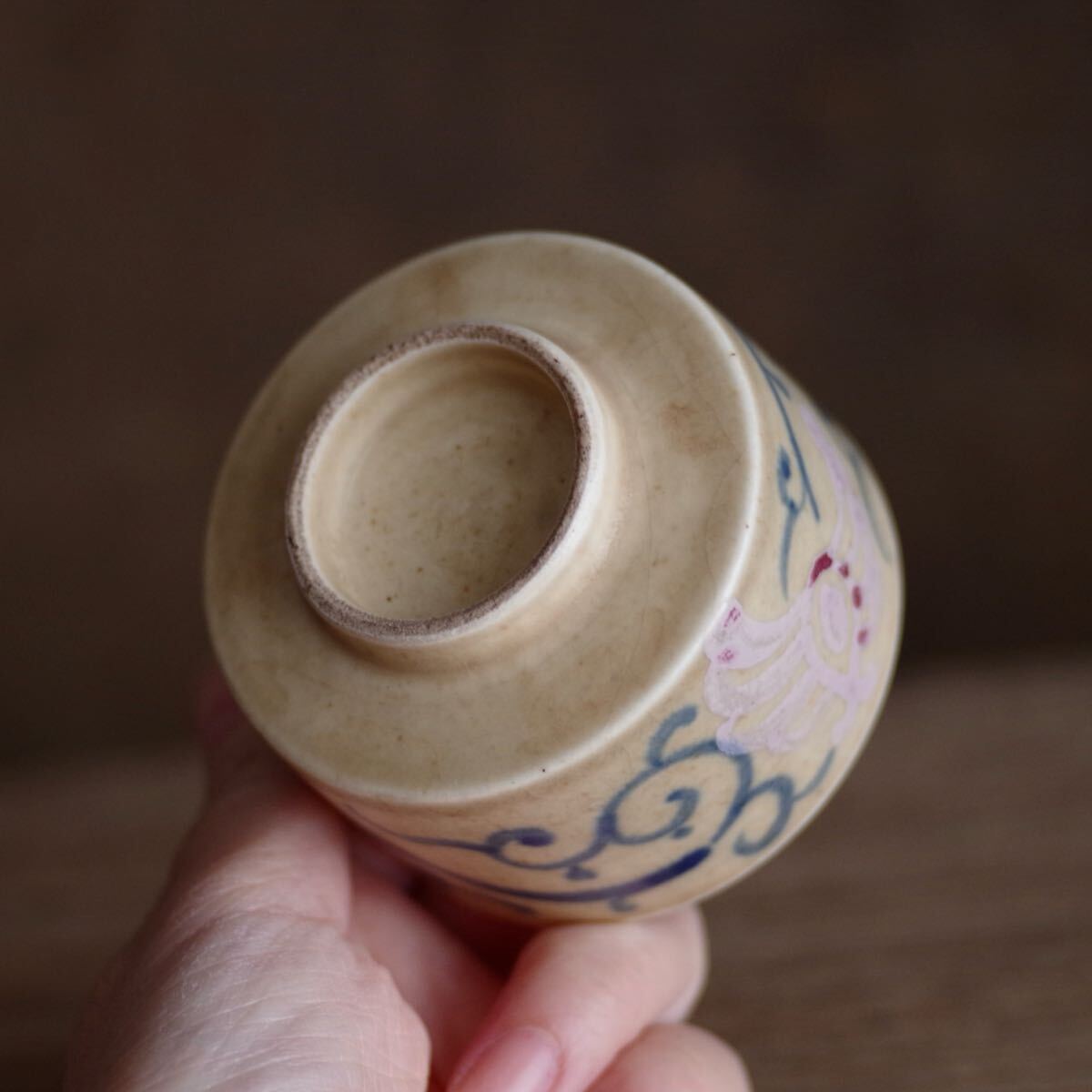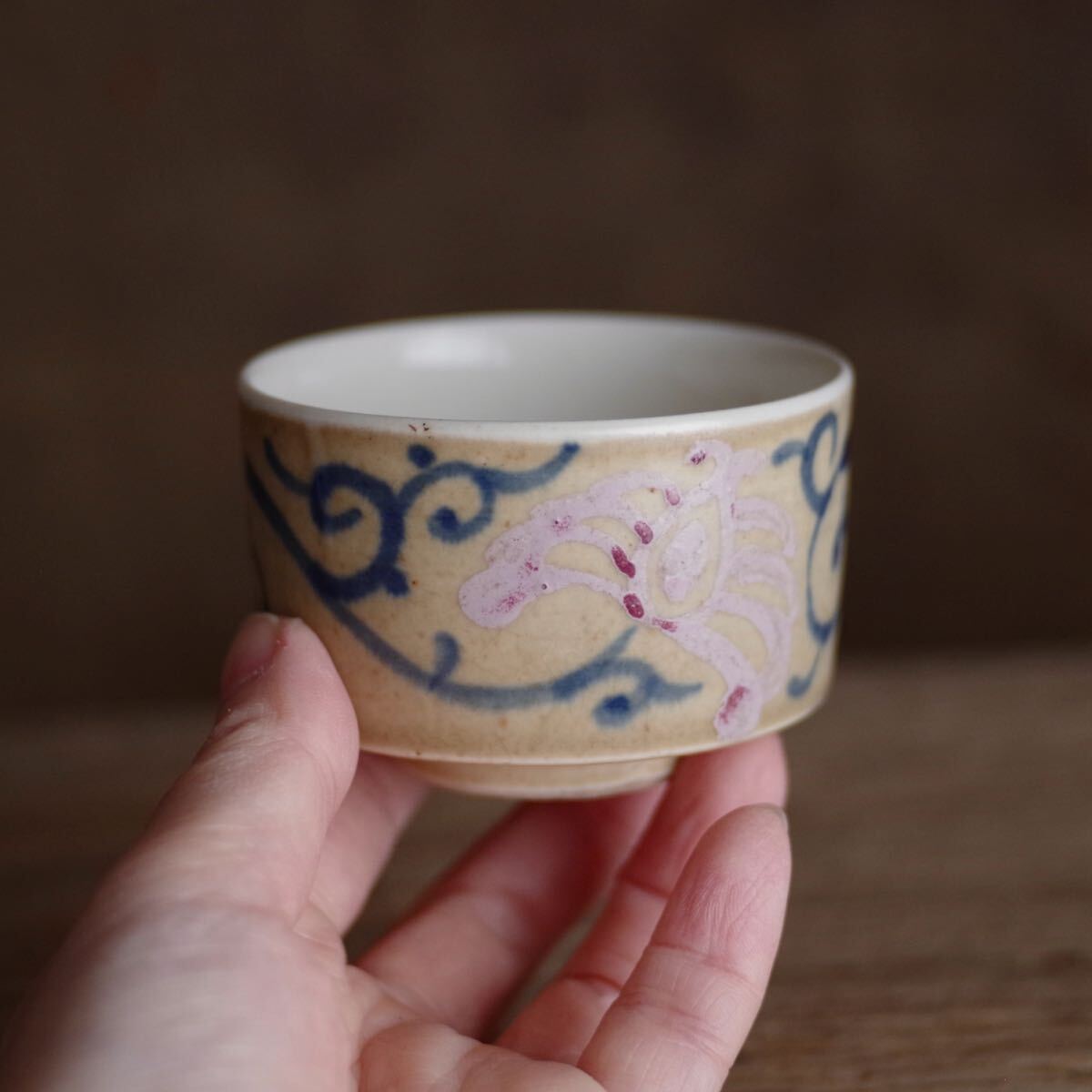 当方は初見の、京焼あるいは信楽あたりのものと思われる、上絵半筒猪口でございます。はっきりとした産地や時代の特定は難しいものの、いわゆる「京阿蘭陀風」とも呼びたくなるような異国趣味の漂う佇まいで、大変興味深い一品です。赤絵が飛んで残ったような桃色の発色や、素地の温かみある色合いが可愛らしく、どことなく無国籍な雰囲気を感じさせます。
