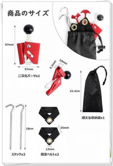 【豊富な付属品】 二又化金具X1、固定ベルトX2、ステークX2、 収納バッグ×1。 ペクが含まれているので、硬い地面、砂利や石などが混じった場所でも、キャンプサイトのデッッキでもご利用いただけます。