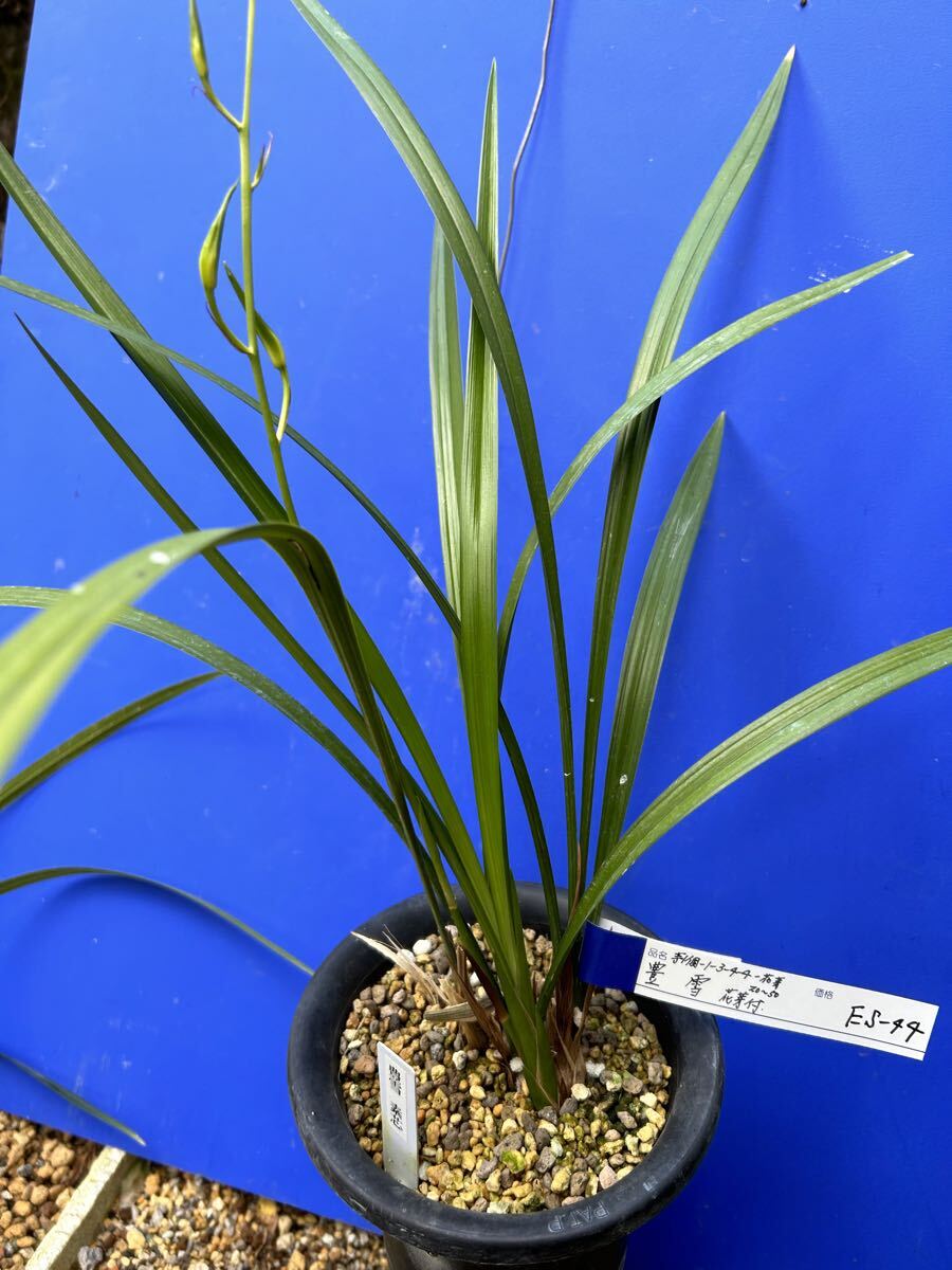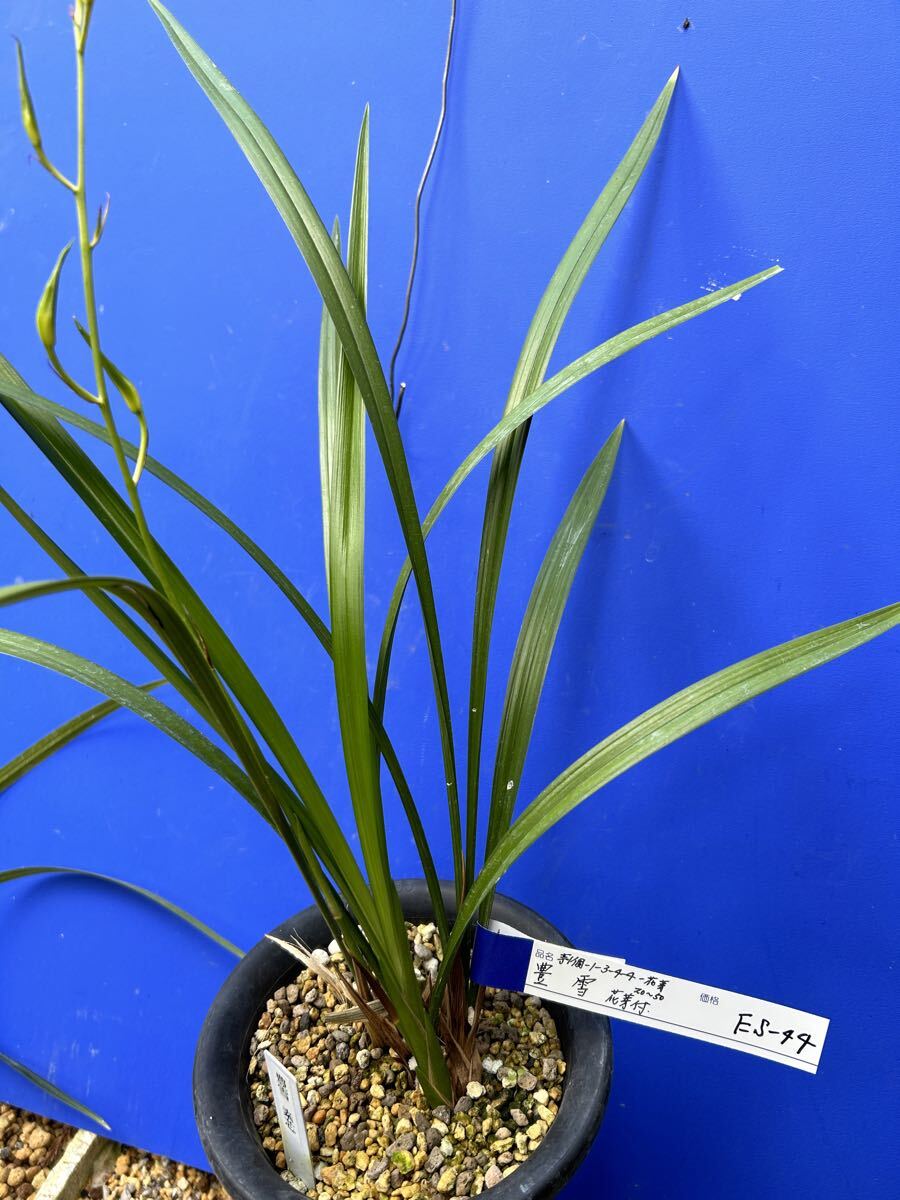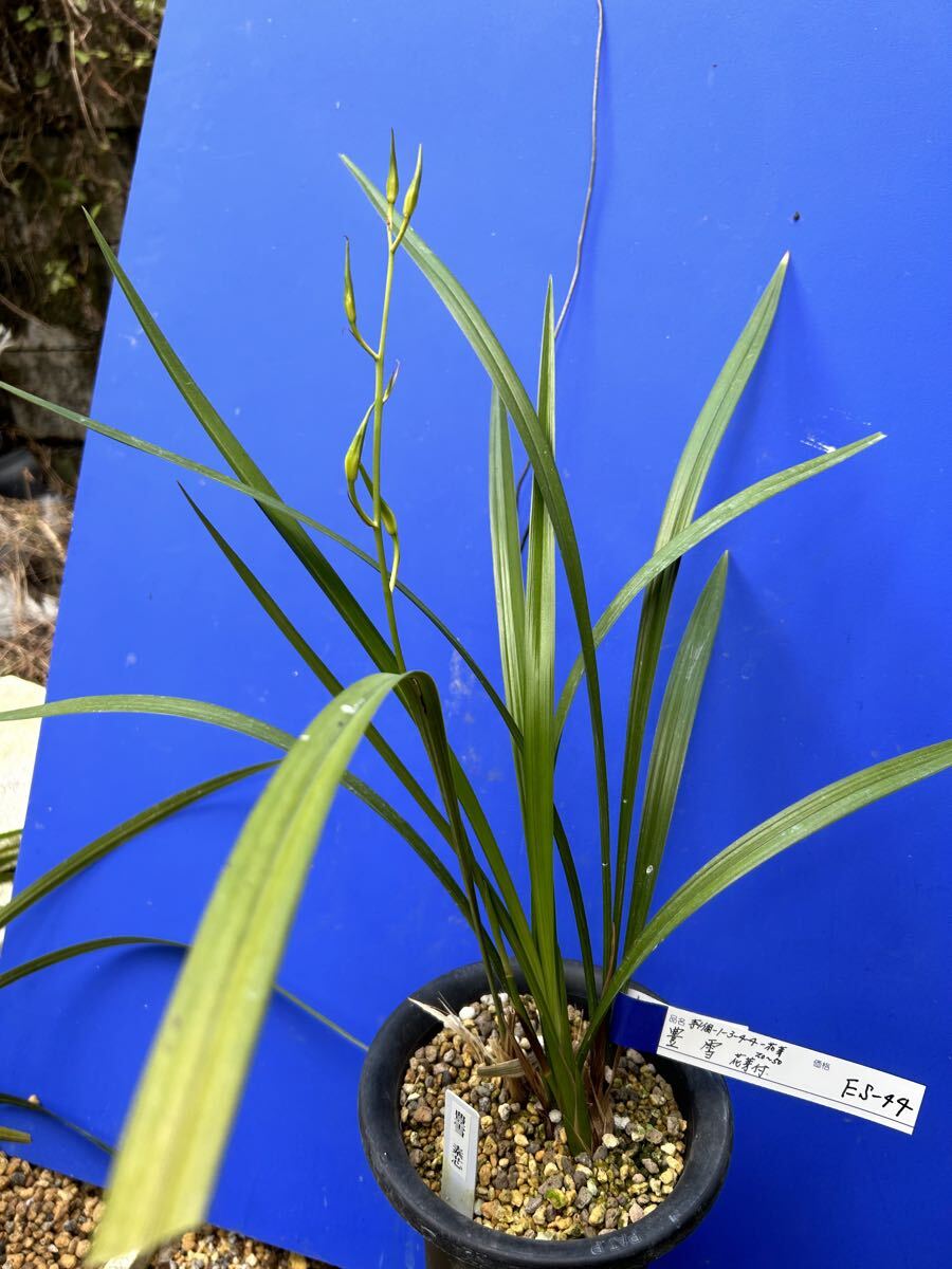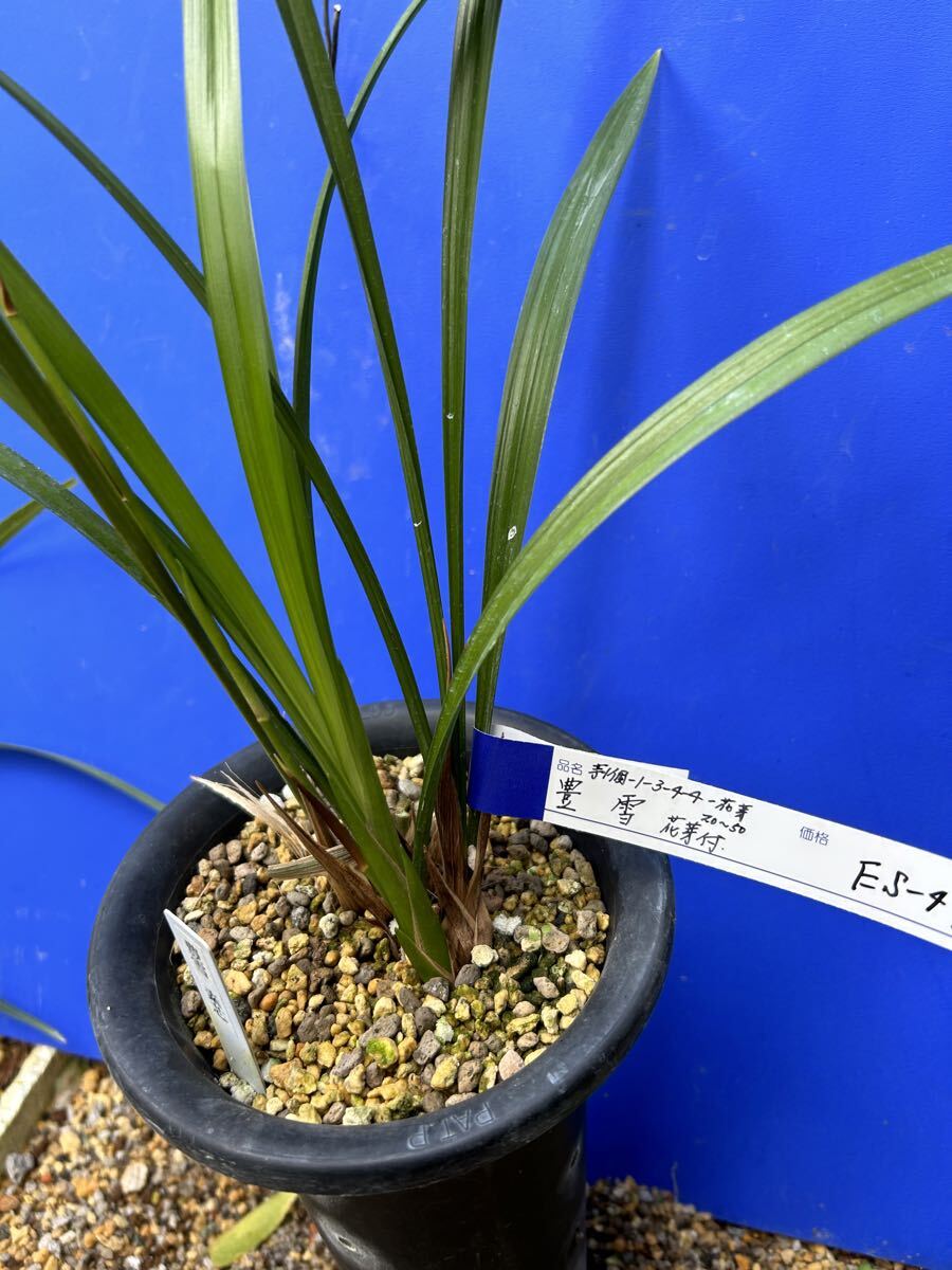 栽培増植品、土佐寒蘭、登録品、豊雪、花芽付き、E Sー 4 4、は、高知県産の白花素心の登録品で有名品なので詳細は省きます。苗サイズは芋 I個に、2 0〜5 0センチくらいの、 Iー 3ー 4ー 4の 4条立てで今年の新芽が 4枚葉で花芽付きです。根は保証します。水苔に包んで発送します。