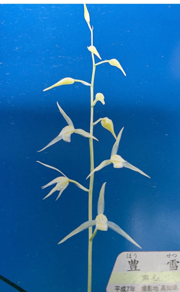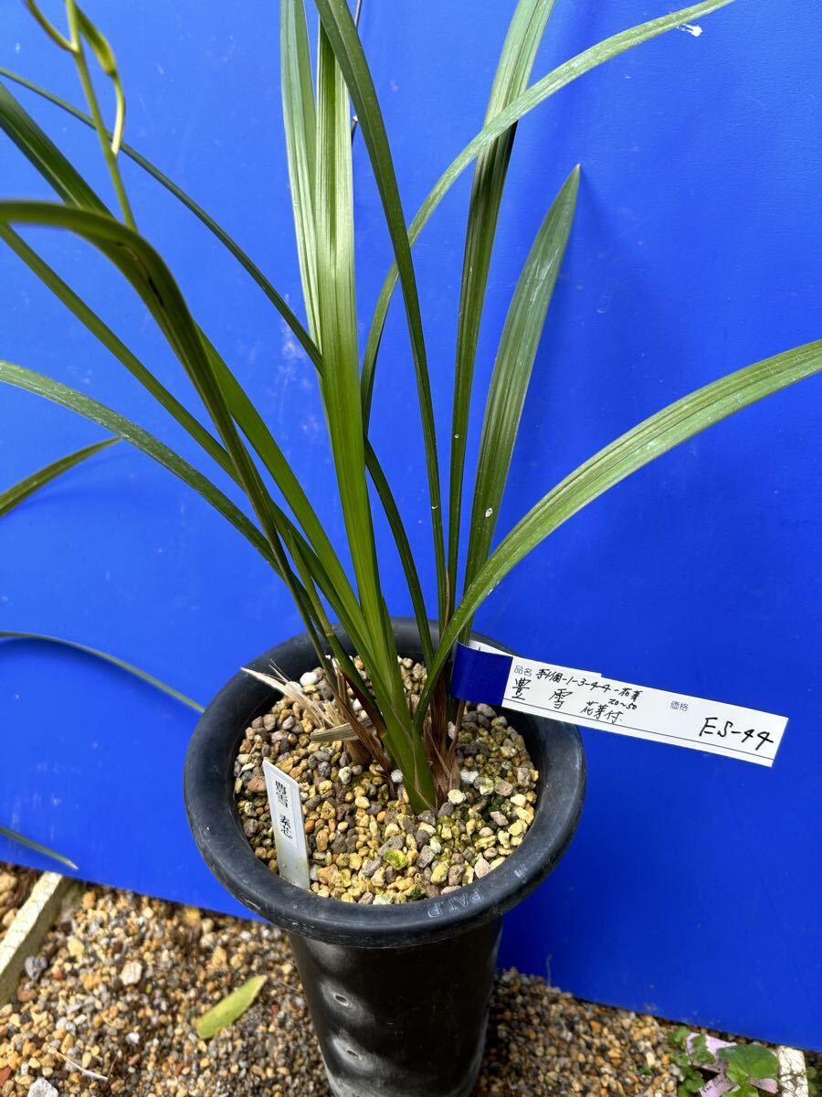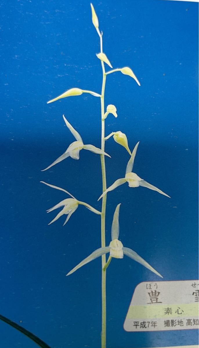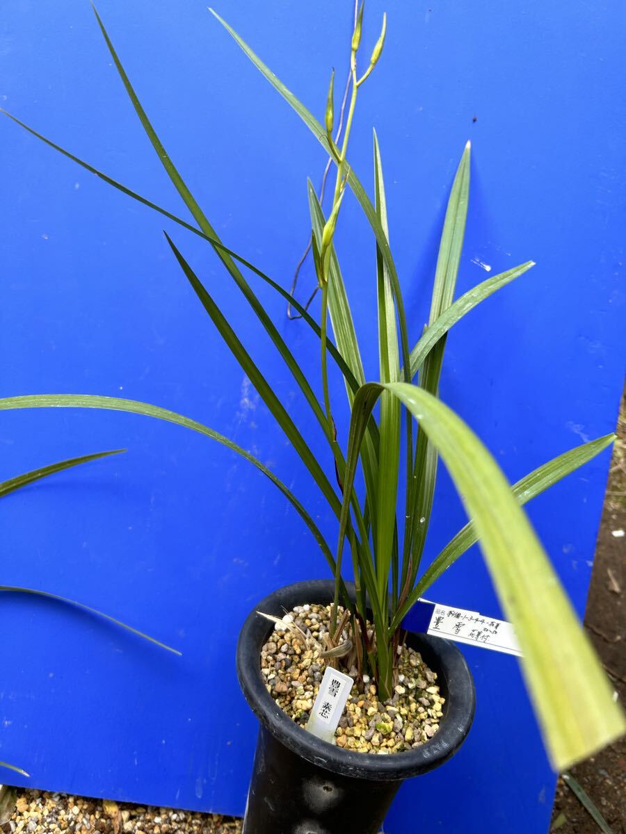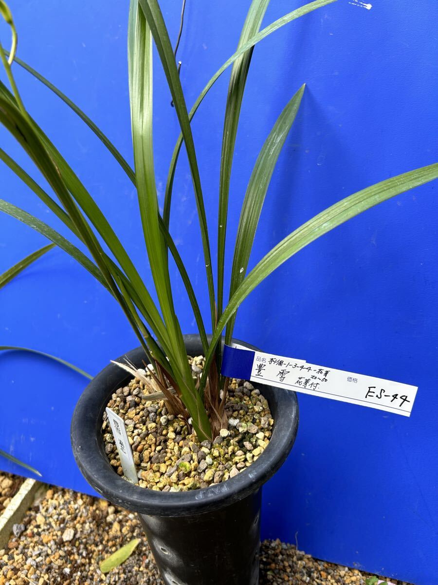 栽培増植品、土佐寒蘭、登録品、豊雪、花芽付き、E Sー 4 4、は、高知県産の白花素心の登録品で有名品なので詳細は省きます。苗サイズは芋 I個に、2 0〜5 0センチくらいの、 Iー 3ー 4ー 4の 4条立てで今年の新芽が 4枚葉で花芽付きです。根は保証します。水苔に包んで発送します。