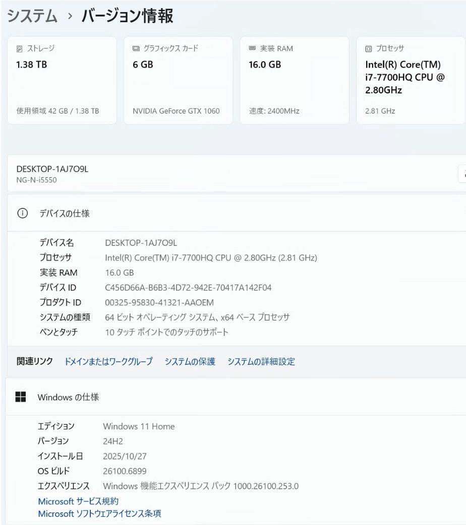 ・ GPU:     NVIDIA GeForce GTX 1060(搭載ビデオメモリ 6GB )