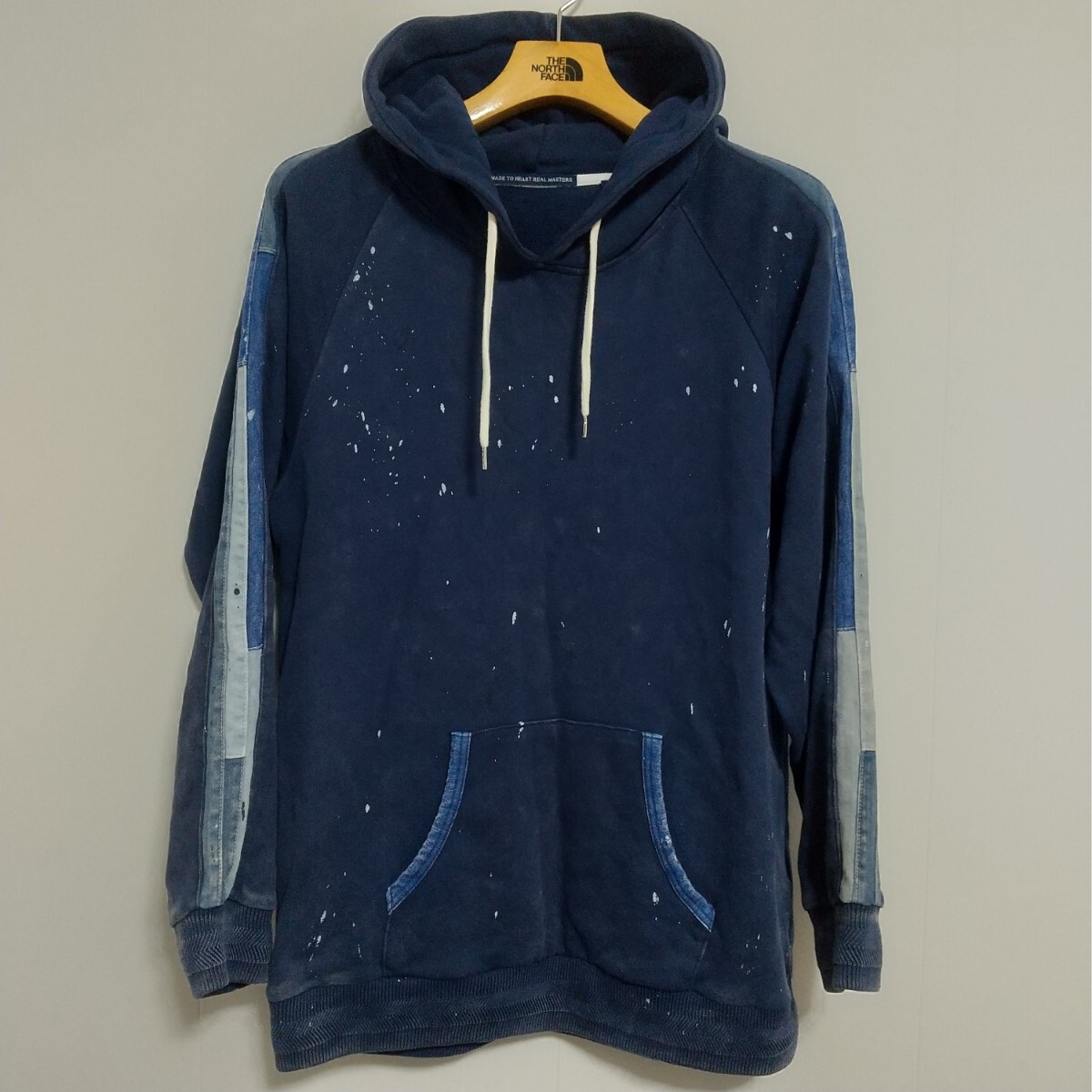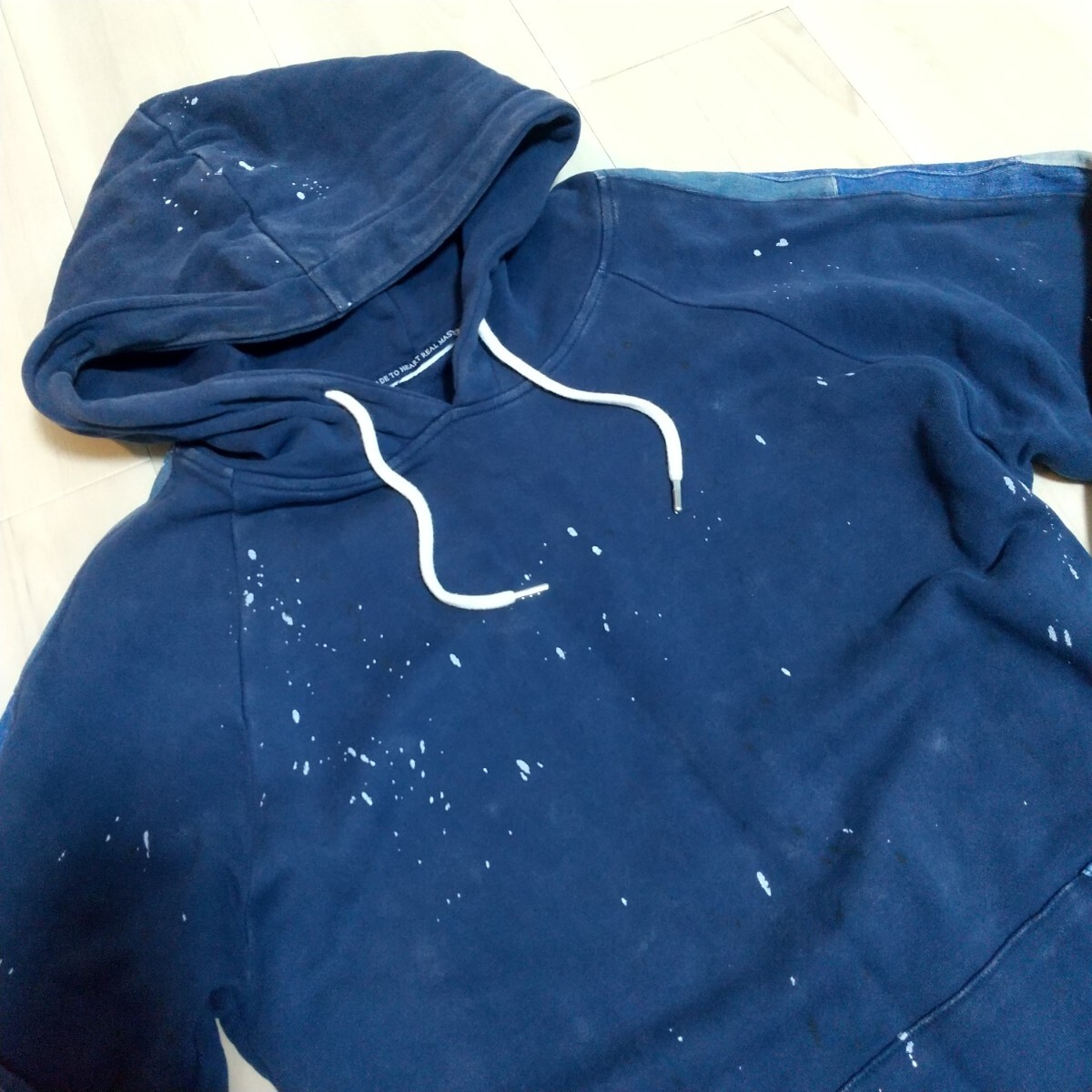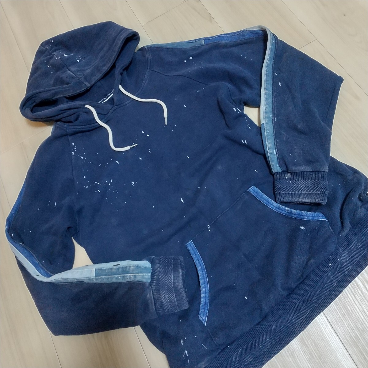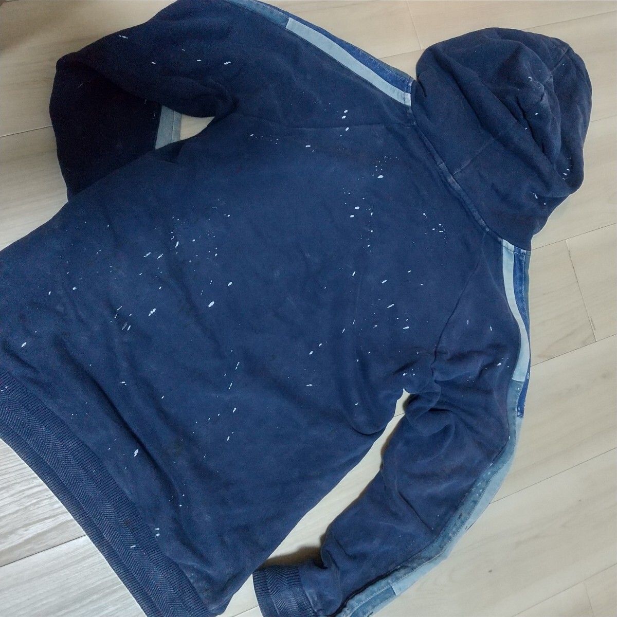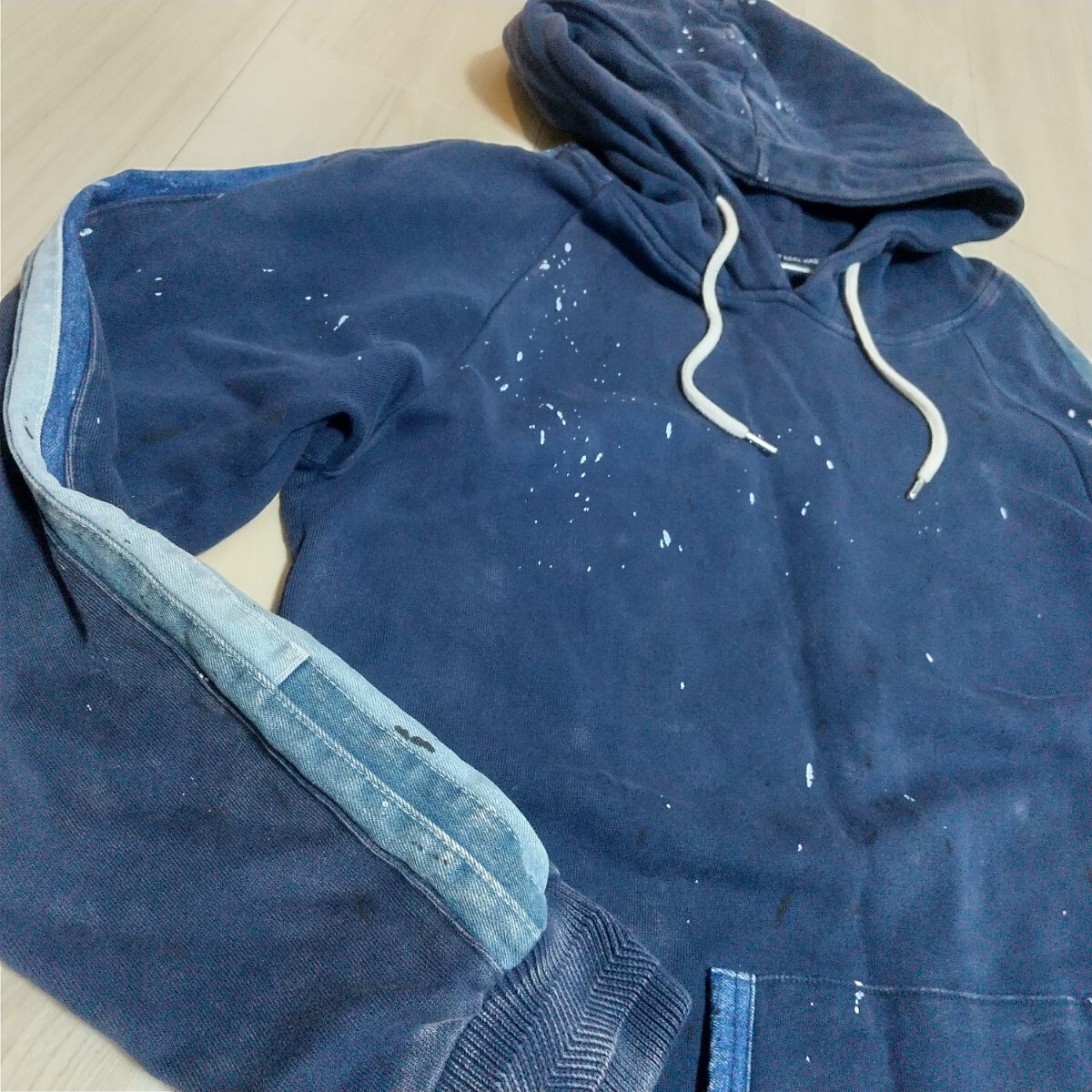 【商品説明】ネイビーボディにデニム切替、全体にペイント飛ばし加工が入ったデザイン性の高い一着です。インディゴ製品染めのため、ユーズド風の色落ちも雰囲気があります。
