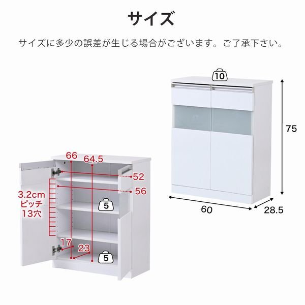 【カラー】 ホワイト 【サイズ】 <外寸> 幅60×奥行28.5×高さ75 <内寸> 扉内:幅52(最大56)×奥行17(最大23)×高さ64.5(最大66)cm 可動棚:幅56×奥行22.5×厚み1.8cm(3.2cmピッチ13穴) 【材質】 本体:プリント紙化粧合板 天板・前板:合成樹脂化粧繊維板(PVC) 【耐荷重】 天板:(約)10kg以下 可動棚:(約)5kg以下 固定棚:(約)5kg以下 【生産国】 中国 【梱包】 サイズ:80.3×34×19cm、重量:17.6kg 【その他】 ・背面化粧あり ・可動棚3枚 ・前板鏡面仕上げ 【組み立て品】 お客様による組み立てが必要です。 【ご注意】 ・サイズ、重量は概算です。 ・商品カラーはご使用のモニターによって実際の明るさや色と異なって見える場合がございます。 |