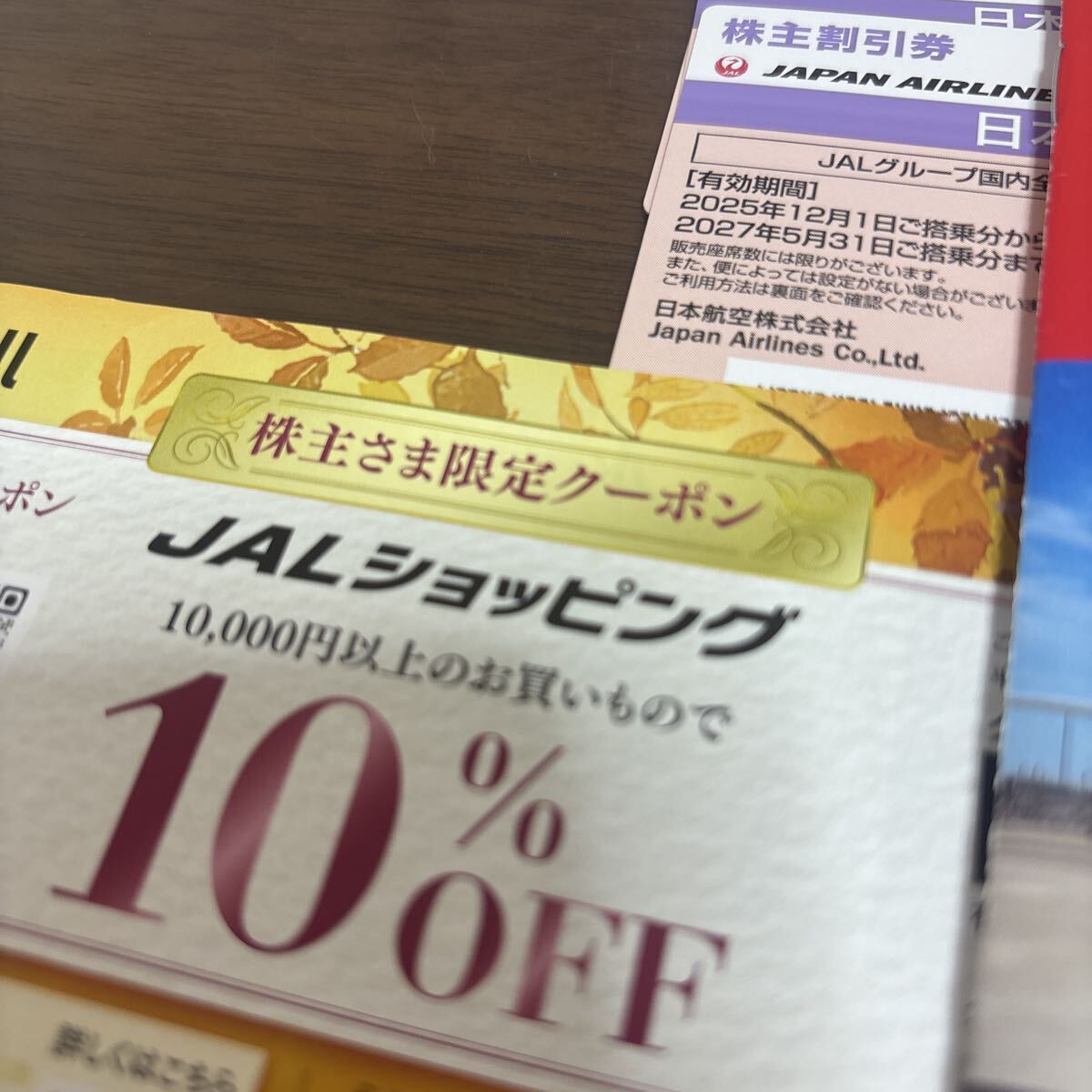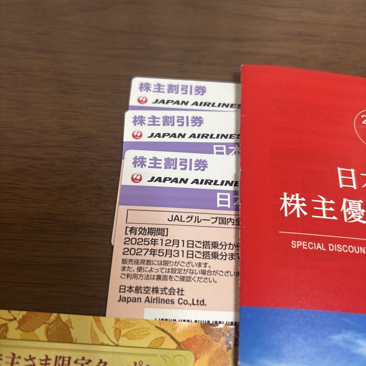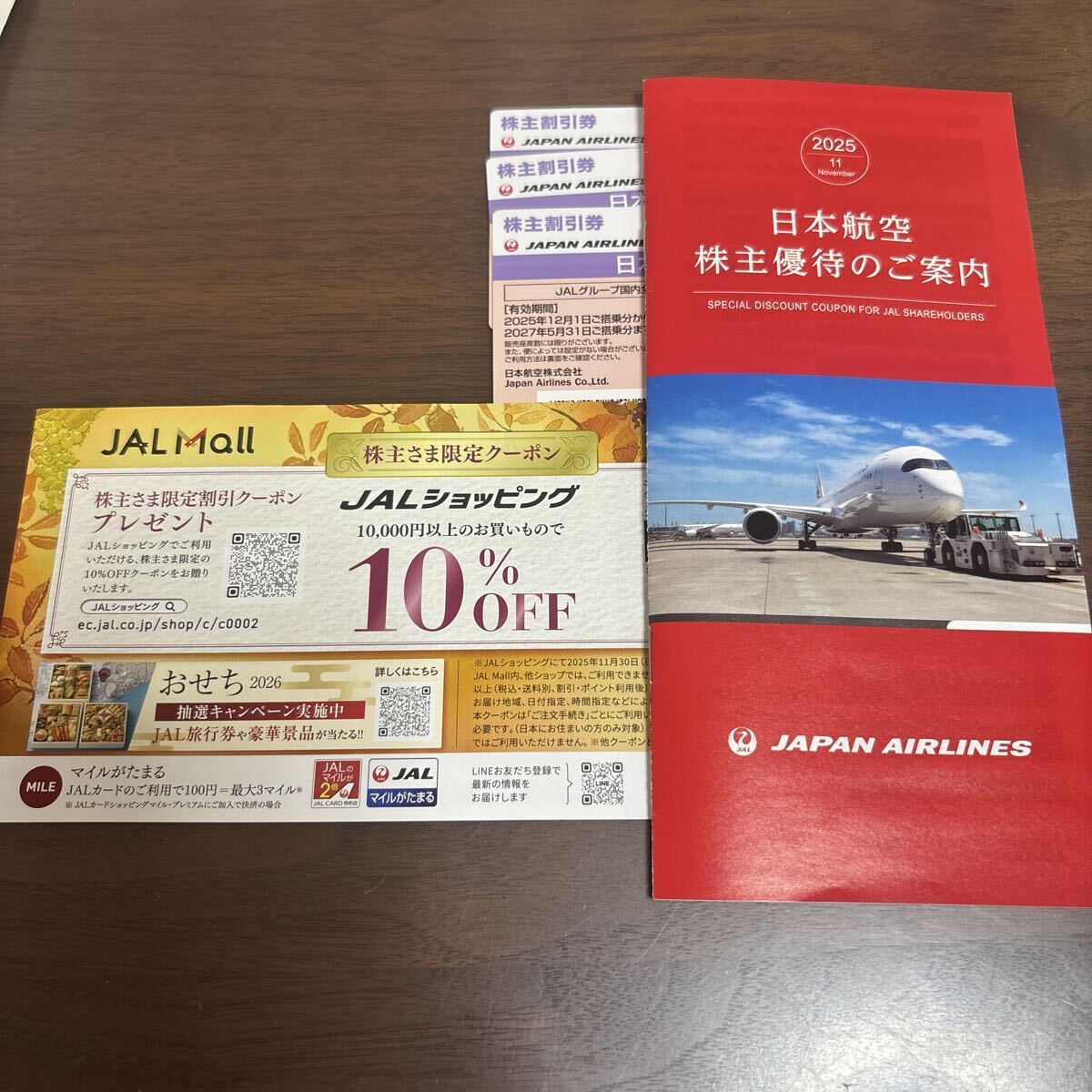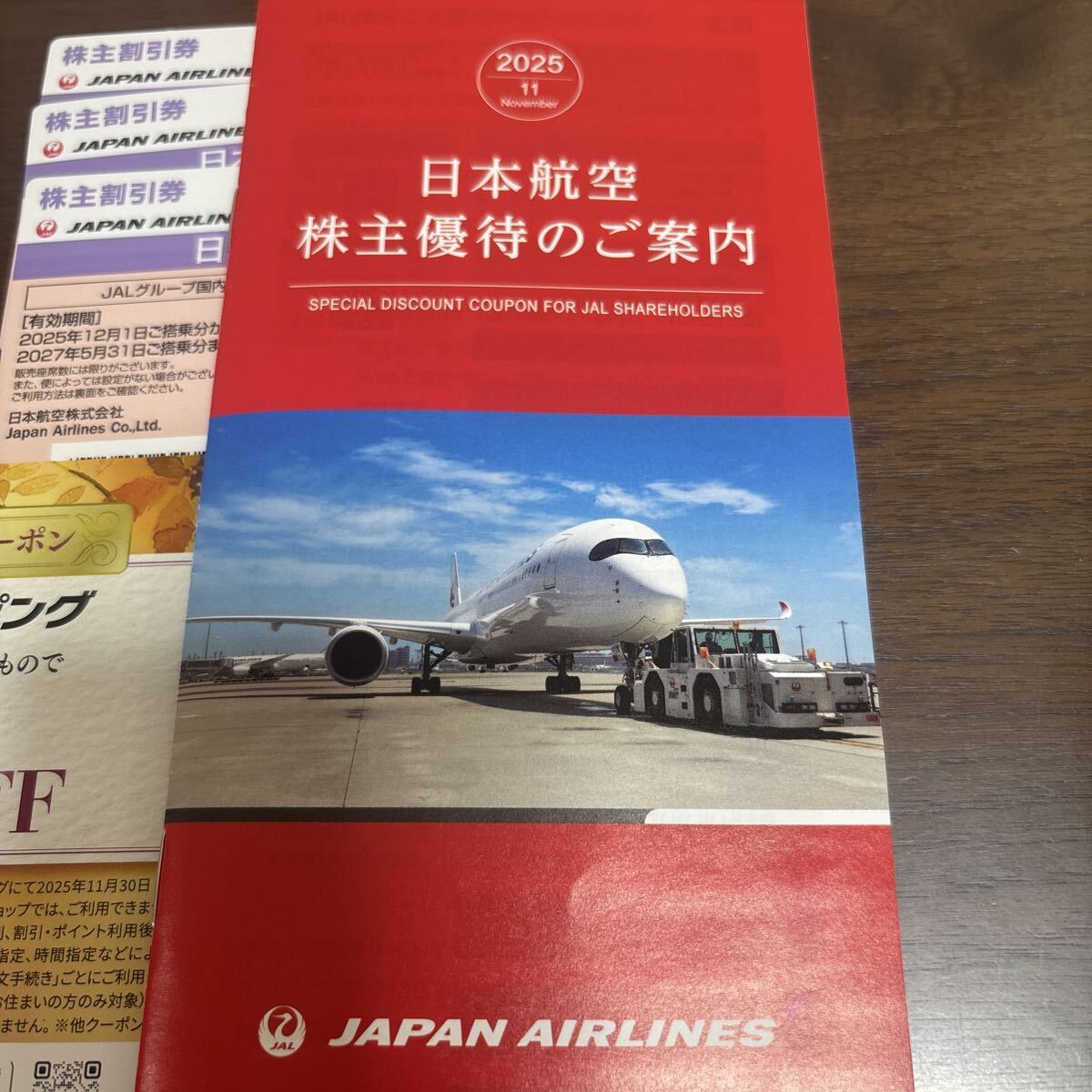 最新の日本航空 JAL株主優待券を3枚と、株主優待のご案内(冊子)1冊と、JALショッピング割引クーポン1枚のセットです