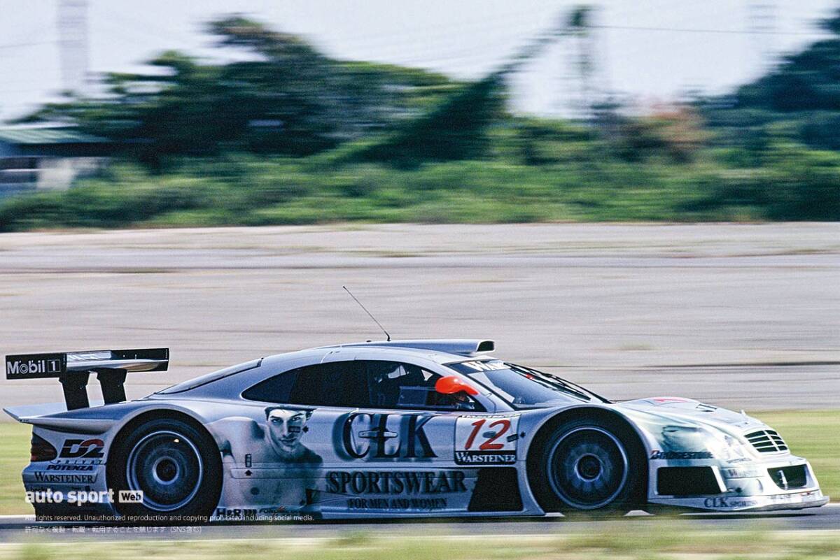 1997年から始まったFIA選手権のために、AMGメルセデスが超速の128日で造り上げたモンスターマシン、”AMGメルセデスCLK-GTR”。そのマシンが鈴鹿1000km耐久レースを走り、ポールポジションを獲得した。男女のモデルが大きく配されたCLKスポーツウェアのカラーリングデザインは、徹底してそのアピアランスにこだわるメルセデスらしいですね。