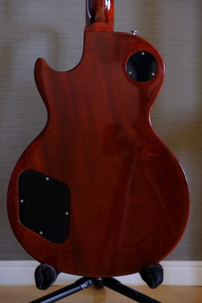 塗装はオールラッカーフィニッシュを採用しており、トップはチェリーから自然にフェイドしたライトバースト、バックはマホガニーの色を活かしつつ、鮮やかなチェリー塗装となっています。