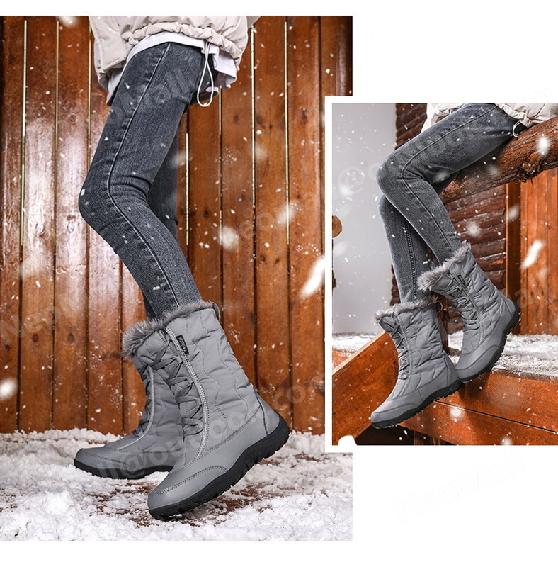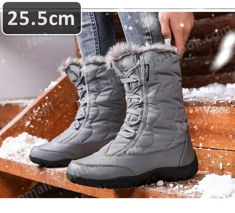 レディース スノーシューズ 【970】 グレー 25.5cm ムートンブーツ スニーカー ウィンターブーツ 裏起毛 防水 防寒 防滑 冬用靴 綿靴