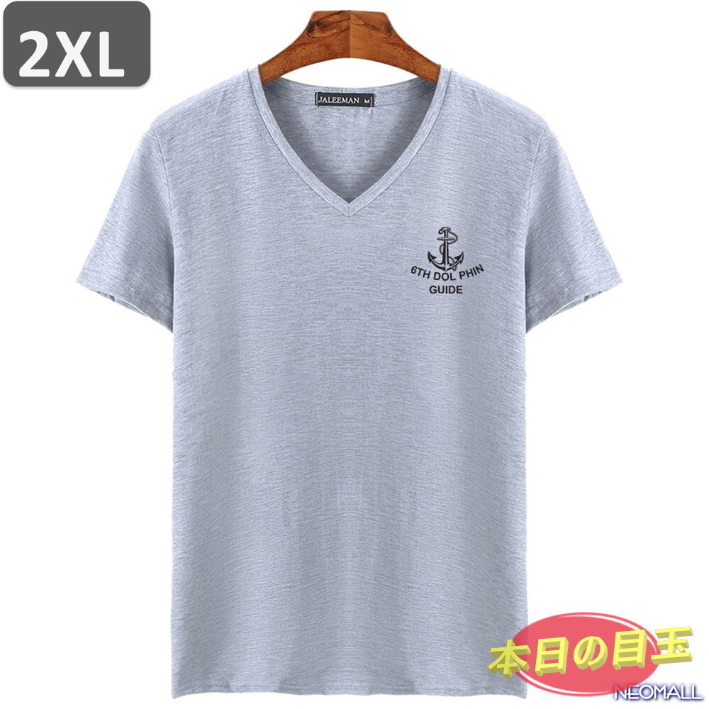 本日のお買得 ☆ Vネック 半袖 Tシャツ【454】 グレー 2XLサイズ トップス シャツ シンプル イラスト デザイン 春夏