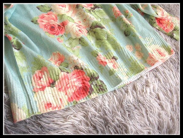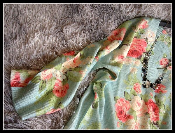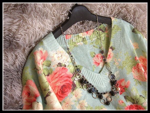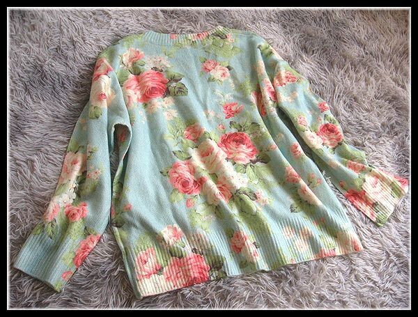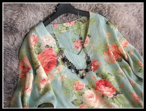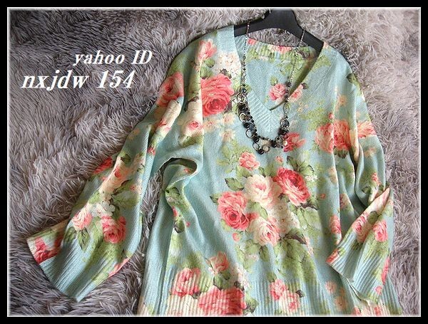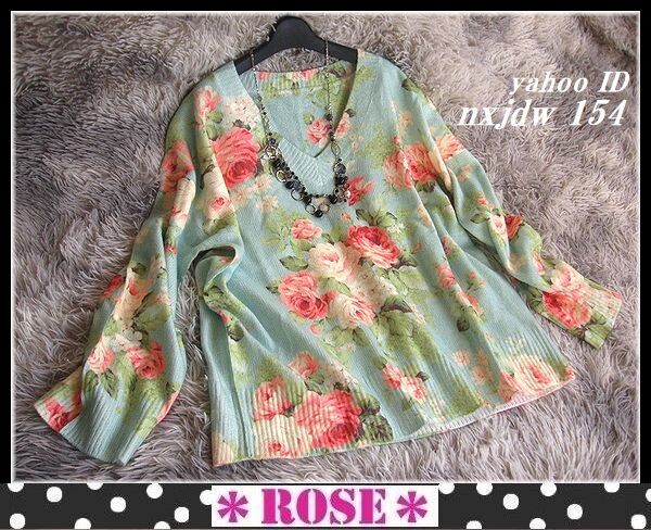 ◆Rose◇ゆったりワンサイズ・満開のオールドローズ♪印象パステルが素敵なVネックニット/ミント系