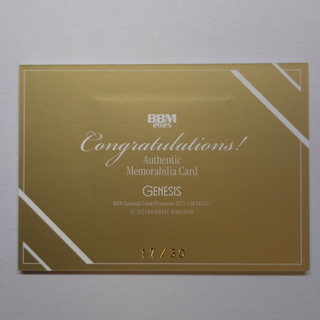 BBM 2025 ジェネシスベースボールカードプレミアム GENESIS 度会隆輝 横浜DeNAベイスターズ ビジタージャージ ビッグパッチ 17/30となります。